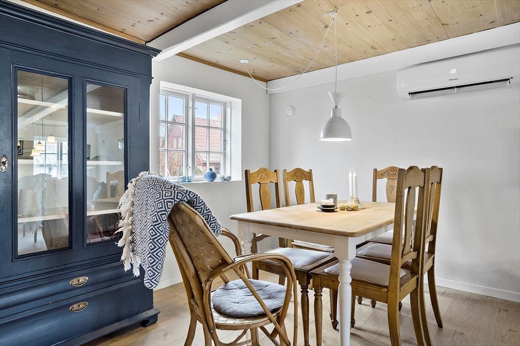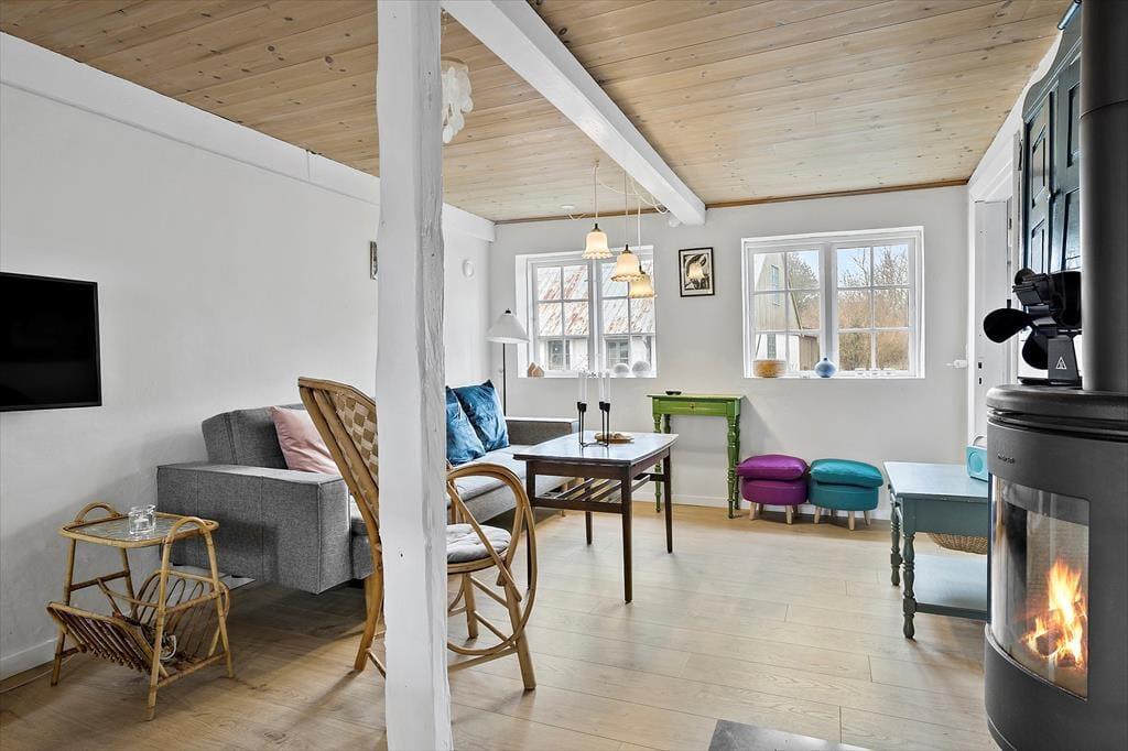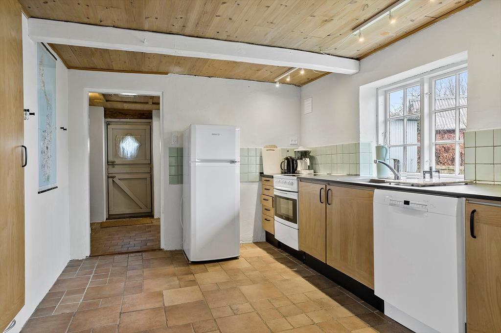 Når man først træder ind i entreen, er her flisegulv og god plads til overtøj. Herfra er der adgang til et rummeligt køkken alrum med synlige loftbjælker og en centralt placeret brændeovn. I det åbne køkken er der masser af bordplads, opvaskemaskine og stort køleskab med fryser. Alrummet indeholder spiseafdeling med en fin gammel bænk og kig til baghaven, og i direkte forbindelse er der en hyggelig sofa hyggekrog med væghængt tv med Chromecast. Her er det altså muligt at se eget indhold via mobil eller tablet og husets WiFi, Dette er husets absolutte samlingsrum, hvor man kan være sammen om madlavning og afslapning.