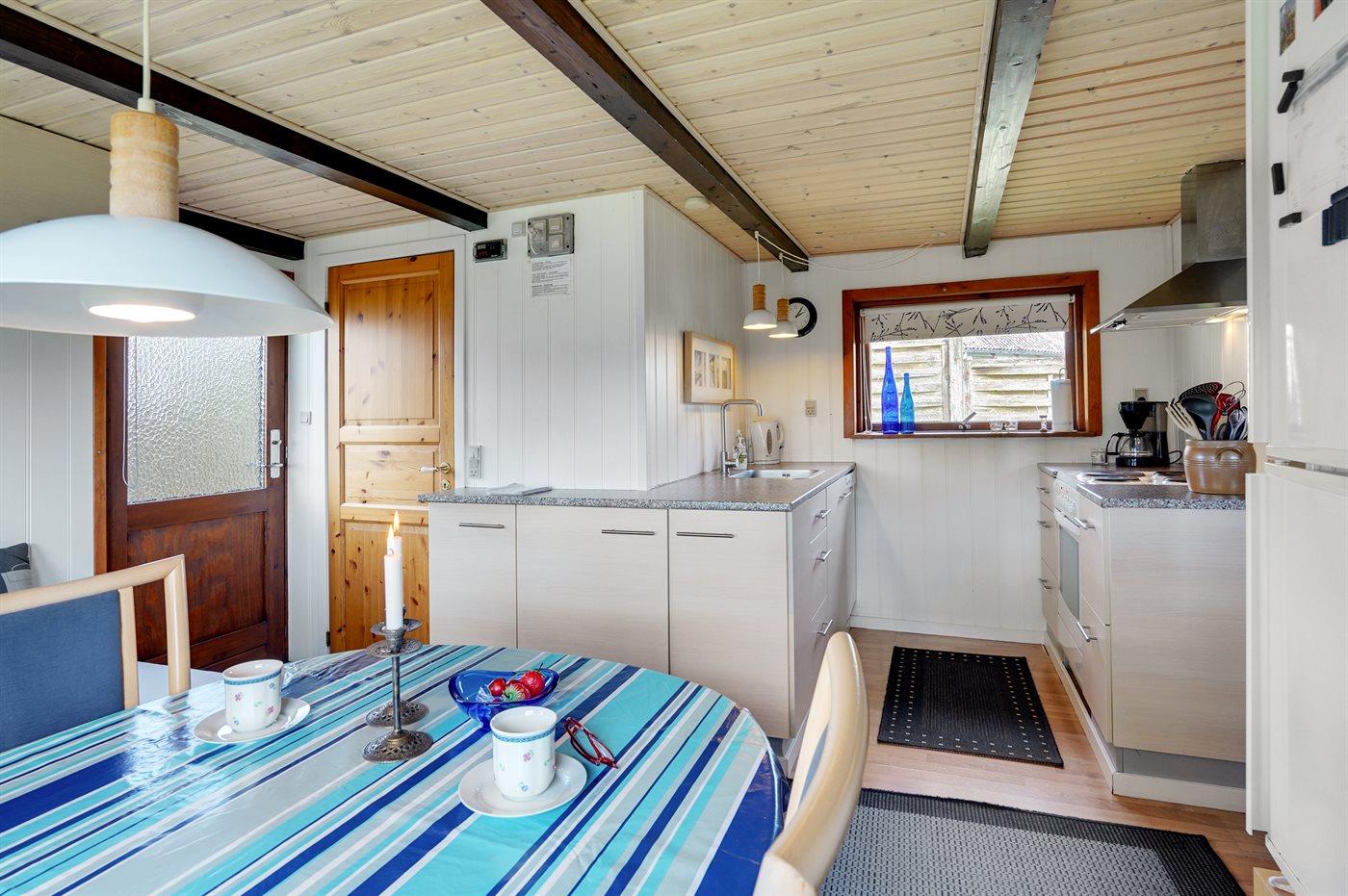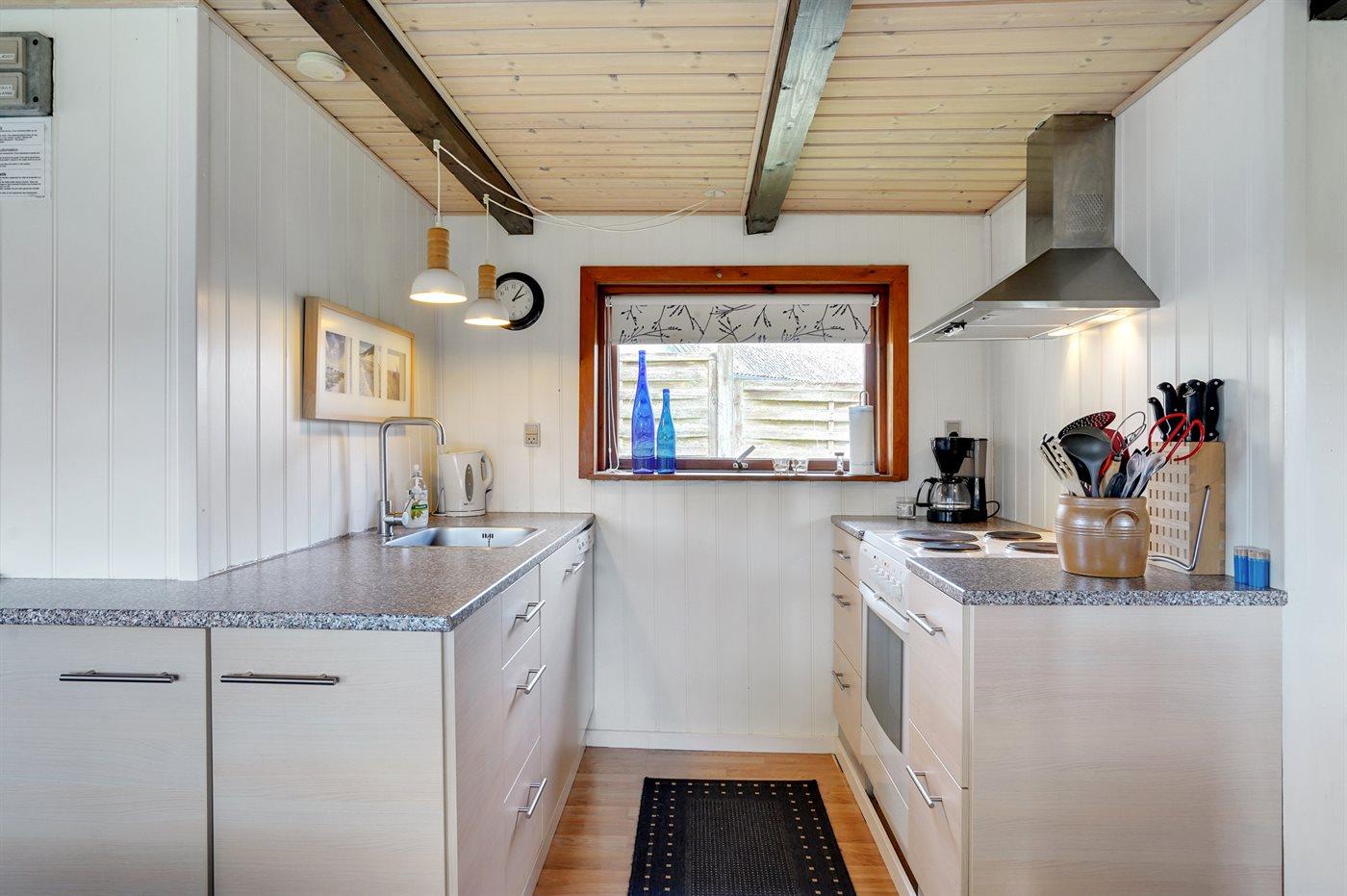 Køkkenet er udstyret med 1 køleskab. Der er 4 elkogeplader, bageovn samt opvaskemaskine.