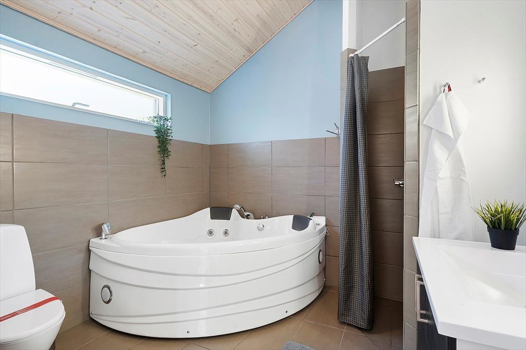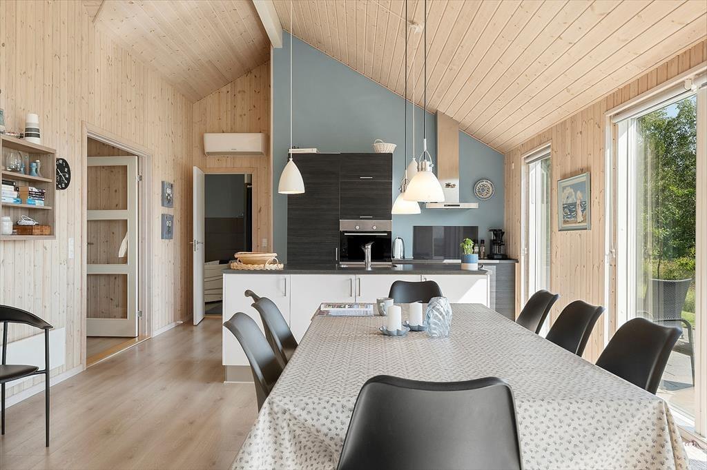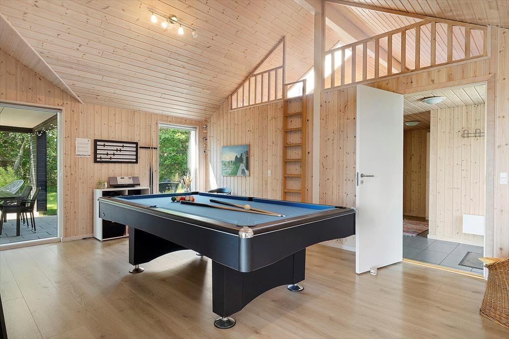 Masser af plads og aktiviteter må være beskrivende for indretningen. Der er 3 gode soveværelser med enkeltsenge (skubbet sammen til dobbeltsenge) samt stor hems med 4 madrasser til familiens yngste, 2 rummelige og flotte badeværelser hvor der i det ene er adgang til skøn spa og sauna, der er et aktivitetsrum med dart og poolbord, som kan omdannes til bordtennisbord. Det store køkken-alrum-stue byder på kvalitetsindretning og et fantastisk lysindfald - og naturligvis masser af plads. Der er over alt kælet for detaljen og alt det akkompagneret af den mest betagende udsigt over Kattegat.