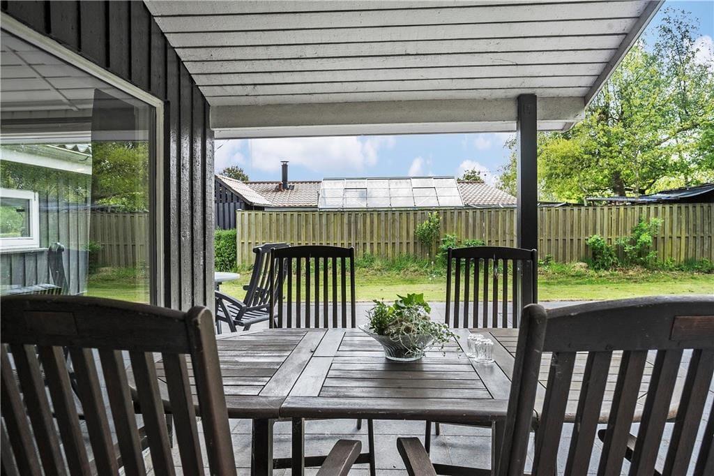 Sommerhuset ligger på en dejlig havegrund omgivet af høje træer på tre sider. Der er plads til leg og boldspil på græsplænen, og fliseterrassen løber rundt om hele huset. På bagsiden kan man sidde helt i fred og ro og nyde sommeren og solen, mens den overdækkede del er ideel til aftenhygge med en kop kaffe eller et godt glas vin.