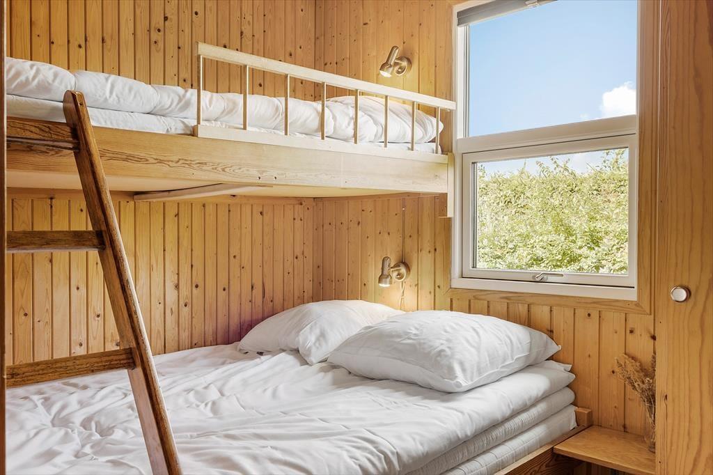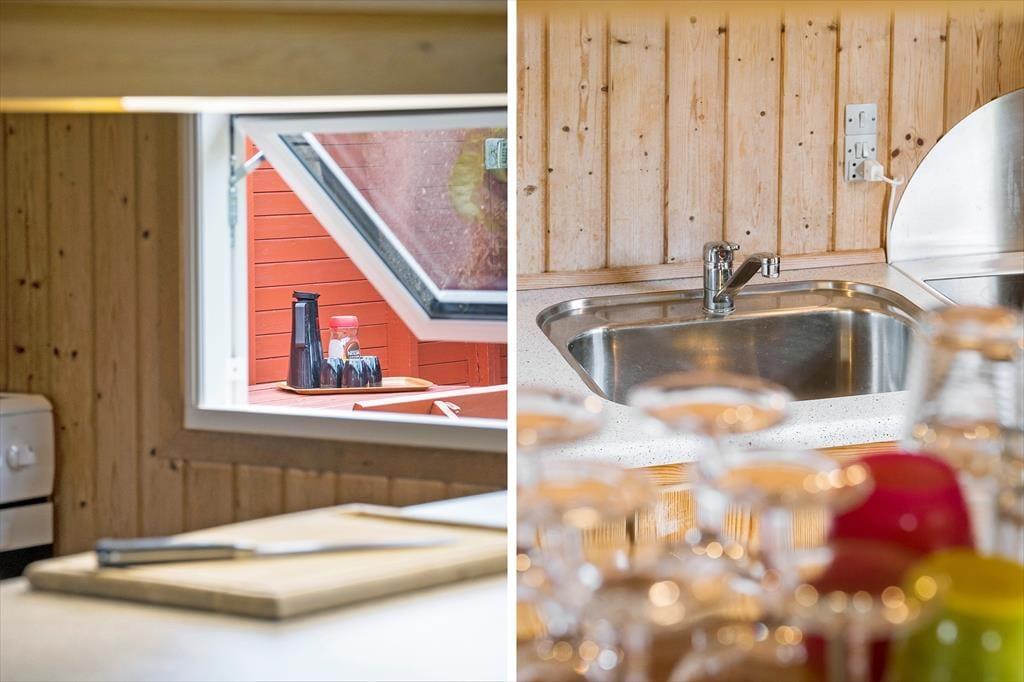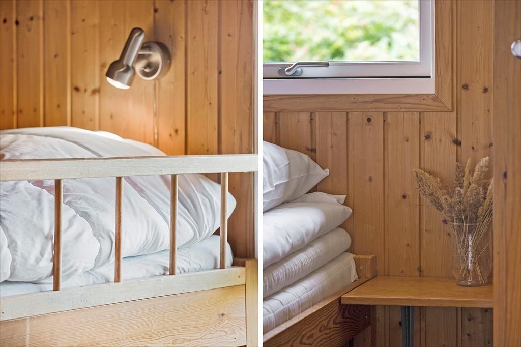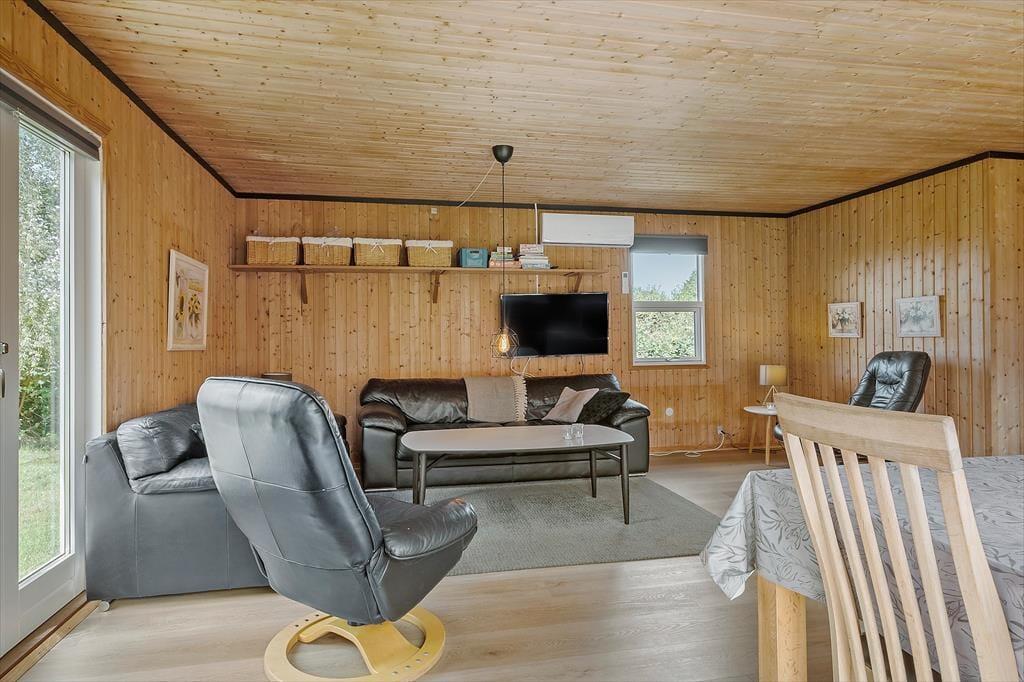 Atmosfæren er varm og venlig inden døre i det rødmalede træhus, der er opført i 1973. Gennem årene er det blevet pænt vedligeholdt, og der er også kommet flere moderne bekvemmeligheder til – inklusiv opvaskemaskine i det åbne køkken samt varmepumpe og fladskærms-TV i stuen. På klassisk sommerhusmanér er der for øvrigt brændeovn her i opholdsrummet, så når I spiller Yatzy ved spisebordet eller læser i sofaen, kan det foregå nær den hyggespredende varmekilde. Er det ved at være sengetid, kan I trække jer tilbage på husets tre soveværelser, der i alt kan rumme syv personer. Og efter en god nats søvn er det rart at blive frisket op med et morgenbrusebad på badeværelset, mens dagen langsomt begynder.