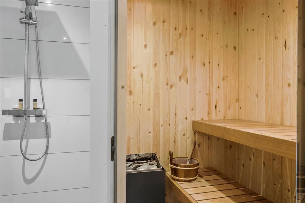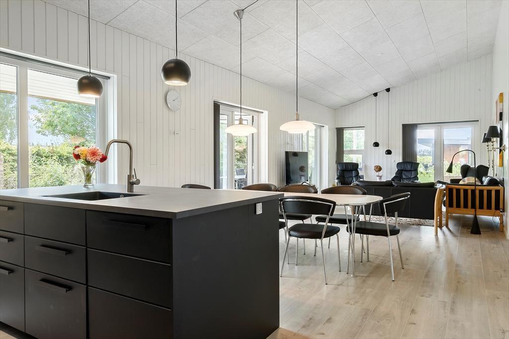 Med sin mørke facade og flotte træterrasse kan man straks fra ankomsten se, at der er tale om et hus af høj kvalitet. Det kan bestemt også fornemmes inden døre i de pæne og velindrettede rum – blandt andet i det store opholdsrum, der byder på stue og køkken i åben forbindelse. Trænger I til at slappe af, er det største af de to badeværelse på lækker vis udstyret med spabad og sauna, og skal der være mere gang i den, kan I spille airhockey og dart i aktivitetsrummet. Her står der for øvrigt en dobbelt sovesofa, der ved nattetid fungerer som et godt supplement til de fire soveværelsers komfortable senge.