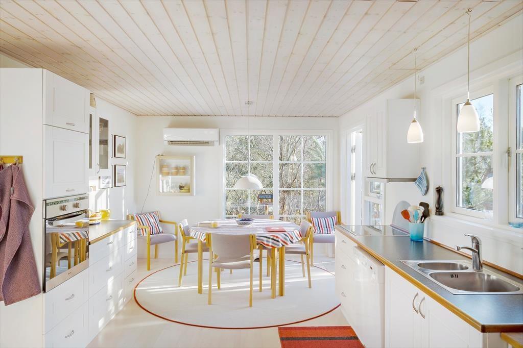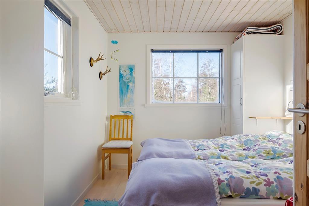 Det 158 m2 store sommerhus knejser på en kuperet naturgrund, og det hæver sig i to indbydende etager. Øverst ligger en skøn udsigtsstue, hvor I kan slappe af nær brændeovnen med en spændende bog eller en film på fladskærms-tv’et. I stueplan har I også god plads til afslapning og socialt samvær i køkken-alrummet og den tilstødende spisestue. Begge rum er indbydende, men har en vidt forskellig atmosfære, for mens køkken-alrummet er lyst og moderne indrettet, har spisestuen træbeklædte vægge og møblement, der minder om, at husets historie går helt tilbage til 1926. Stueplan består for øvrigt af et pænt badeværelse og tre gode soveværelser, så huset egner sig godt til seks personer.