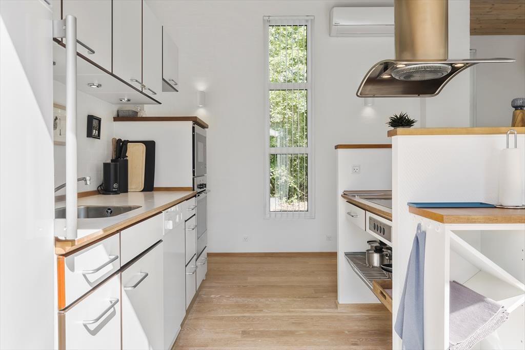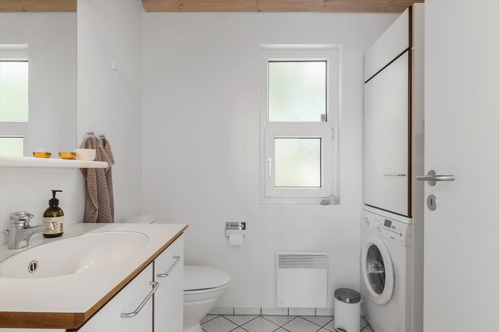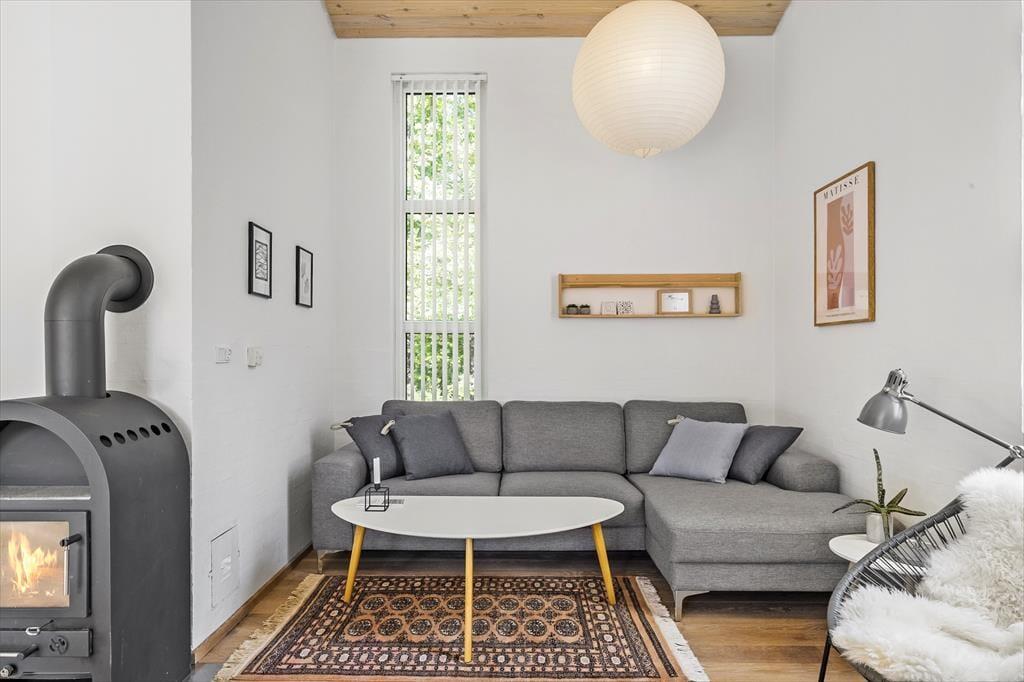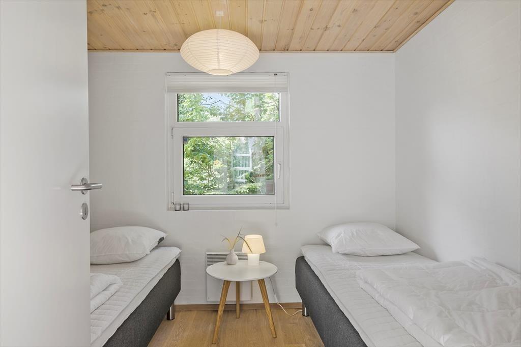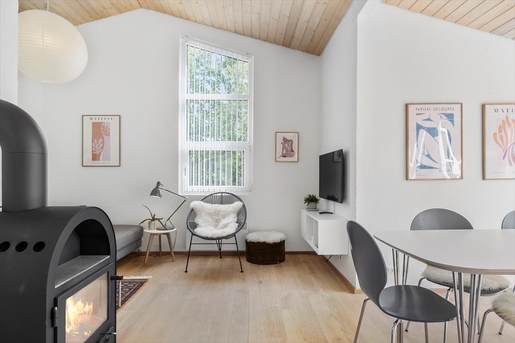 Det arkitekttegnede sommerhus er opført i 1997, og sidenhen er der blevet passet godt på det, så det fremstår virkelig flot. Atmosfæren er lys og let inden døre, og det stilrene møblement passer godt ind i de hvidmalede rum. I stuen står sofaen i en skøn hyggekrog, og hvis I drømmer om at tilbringe dagen her, kan I tænde op i brændeovnen og finde brætspil eller krimier frem fra feriebagagen. Der er også mulighed for at blive underholdt af husets fladskærms-tv, og hvis I bliver sultne, kan I gå i gang med madlavningen i det veludstyrede åbne køkken. I den ene ende af opholdsafdelingen kan I tage en stige op til en hems: Den fungerer som et fint supplement til husets to soveværelser, så i alt har I sengepladser til fem personer. Endelig er der et badeværelse med bruseniche og vaskemaskine.