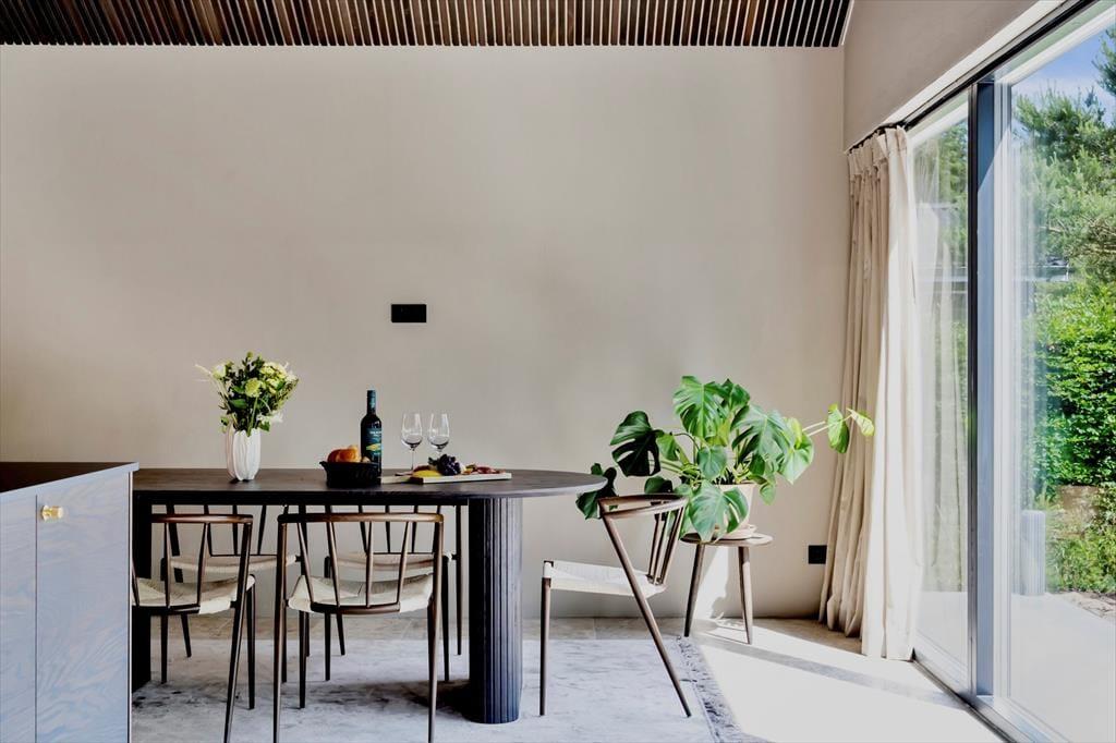 Der er kælet for detaljerne i dette nybyggede sommerhus, og det mærkes med det samme, man træder indenfor. De høje lofter og de store vinduespartier skaber en luftig og åben fornemmelse, hvor dagslyset strømmer ind og får rummene til at emme af fred og varme. Indretningen er stilren og moderne, men uden at miste sommerhusets helt særlige hygge – og her er skabt plads til både afslapning og samvær. Den åbne opholdsstue smelter sammen med køkkenet og bliver samlingspunktet for familiens hyggestunder, hvad enten det er til brætspil, madlavning eller en god film. Midt i huset finder du en lille, charmerende gårdhave, som giver ekstra lys og en helt særlig stemning til indendørslivet. Her kan du nyde en stille stund med en kop kaffe, mens solen spiller på væggene og stilheden sænker sig.