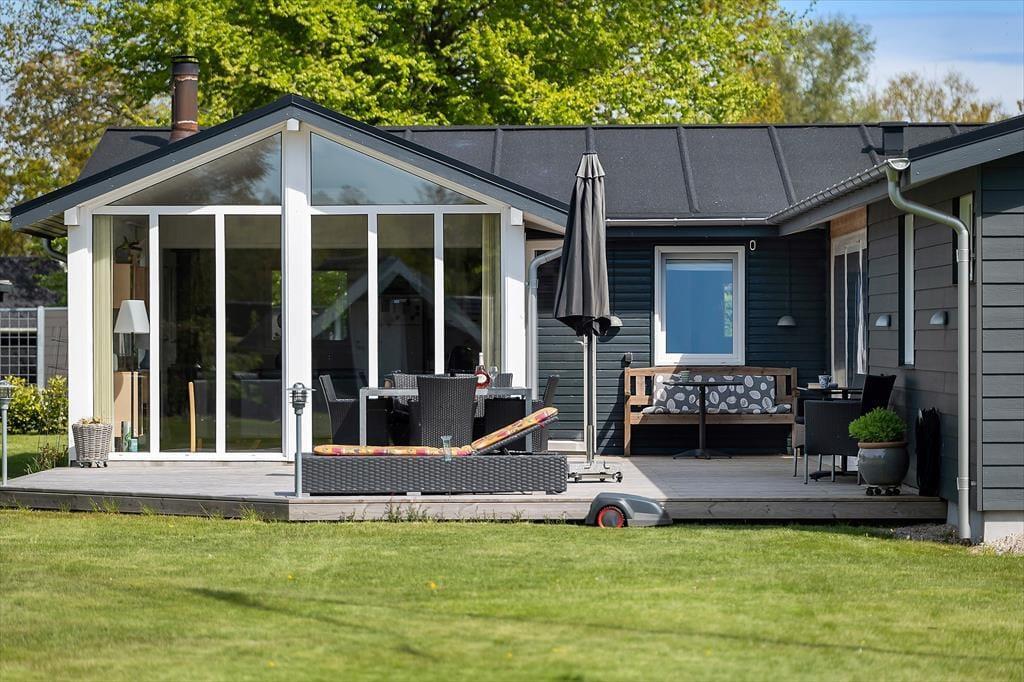 Det er ikke kun indenfor, at huset skaber rum for nærvær og gode stunder. Udenfor fortsætter de fine oplevelser på to skønne terrasser, hvor der både er sol og læ, alt efter tidspunkt og vejr. Det udendørs køkken sætter en ekstra prik over i’et – forestil dig at tilberede dagens frokost i det fri, mens børnene leger på græsset eller måske snupper en hurtig dukkert under den udendørs bruser. Nederst i haven venter en særlig overraskelse: Et shelter, som inviterer til ægte friluftsoplevelser under stjernerne. Det er det perfekte sted til at læse godnathistorier med pandelampe eller blot lytte til nattens lyde med en varm sovepose omkring sig. Hver kvadratmeter i haven er skabt til at blive brugt – hvad enten I vil spille bold, nyde eftermiddagskaffen i solen eller bare slappe af og kigge op i trætoppene.