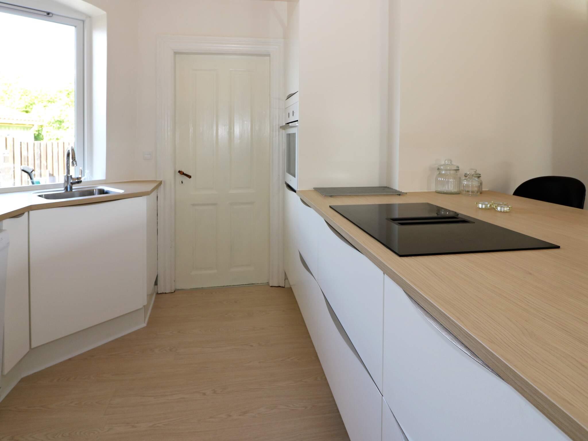 Køkken: El-komfur, køle-frys, mikroovn, emhætte, kaffemaskine, opvaskemask.