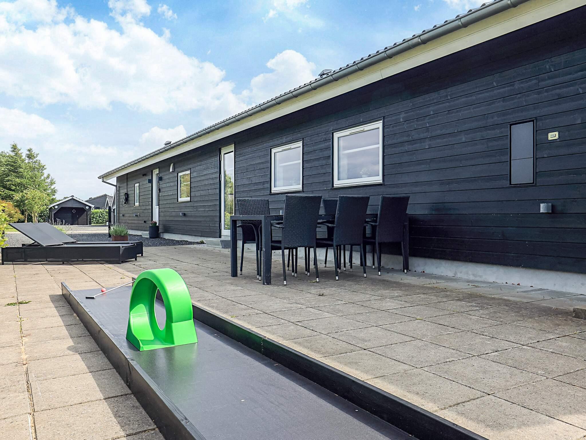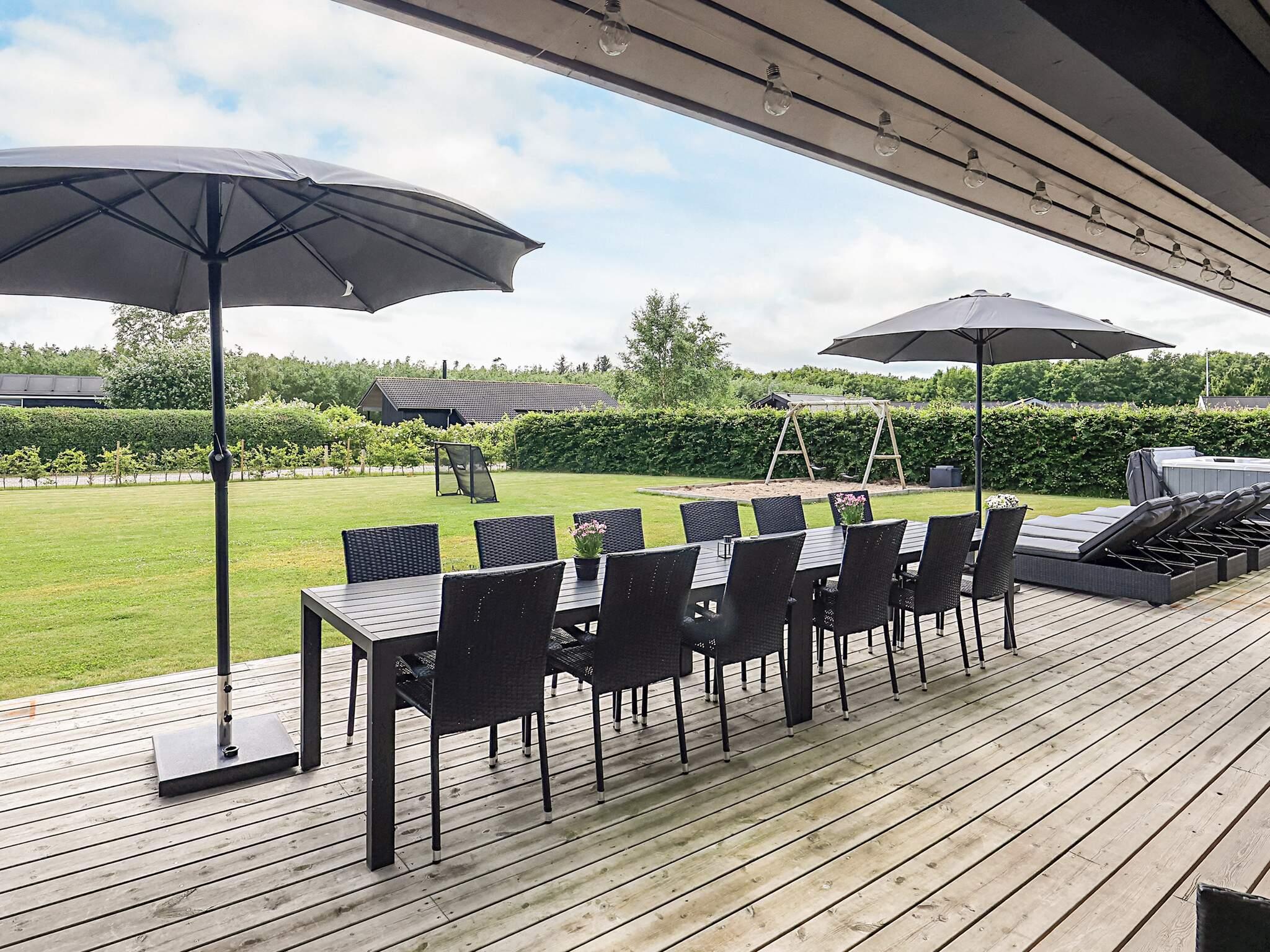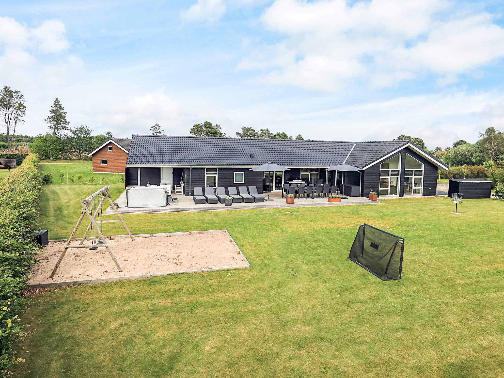Flot sommerhus i Øster Hurup med stor terrasse, udendørs spa og aktivitetsrum, perfekt til familier og samvær.