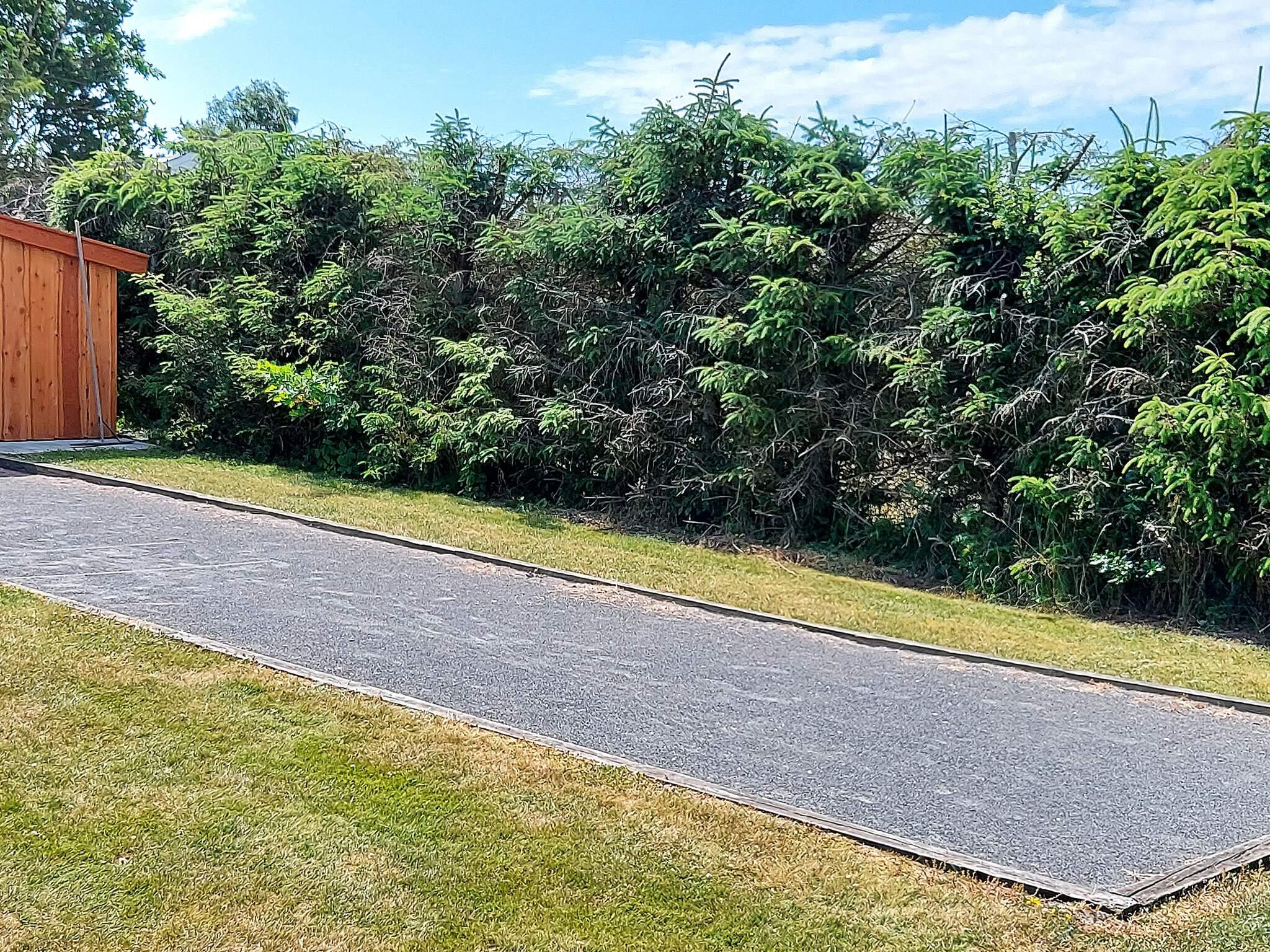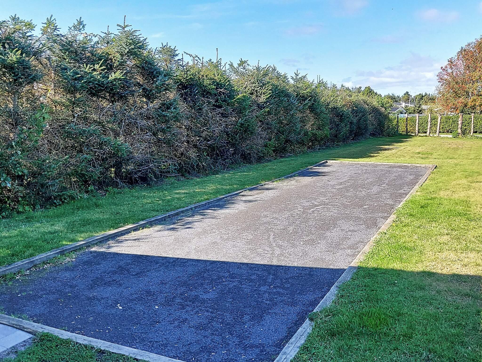 Der er en 45 m² overdækket terrasse, som giver god mulighed for at nyde solen. Der er petanquebane på 3x12 meter.