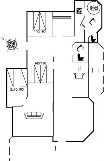 Sovepladserne fordeler sig på 2 værelser med dobbeltseng, 1 værelse med 2 sovepladser i køjeseng og 1 værelse med 2 enkeltsenge, som ligger i forbindelse med opholdsstuen. Stort badeværelse i forskudt plan med gulvvarme, separat toilet, direkte adgang til saunaen, bruseniche og skøn, 8-pers. spa (standvand) samt hyggeplads med bord og stole. Endnu et badeværelse med bruser, vaskemaskine og tørretumbler.