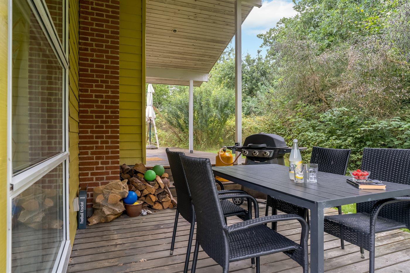 Et rummeligt, godt indrettet og pænt møbleret sommerhus i træ - beliggende i rolige omgivelser på en dejlig naturgrund med græsplæne, kun 100 m fra vandet. Til sommerhuset hører såvel åbent som overdækket terrasseareal med havemøbler.