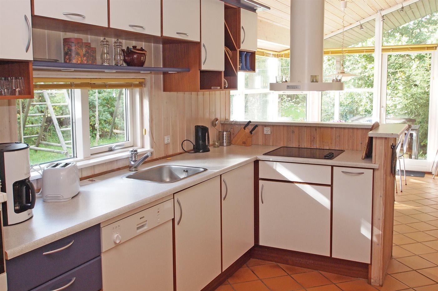 Flot, åbent køkken med bl.a. opvaskemaskine varmluftovn, komfur med keramiske kogeplader og fryser samt god, lys spiseplads med direkte adgang til terrassen. Hyggeligt indrettet opholdsstue i forskudt plan med brændeovn og TV.