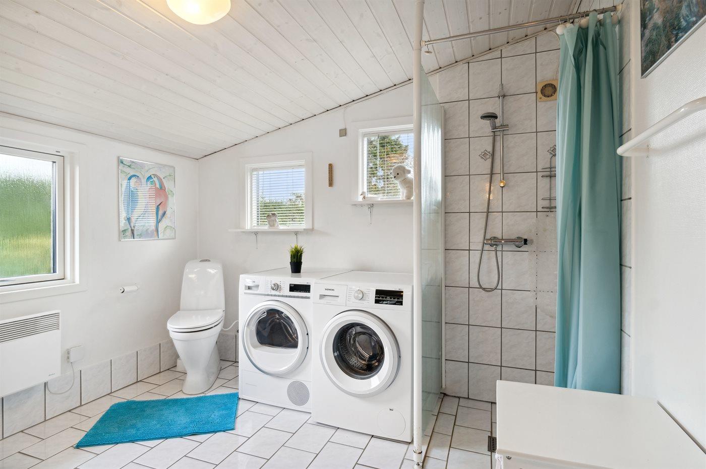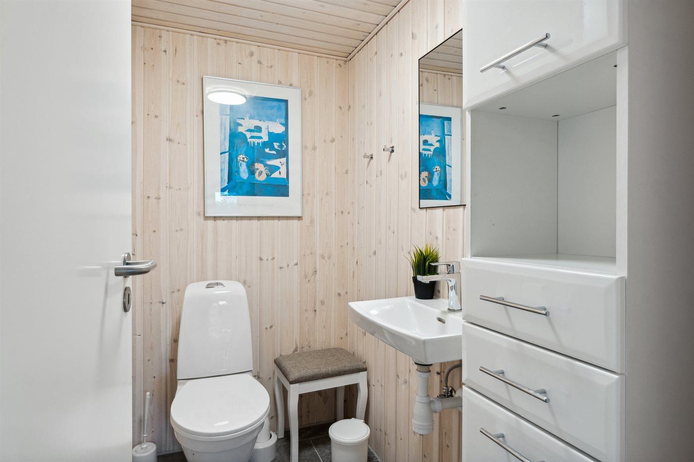 Der er 1 badeværelse med bruseniche og 2 toiletter, heraf 1 gæstetoilet. Der er gulvvarme på 1 badeværelse. Der er gulvvarme på gæstetoilettet.