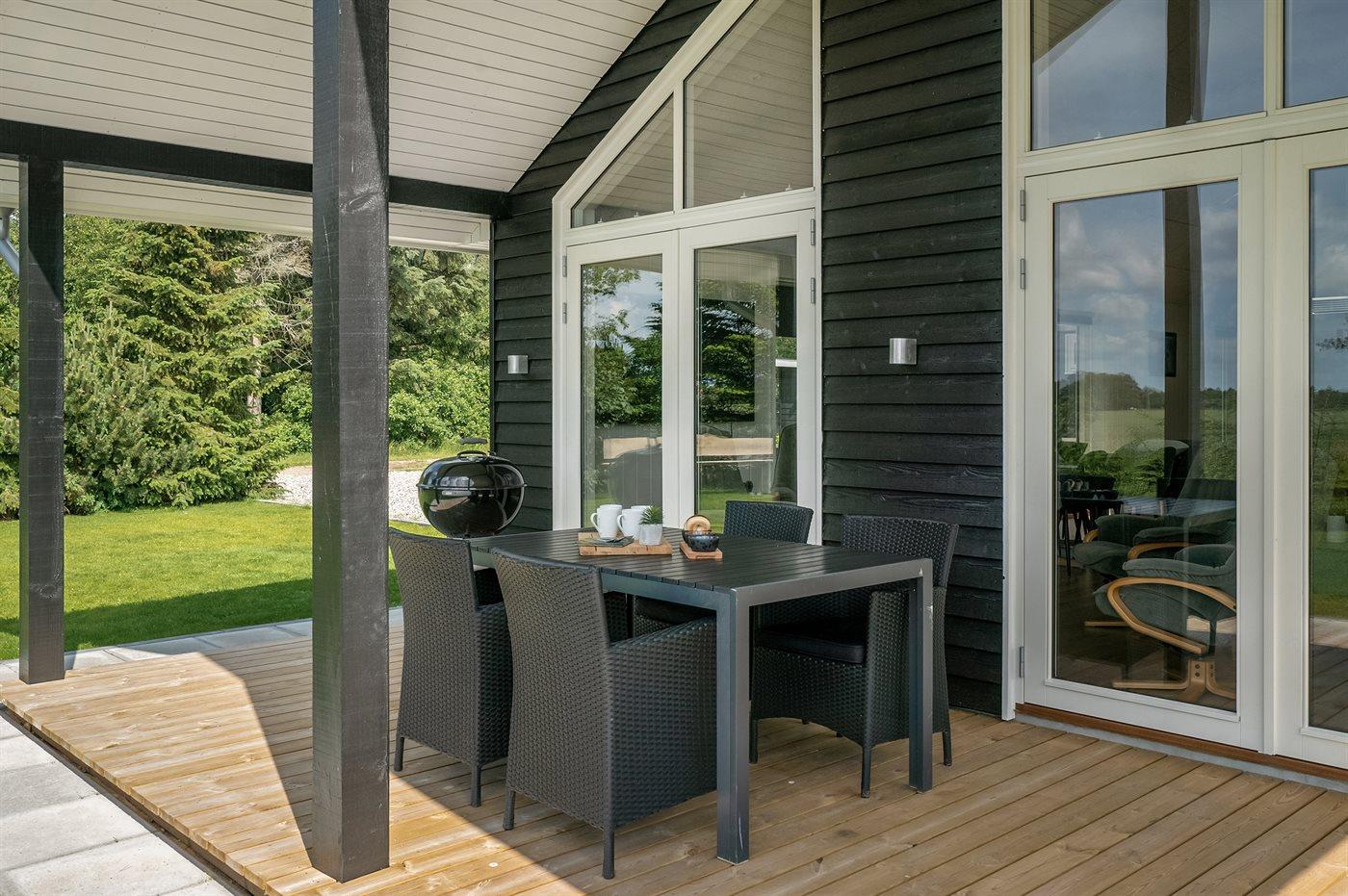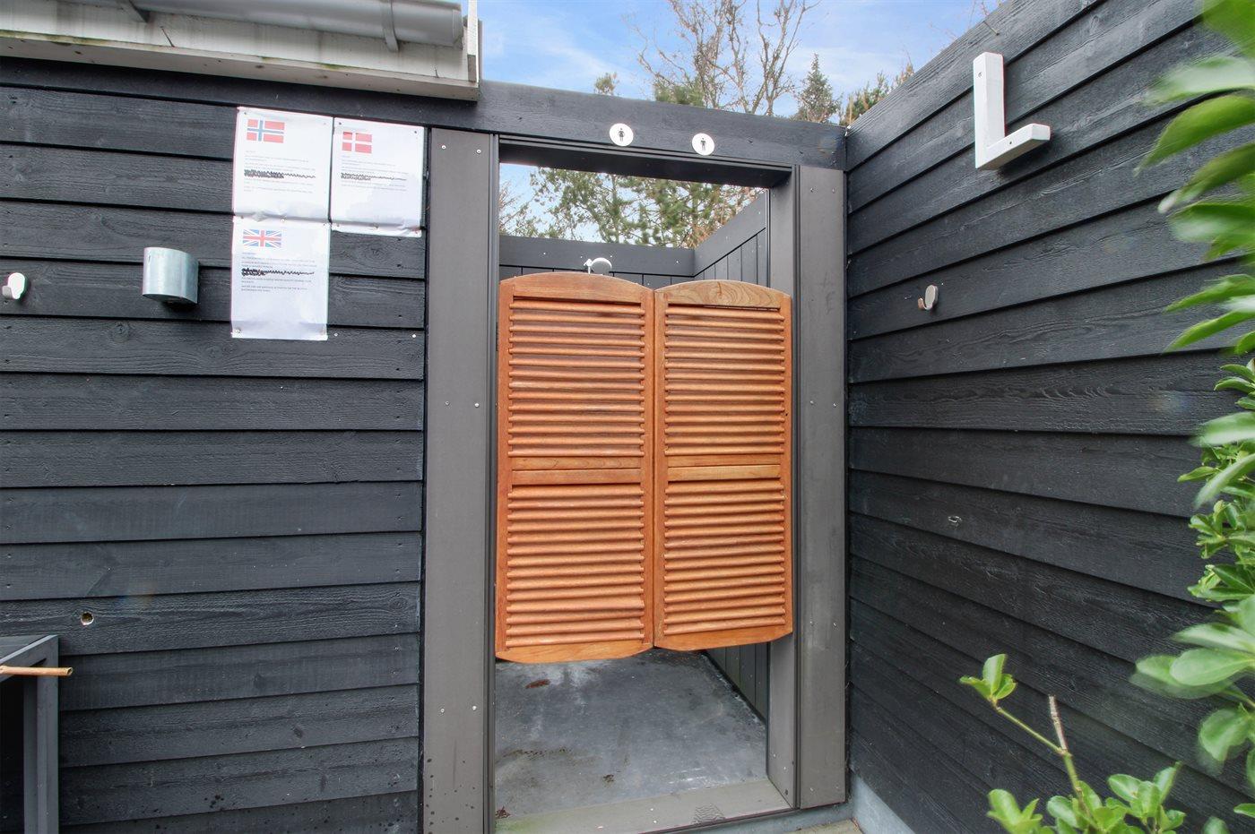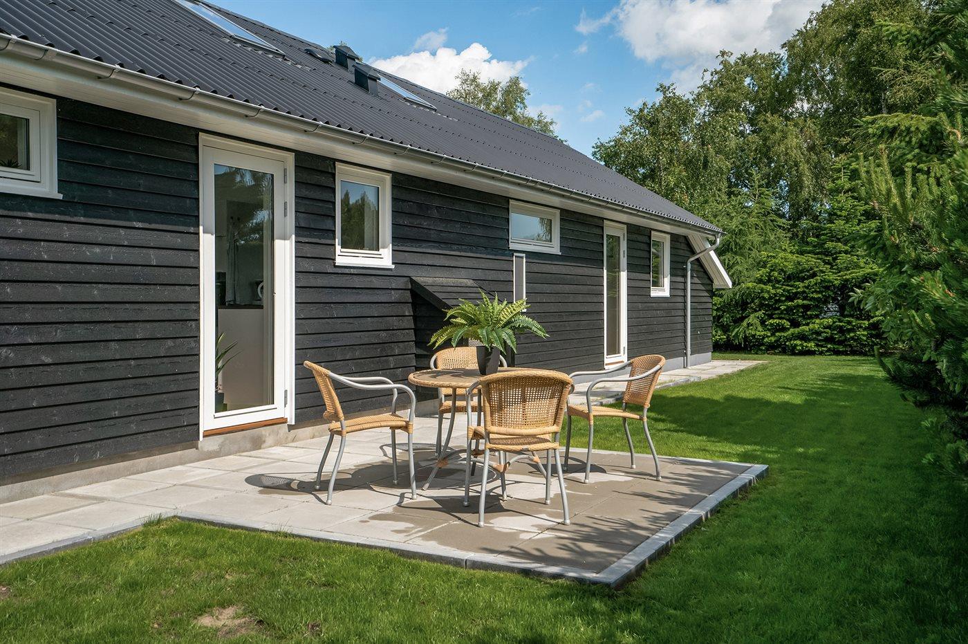 Ferieboligen er beliggende på en 880 m² stor havegrund. Der er 700 m til havet. Nærmeste forretning er beliggende i en afstand af 500 m. Til ferieboligen, der ligger på en solbelagt grund hvor solen kan nydes hele dagen, hører 130 m² åbent terrasseareal. Desuden er der 24 m² overdækket terrasse. Der er redskabsrum. Udendørs bruser. Der er 2 grill til rådighed. Parkering ved ferieboligen.