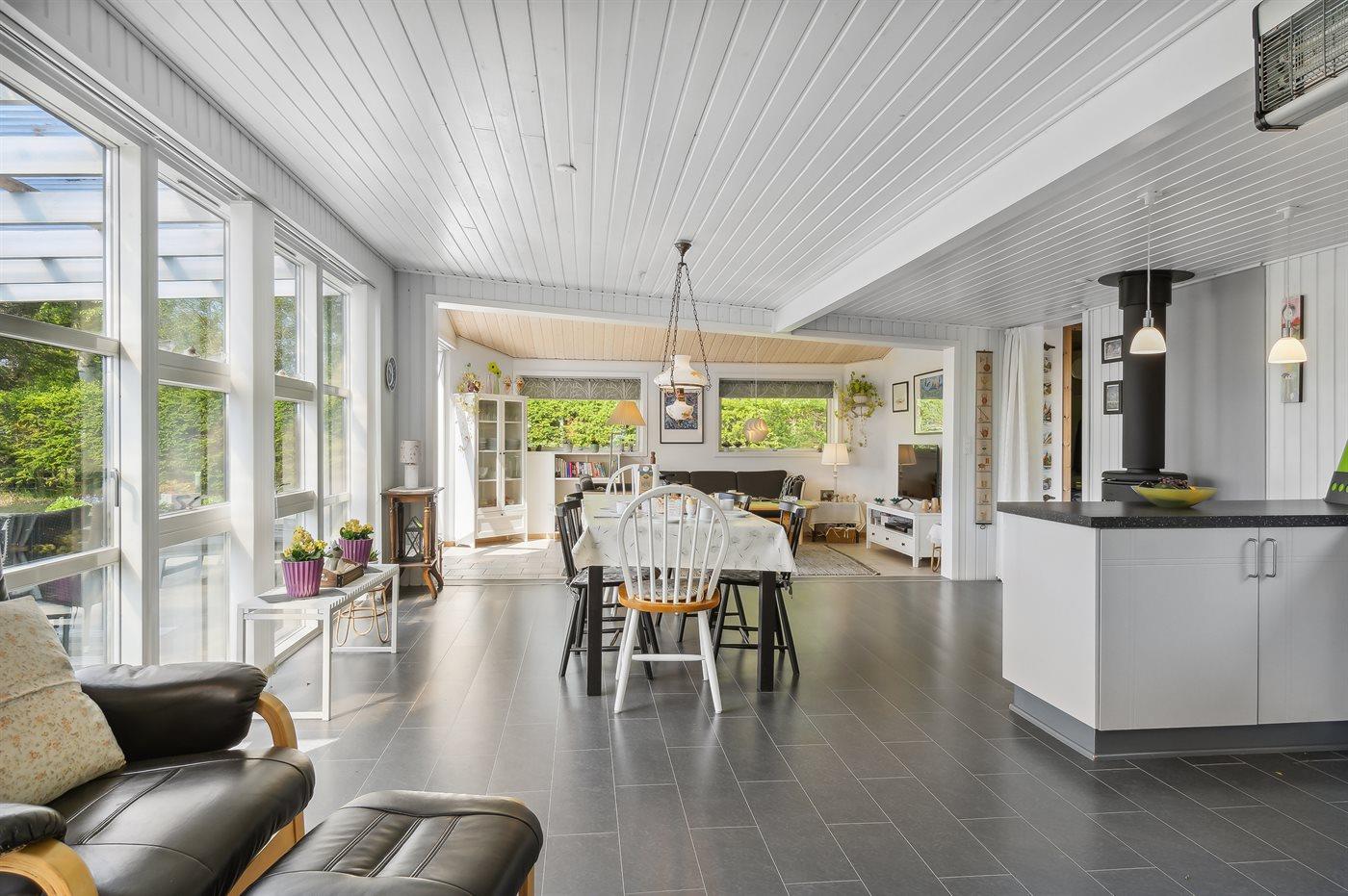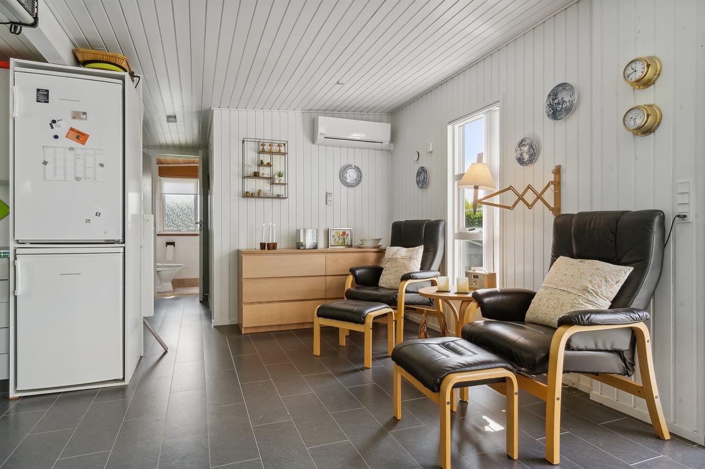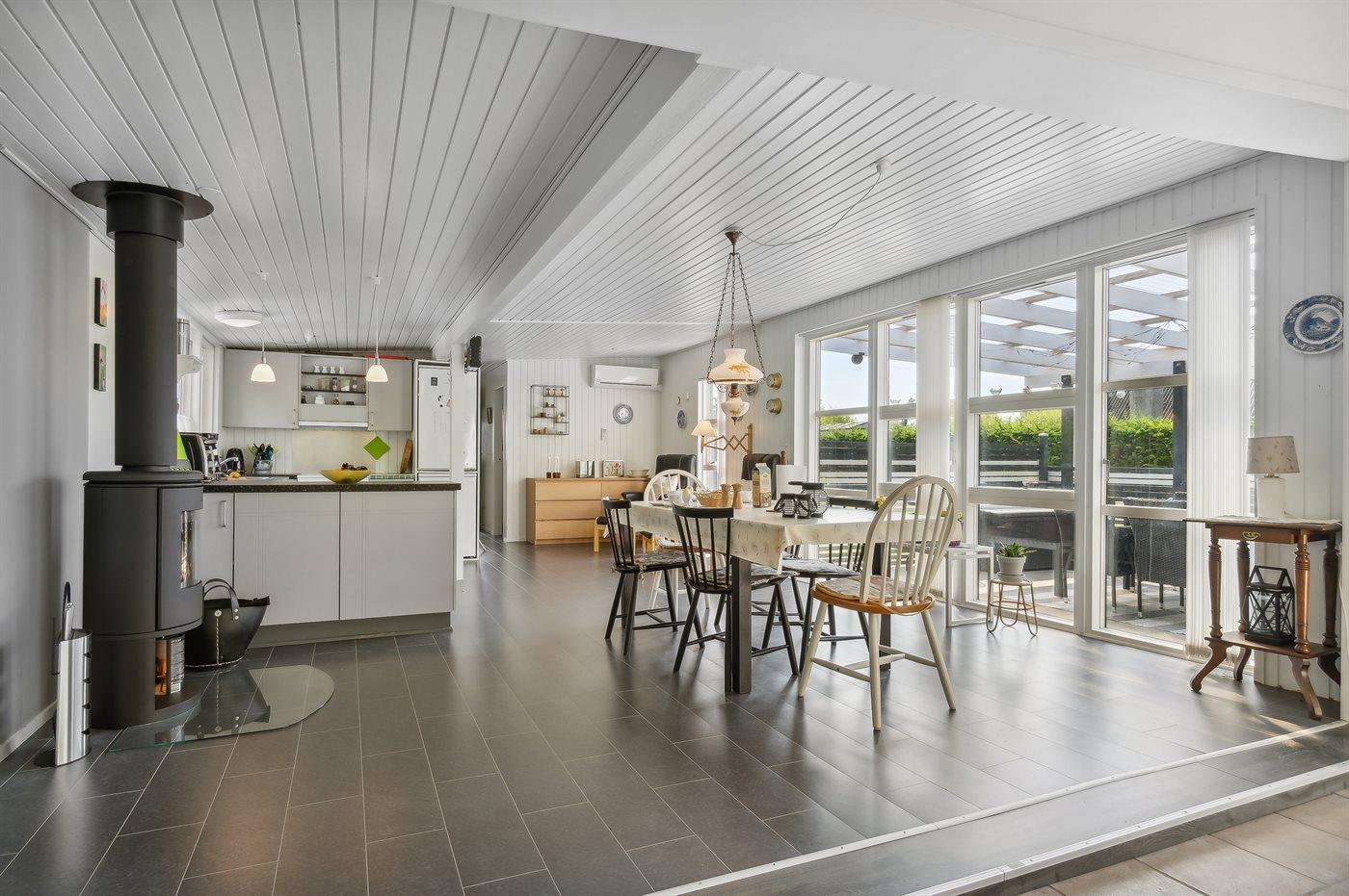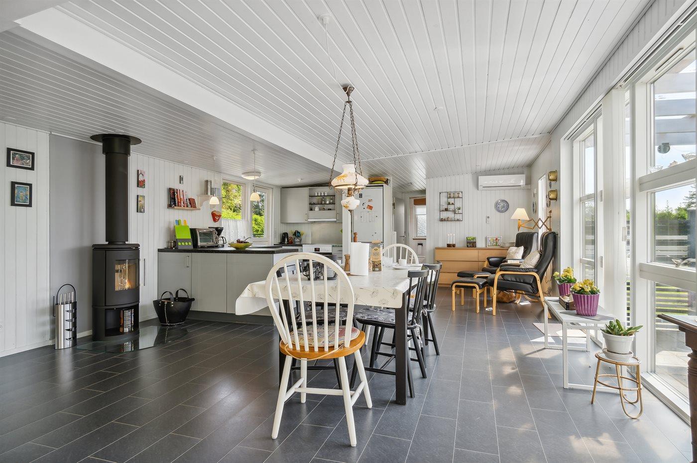 Køkkenet er udstyret med 1 køleskab. Der er 4 keramiske kogeplader, miniovn, bageovn samt opvaskemaskine.