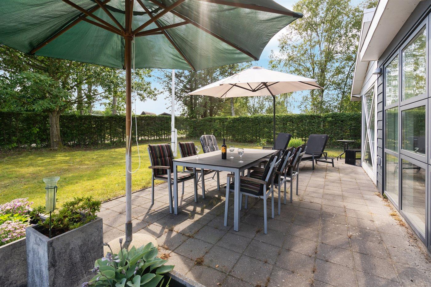 Ferieboligen er beliggende på en 820 m² stor havegrund. Grunden er indhegnet. Der er 900 m til havet. Nærmeste forretning er beliggende i en afstand af 1500 m. Til ferieboligen hører 20 m² terrasseareal. Desuden er der 18 m² overdækket terrasse. Udgang til solgård. Gynge. Sandkasse. Legetårn. Rutchebane. Fodboldmål. Grill til rådighed. Der er carport til rådighed. Parkering ved ferieboligen.
