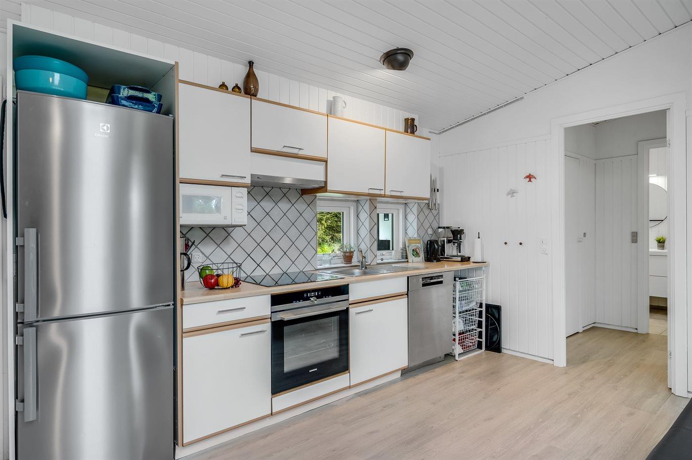 Køkkenet er udstyret med 1 køleskab. Der er 4 keramiske kogeplader, varmluftovn, mikrobølgeovn samt opvaskemaskine.
