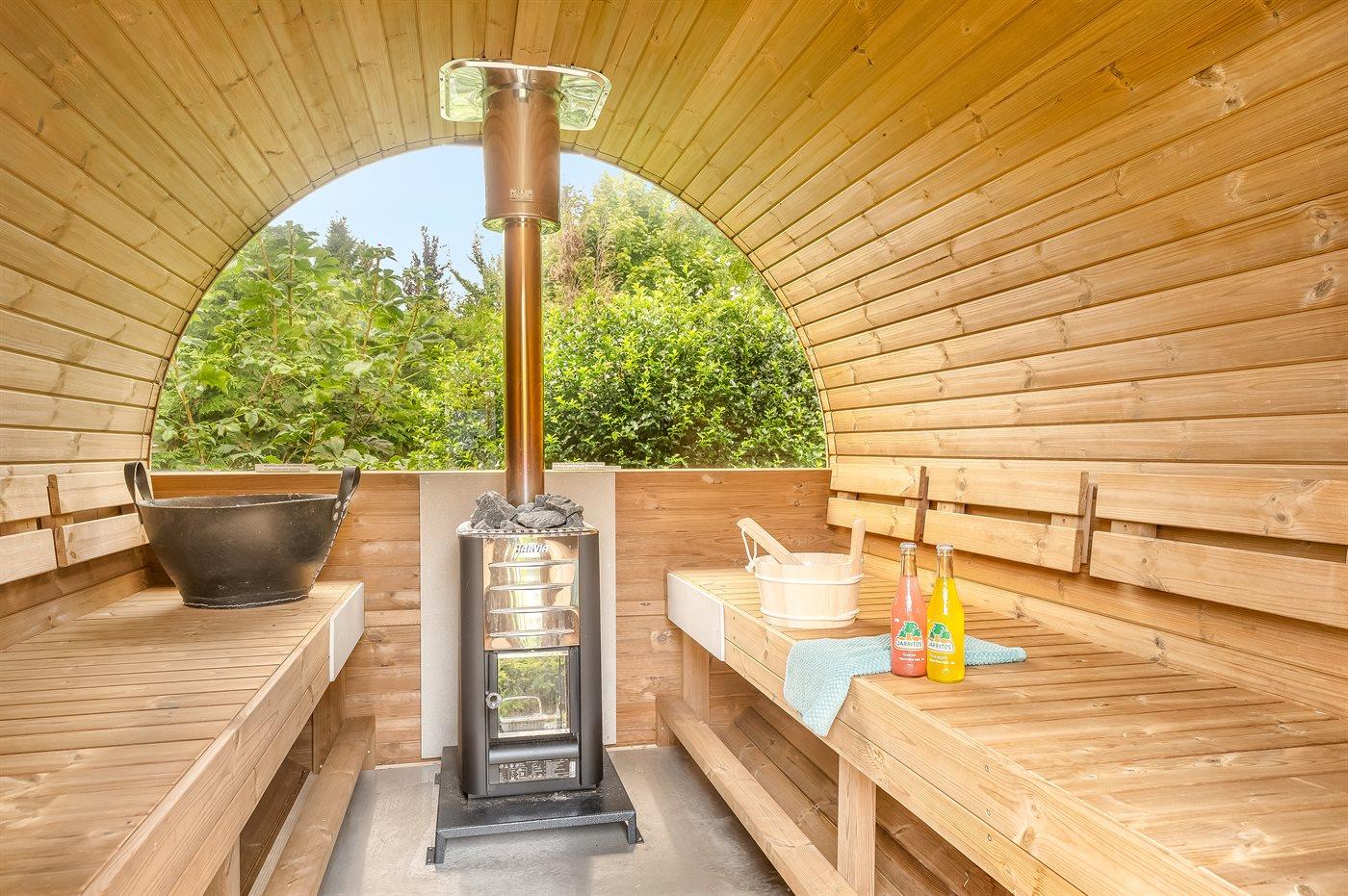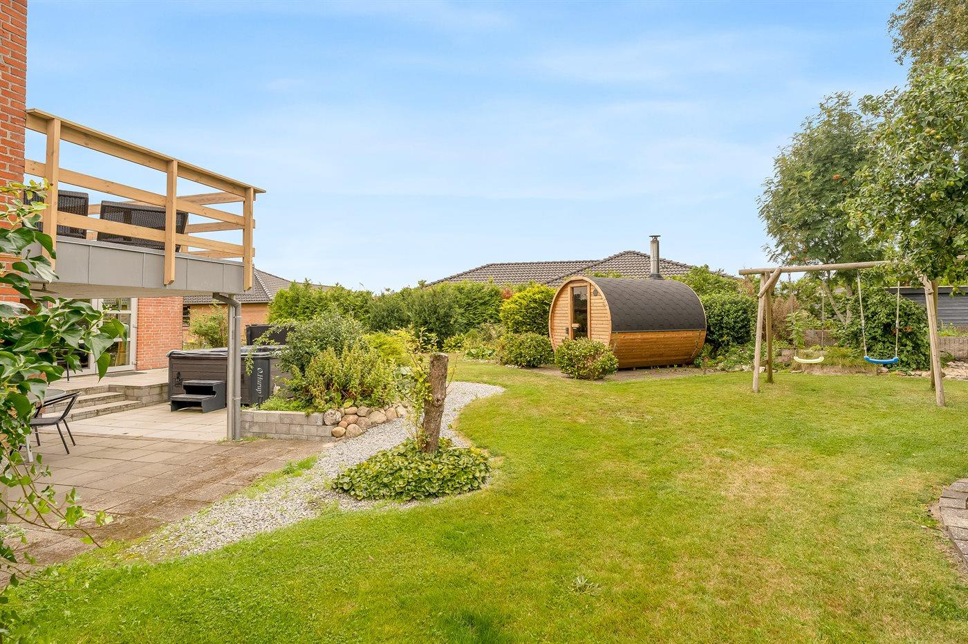 Udenfor venter en verden af velvære og afslapning. En imponerende tøndesauna og et dejligt udendørs spabad giver mulighed for at nyde velvære under åben himmel. Dette er det perfekte sted at koble af og skabe minder med hele familien.