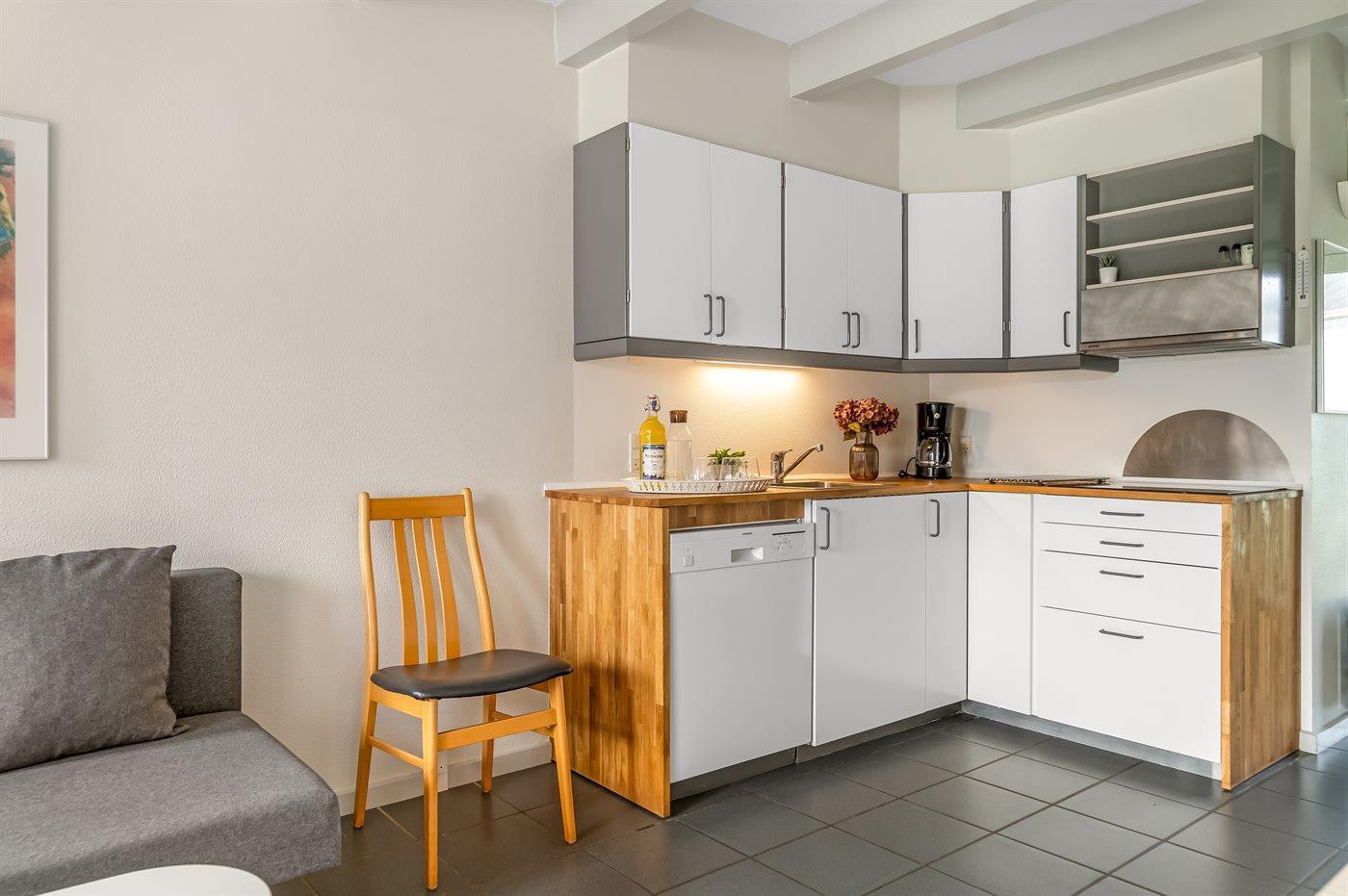 Køkkenet er udstyret med 1 køleskab. Der er 4 keramiske kogeplader, varmluftovn, mikrobølgeovn, Airfryer samt opvaskemaskine.