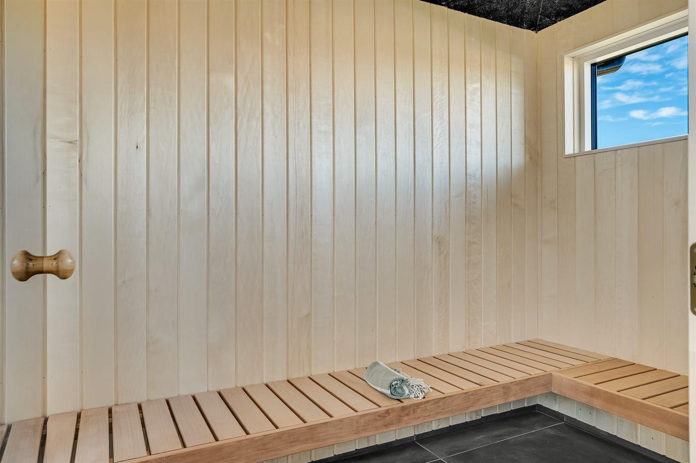 Ekstra bygning med badeværelse, sauna og standspa på terrassen.