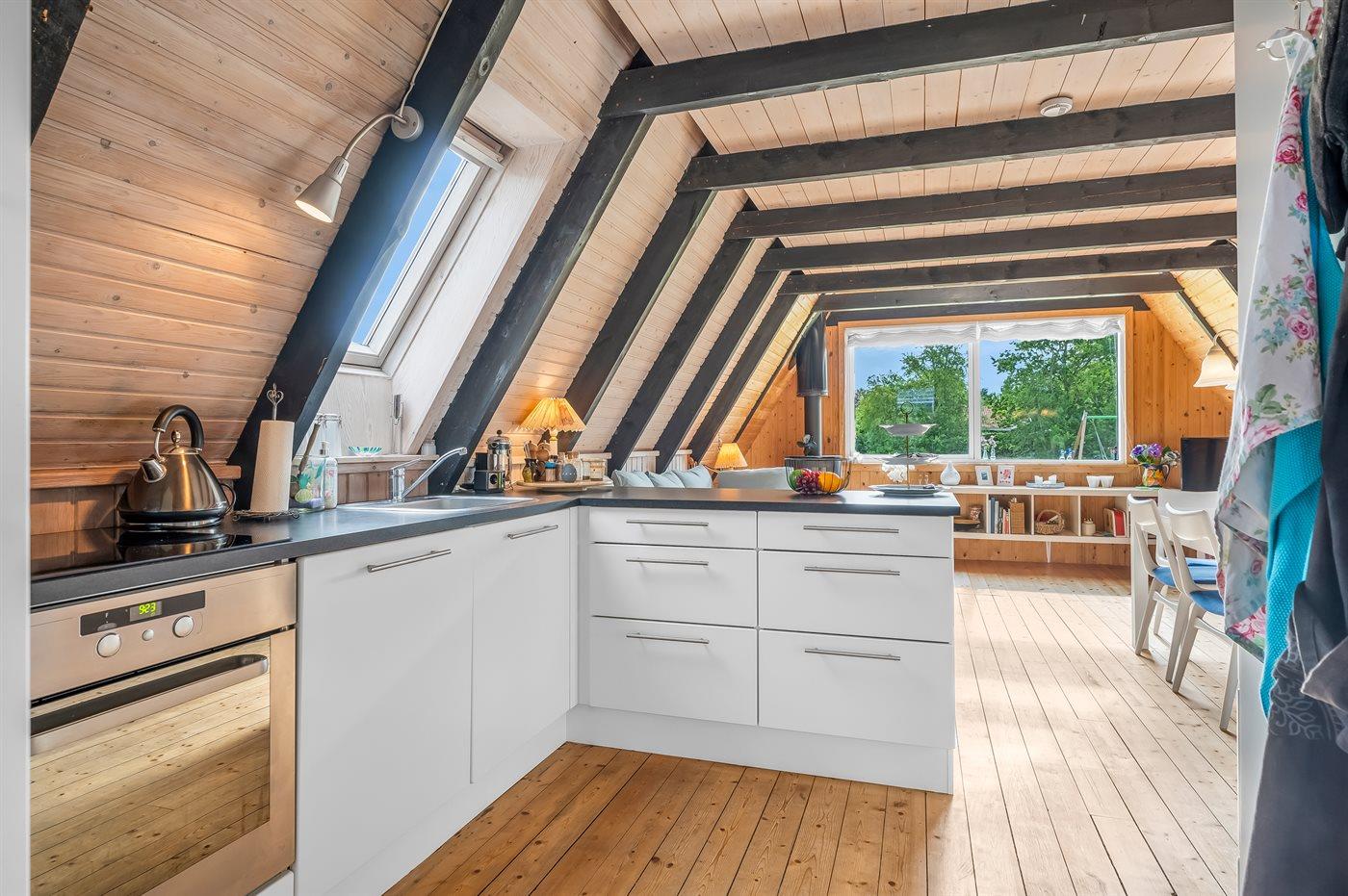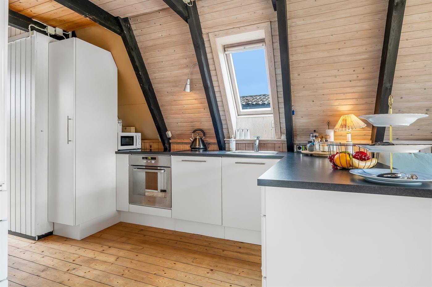 Køkkenet er udstyret med 1 køleskab. Der er 4 keramiske kogeplader, varmluftovn, mikrobølgeovn samt opvaskemaskine.