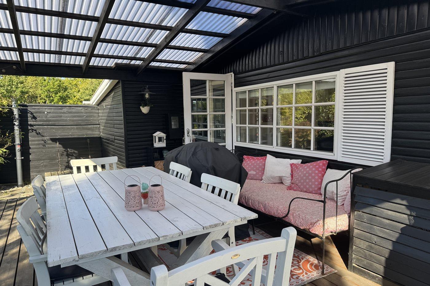 Ferieboligen er beliggende på en 580 m² stor havegrund. Grunden er indhegnet. Der er 640 m til havet. Der er 12800 m til fjorden. Nærmeste forretning er beliggende i en afstand af 1820 m. Der er en golfbane i en afstand af 16900 m. Til ferieboligen hører åbent terrasseareal. Desuden er der overdækket terrasse. Bålsted. Udendørs bruser. Grill til rådighed. Parkering ved ferieboligen.