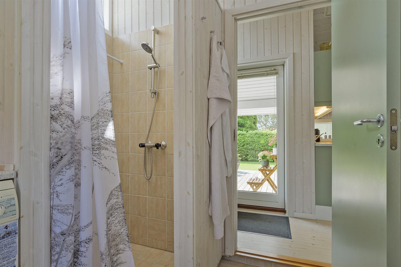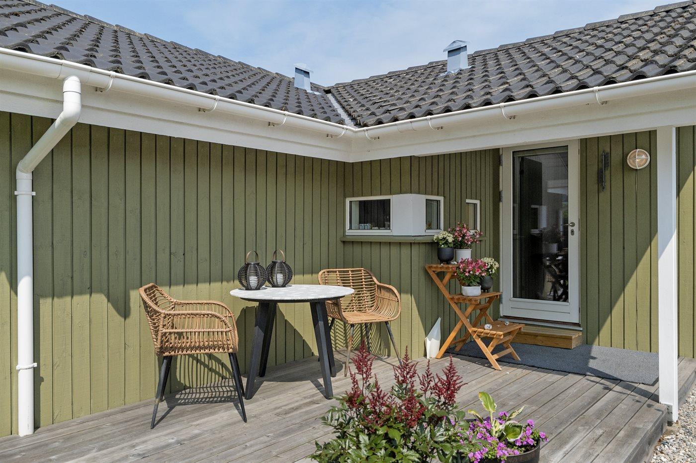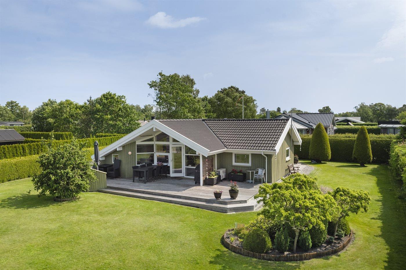 Ferieboligen er beliggende på en 850 m² stor naturgrund. Grunden er indhegnet. Der er 650 m til havet. Der er 12300 m til fjorden. Nærmeste forretning er beliggende i en afstand af 1290 m. Der er en golfbane i en afstand af 15150 m. Til ferieboligen hører åbent terrasseareal. Desuden er der overdækket terrasse. Gynge. Sandkasse. Trampolin. Rutchebane. Grill til rådighed. Der er installeret stik til opladning af elbil. Type 2 stik. Med 11 kW ladeeffekt. Parkering ved ferieboligen.