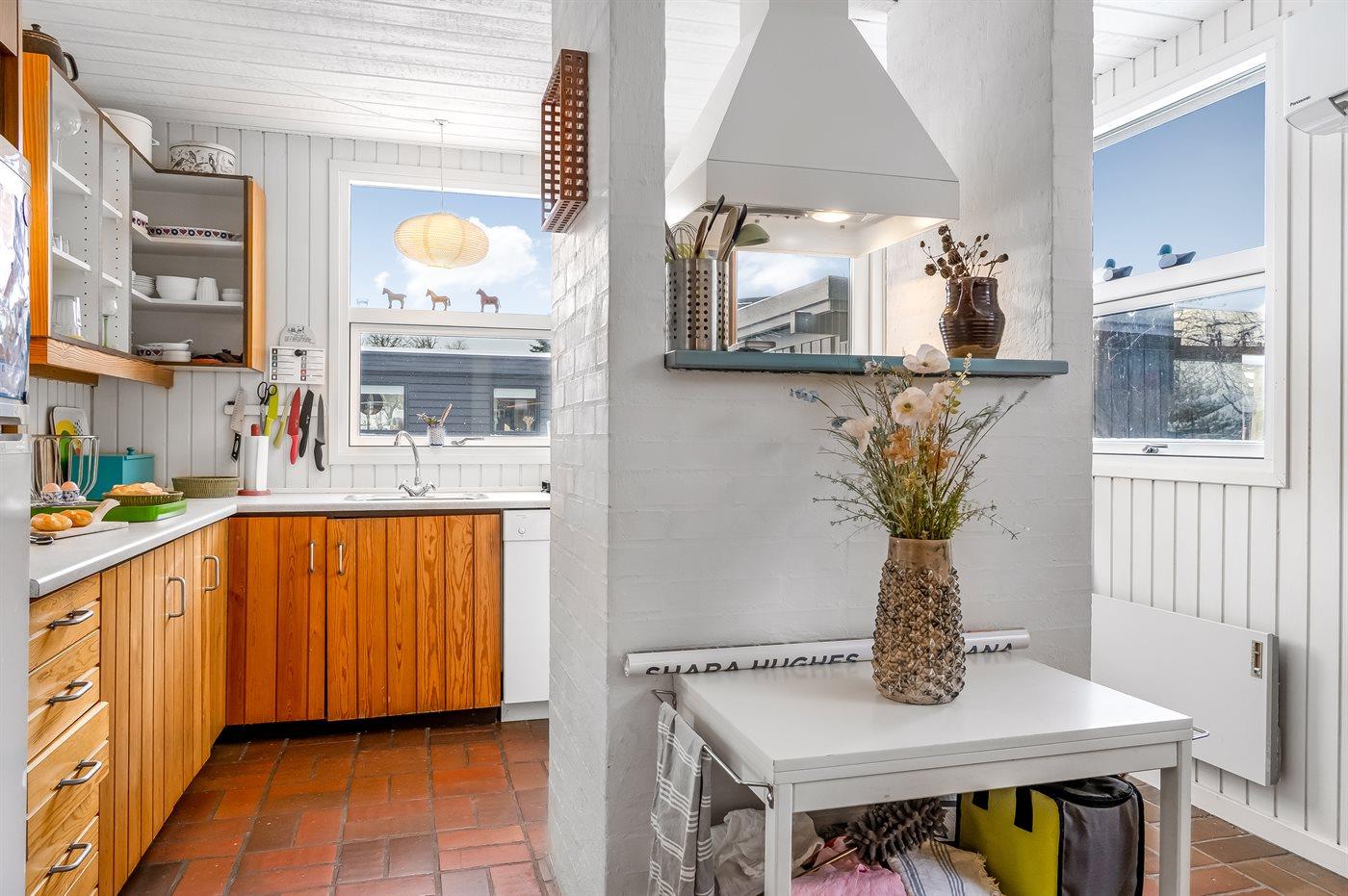 Køkkenet er udstyret med 1 køleskab. Der er 4 keramiske kogeplader, varmluftovn, mikrobølgeovn samt opvaskemaskine.