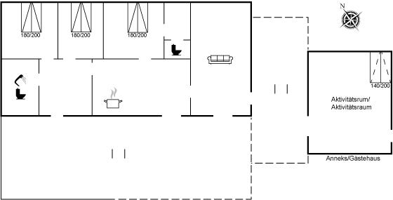 Der er i alt 4 soveværelser. Sovepladserne fordeler sig på: 6 sovepladser i dobbeltsenge. 2 sovepladser i sovesofa (dobbelt). 2 af disse sovepladser befinder sig i aktivitetsrummet i husets anneks. Derudover er der 1 stk. barneseng.