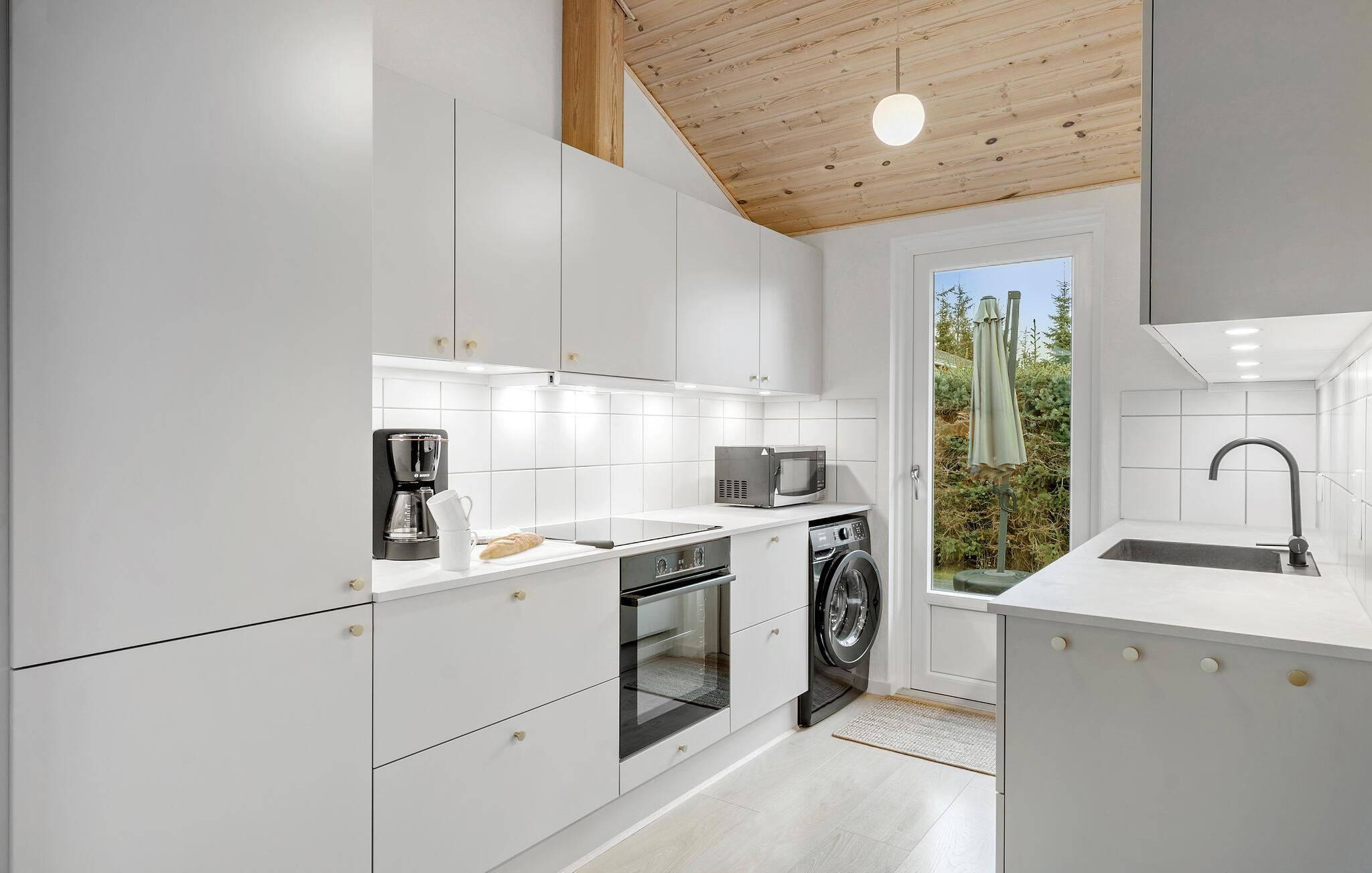 Giv jer selv en pause fra hverdagen i Øster Hurup ved Jyllands maleriske østkyst. Her venter et feriehus, der er ideelt til afslappende dage med familien eller venner. I den indbydende opholdsstue kan I slappe af på den rummelige sofa, hvad enten det er med en spændende filmaften, spil af jeres yndlingsbrætspil eller bare ved at nyde varmen fra ilden i brændeovnen. Start morgenen med en hyggelig morgenmad ved spisebordet, mens de første solstråler falder ind gennem terrassedøren og fylder rummet med varmt lys.