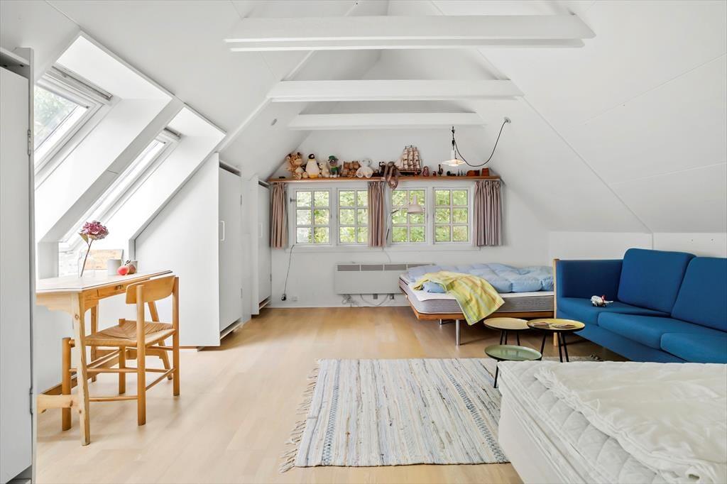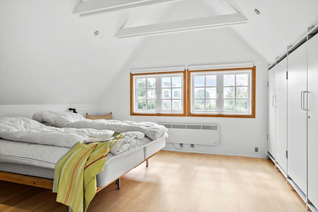 På første sal er yderligere et stort opholdsrum og to soveværelser. Skråvæggene skaber ekstra hygge, men samtidig giver de store vinduer et godt lysindfald og ikke mindst en flot udsigt. Det ene soveværelse har en dobbeltseng og god opbevaringsplads. Skal du sove her, kan du også nyde den fantastiske udsigt mod syd over marker og træer. Det andet soveværelse er indrettet med to dobbeltsenge, så her er flere muligheder, og det passer helt perfekt til de mindste.