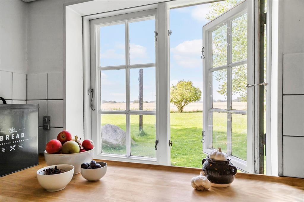 I køkkenet er der god plads til at tilberede feriens måltider, mens I kan nyde udsigten over haven og markerne mod vest. Spisebordspladsen er i samme rum, så her kan I tilbringe mange gode timer sammen. I køkkenet findes mange flotte og originale detaljer, bl.a. et brændekomfur og et flot indbygget skab.