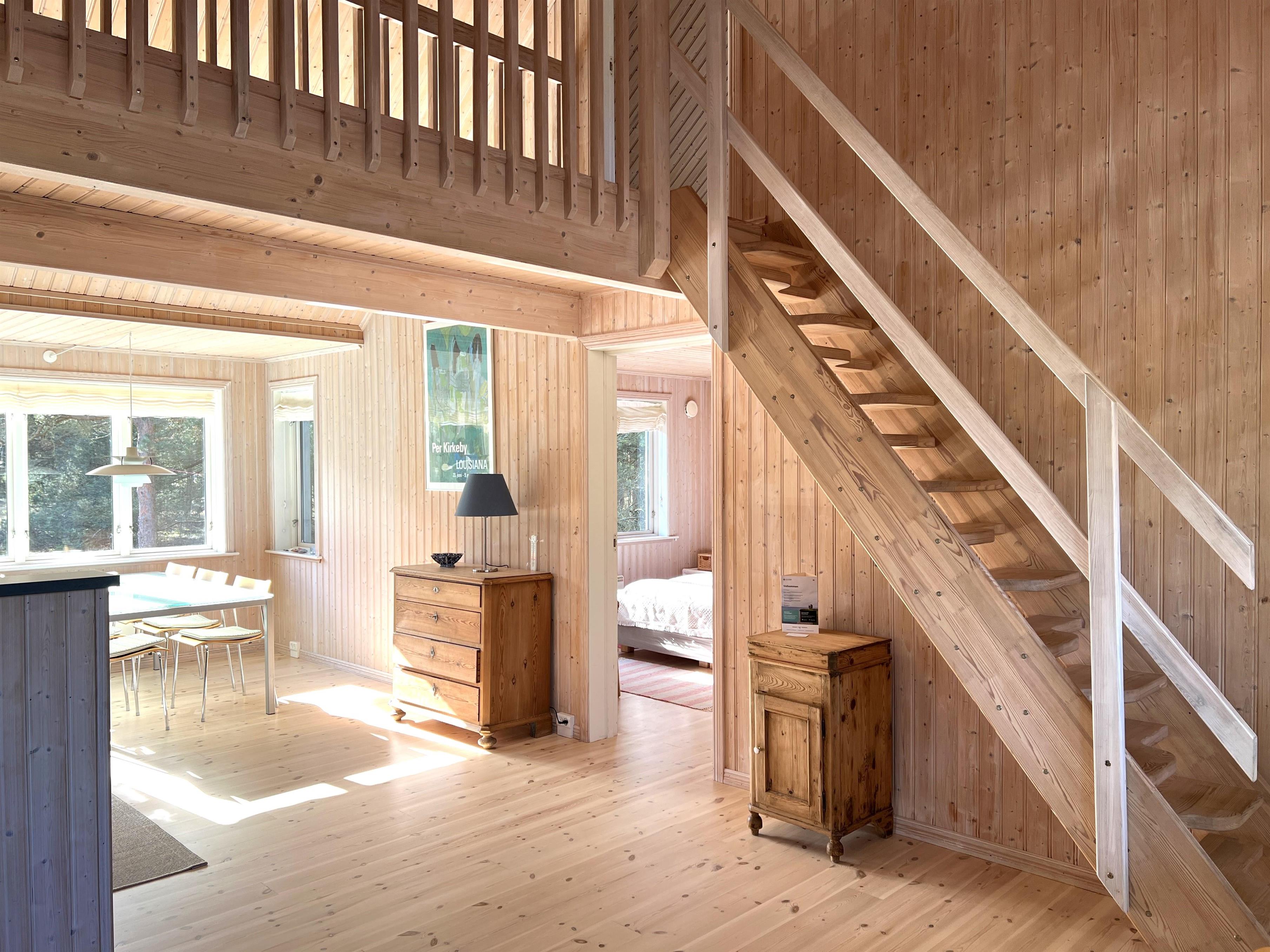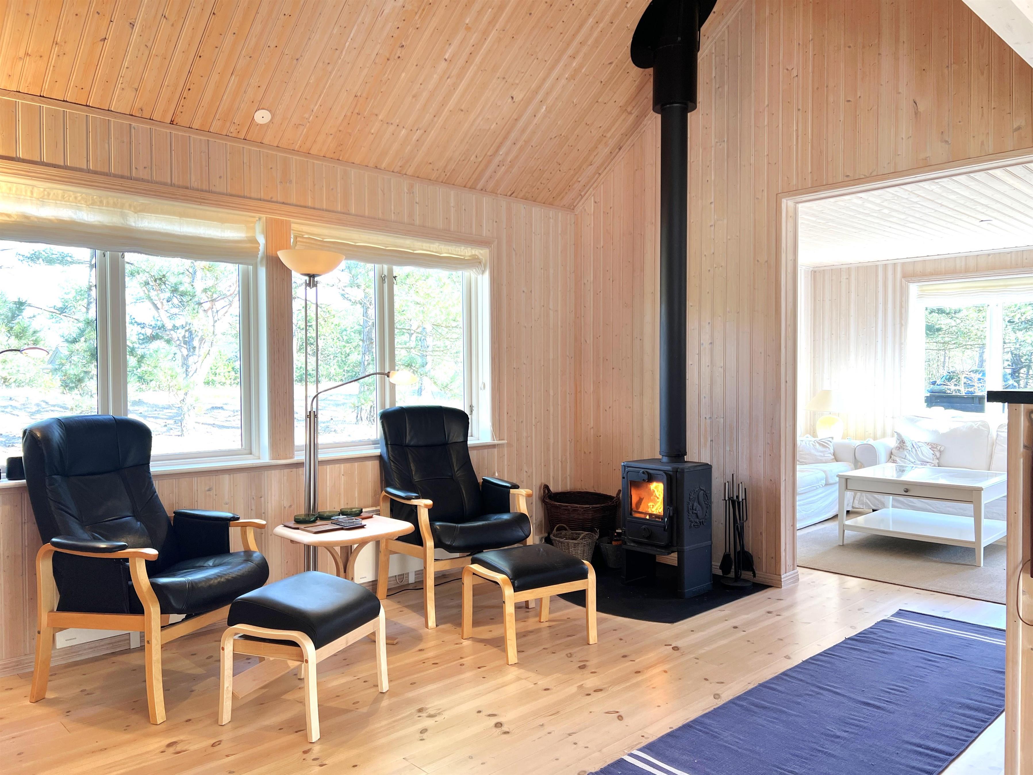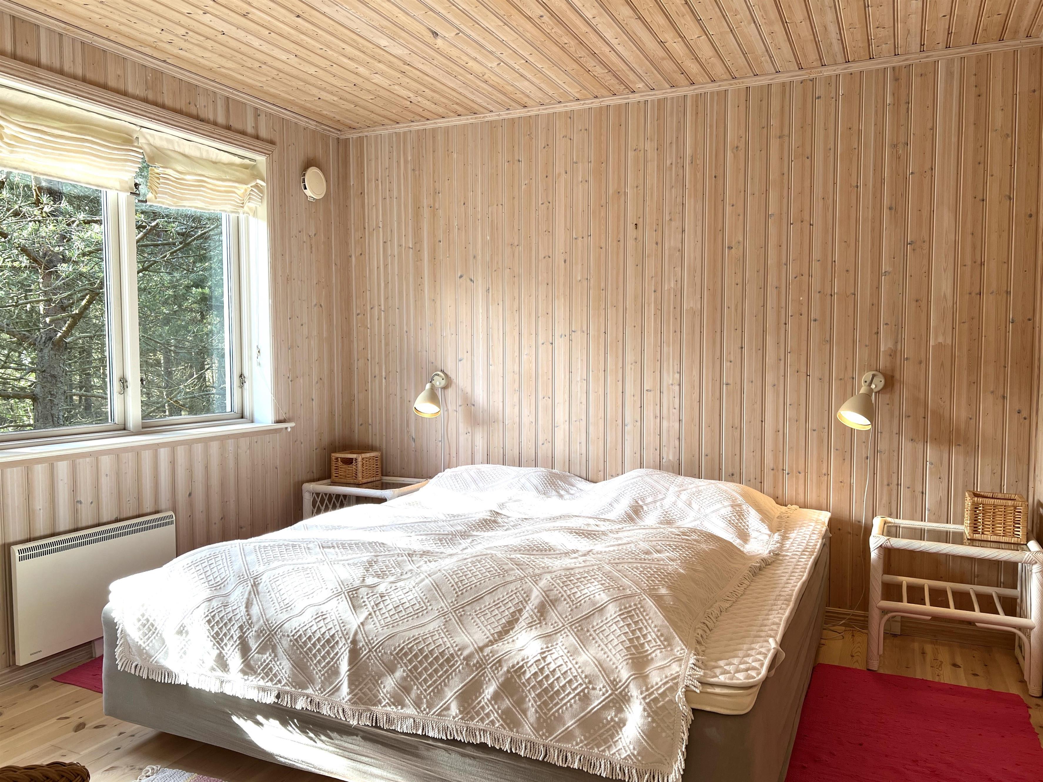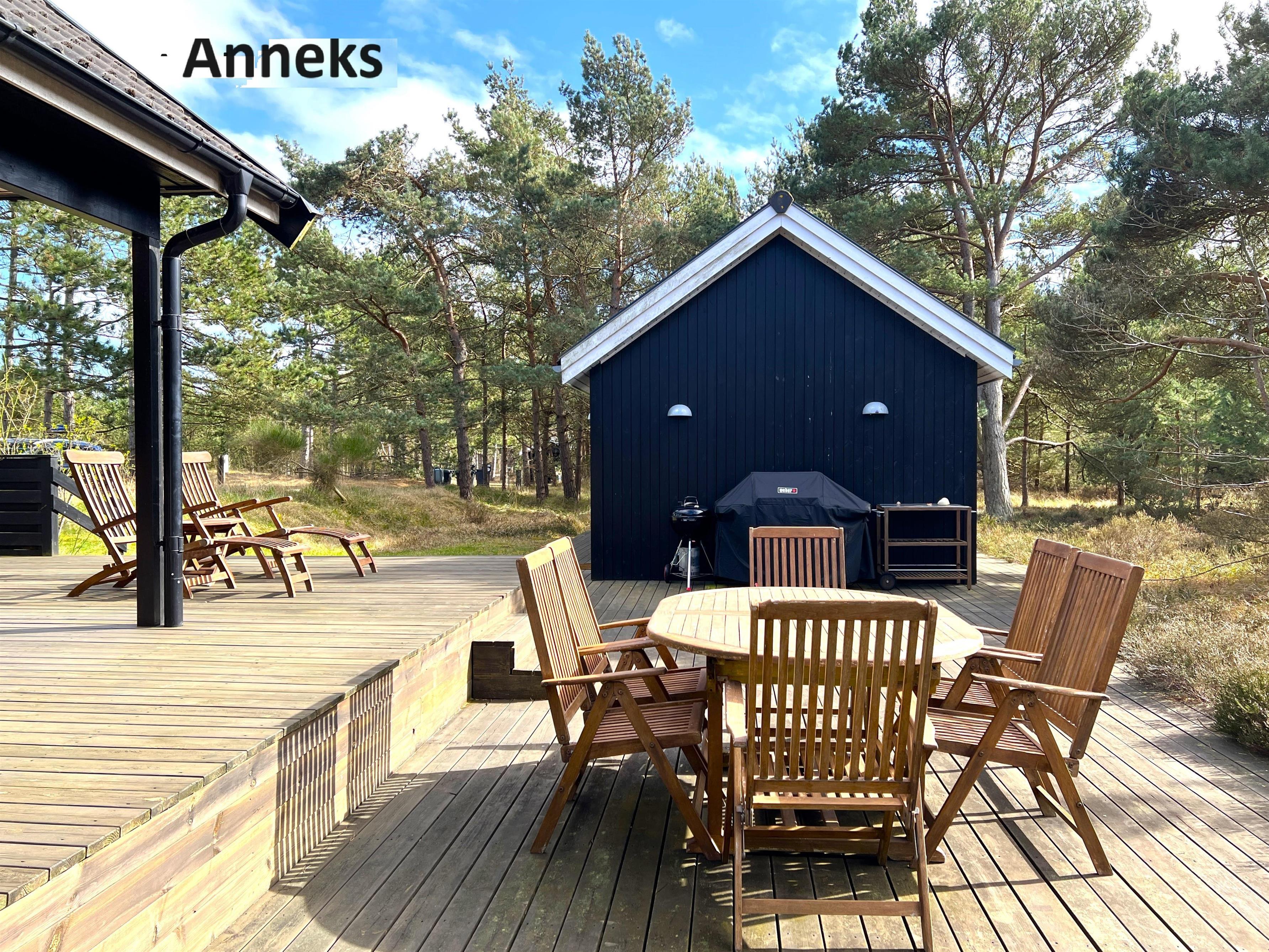 Det store hovedhus og anneks er forbundet af træterrasse, så man let kan bevæge sig mellem de to boliger, der indbyder til det skønneste ferieophold - også for to familier. Hovedhuset er bygget med loft til kip og fremstår lyst og indbydende. Fint og veludstyret køkken i åben forbindelse med spisestue med udgang til den imponerende store terrasse. Huset har en fin stue med behagelige møbler og TV, hvorfra der også er udgang til træterrassen. Desuden er der et soveværelse med dobbeltseng og et flot badeværelse med sauna. På 1. salen findes yderligere to fine soveværelser med henholdsvis dobbeltseng og to enkeltsenge. Alle værelser er meget rummelige og med god opbevaringsplads. I annekset er der et stort, flot soveværelse med dobbeltseng og et fint badeværelse med brus . Annekset har et smukt lysindfald fra det dobbelte vinduesparti med terrassedør. Huset har stærkt fibernet indlagt og er generelt meget veludstyret. Rundt huset er der flere dejlige solkroge og mange flotte havemøbler til rådighed. Her kan husets grill også benyttes. Sammen med udsigten over den smukke grund og den fredfyldte beliggenhed, fornemmer man virkelig den særlige Læsø-ro.