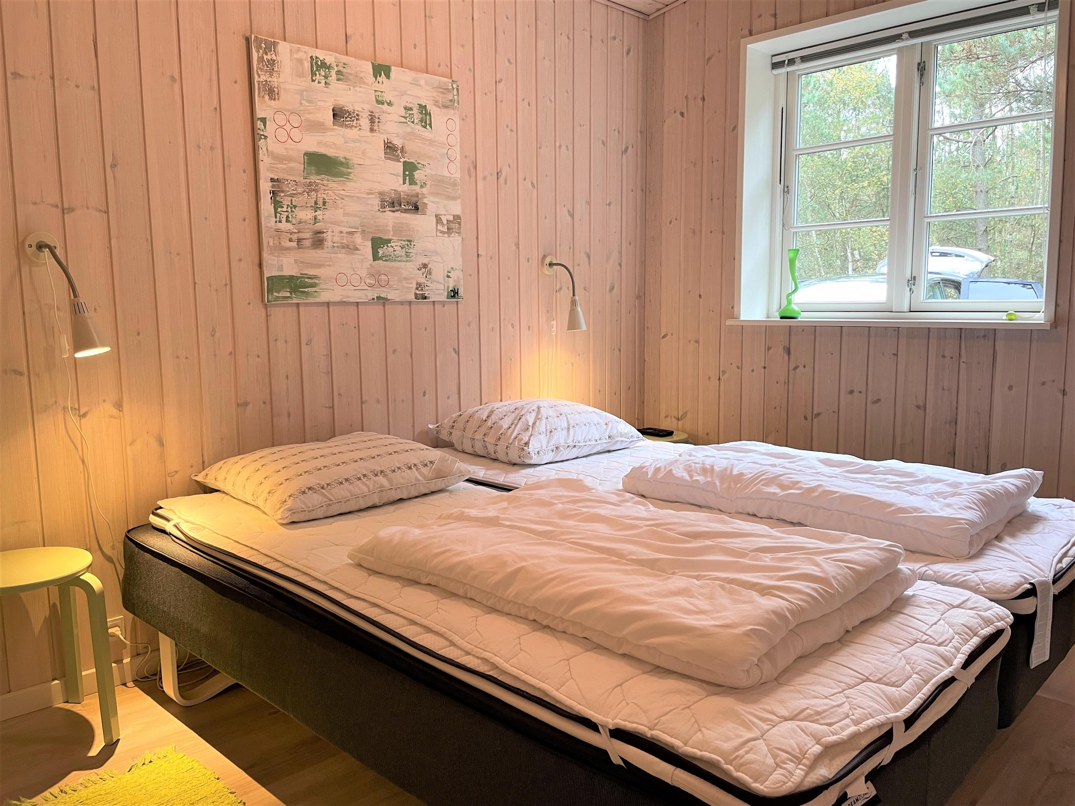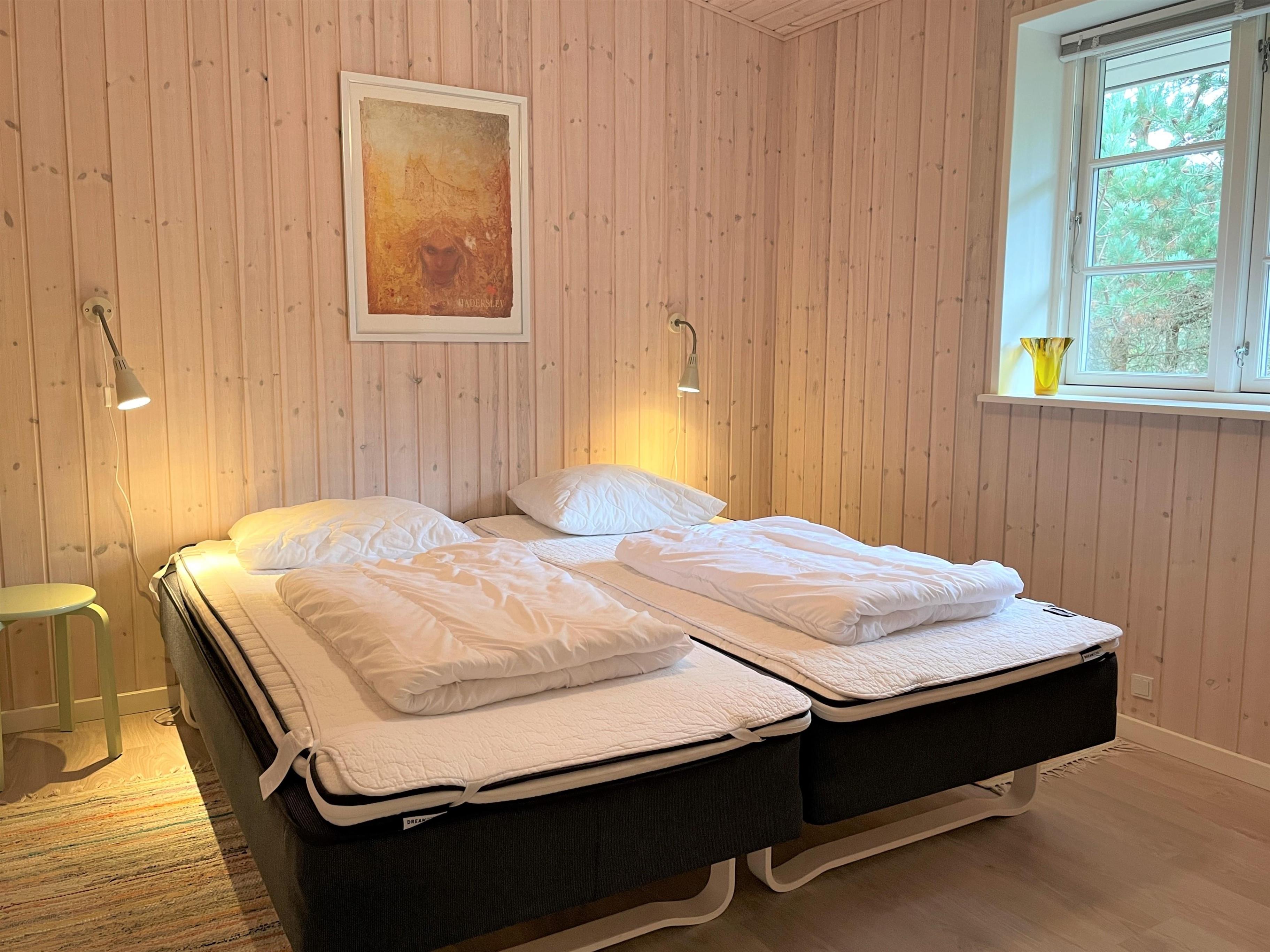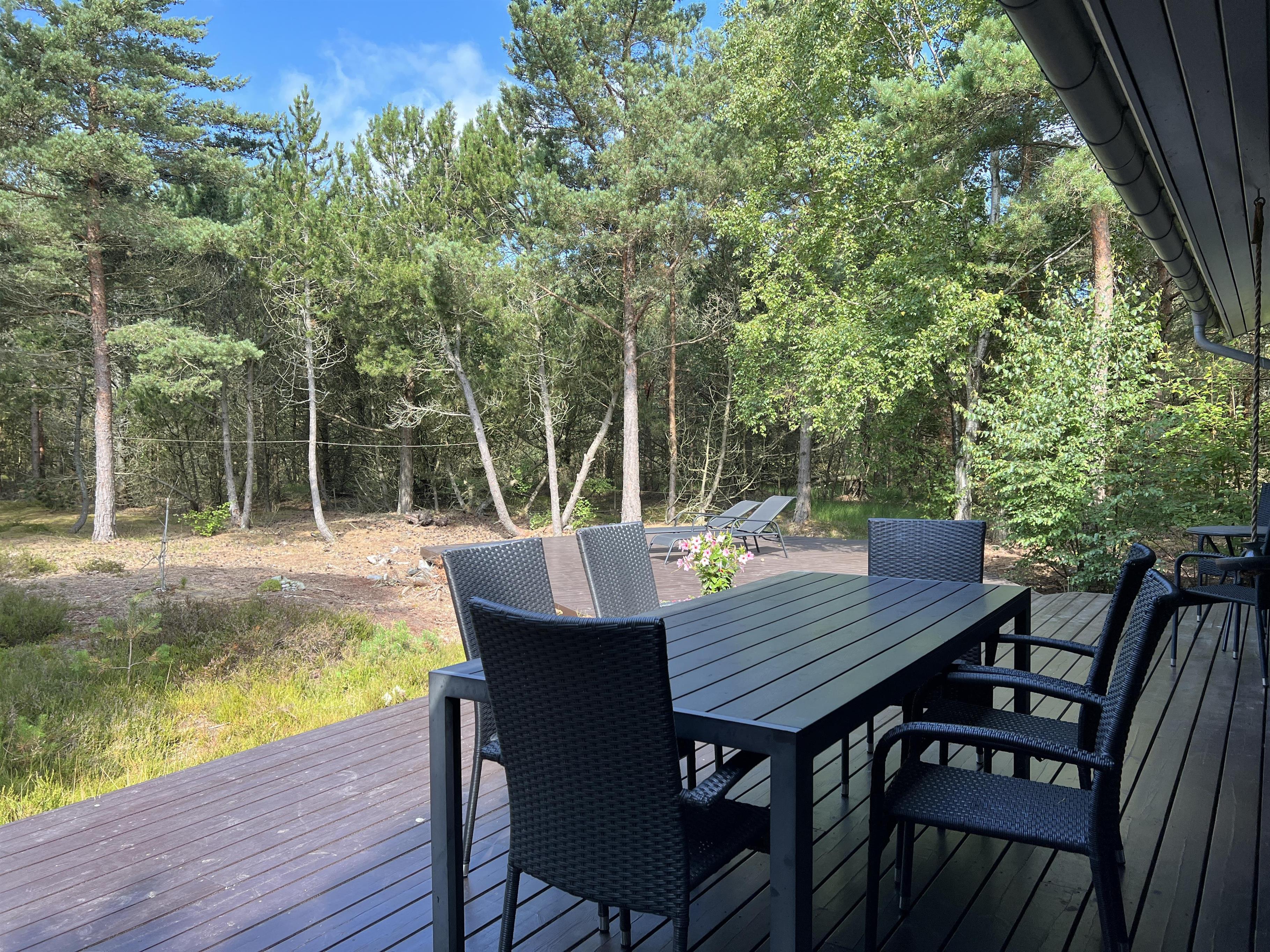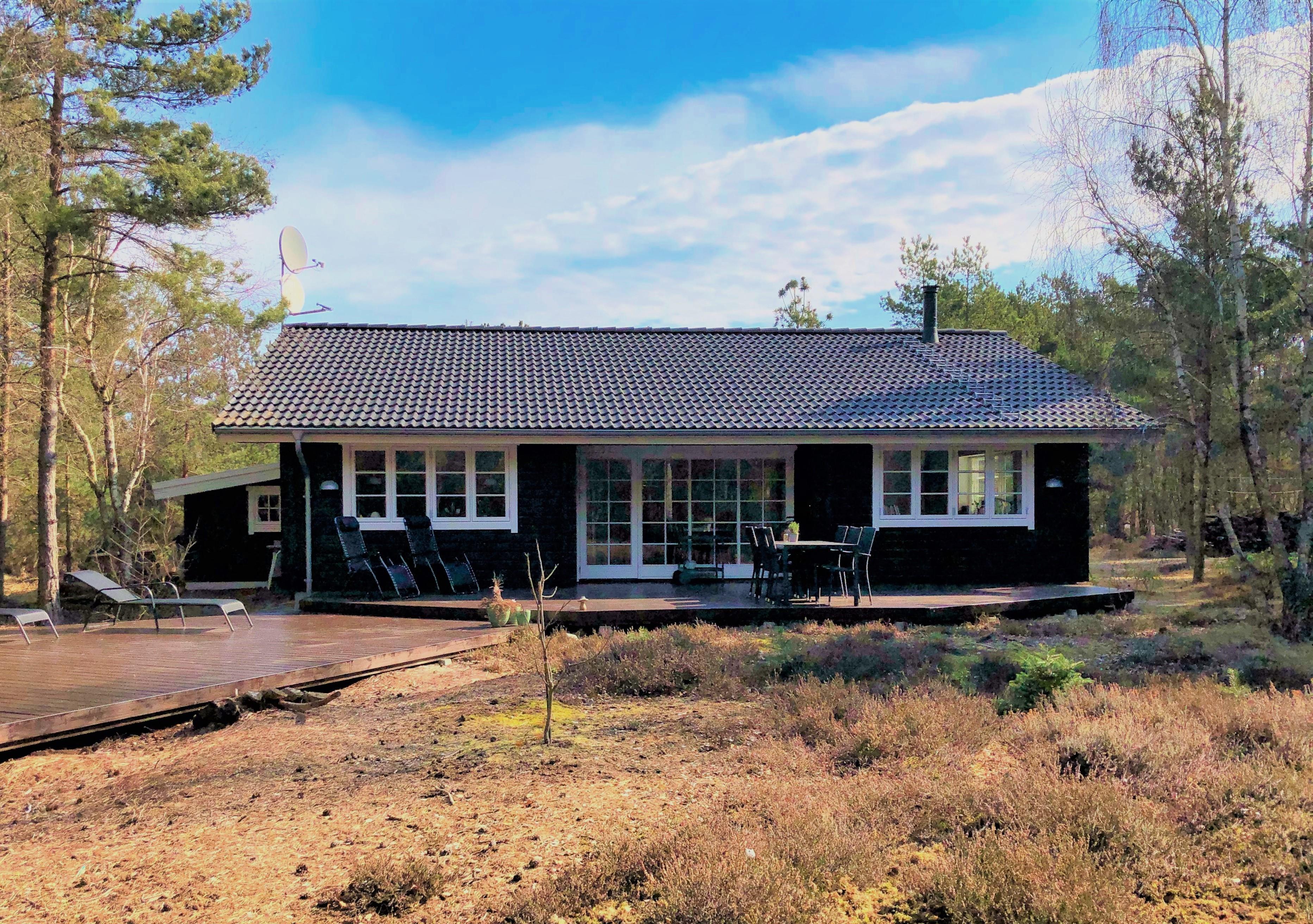 Nyd en dejlig ferie i dette fantastiske feriehus, der er beliggende naturskønt på en flot lyng/naturgrund. Huset byder på en smuk og moderne indretning med dejligt lysindfald og alle moderne faciliteter. To badeværelser med brus, hvoraf det ene også har sauna. Skøn stor opholdsstue med brændeovn, tv og hyggeligt sofa-arrangement. Tre soverum med hhv. to fine dobbeltsenge og to enkeltsenge i et af værelserne. Alt fremstår splinternyt og lækkert. Der er flere delvis overdækkede træterrasser ved huset og fine havemøbler.