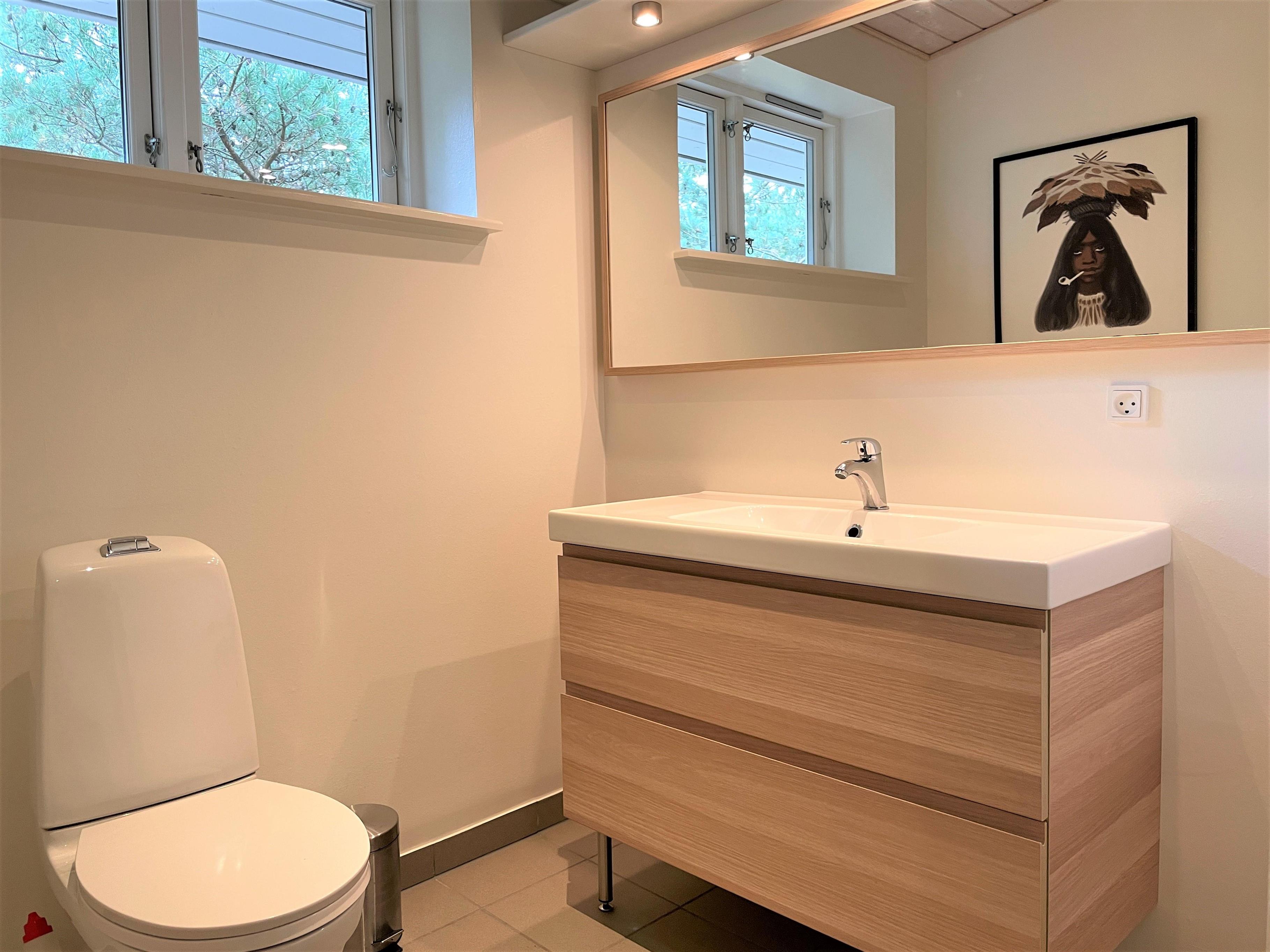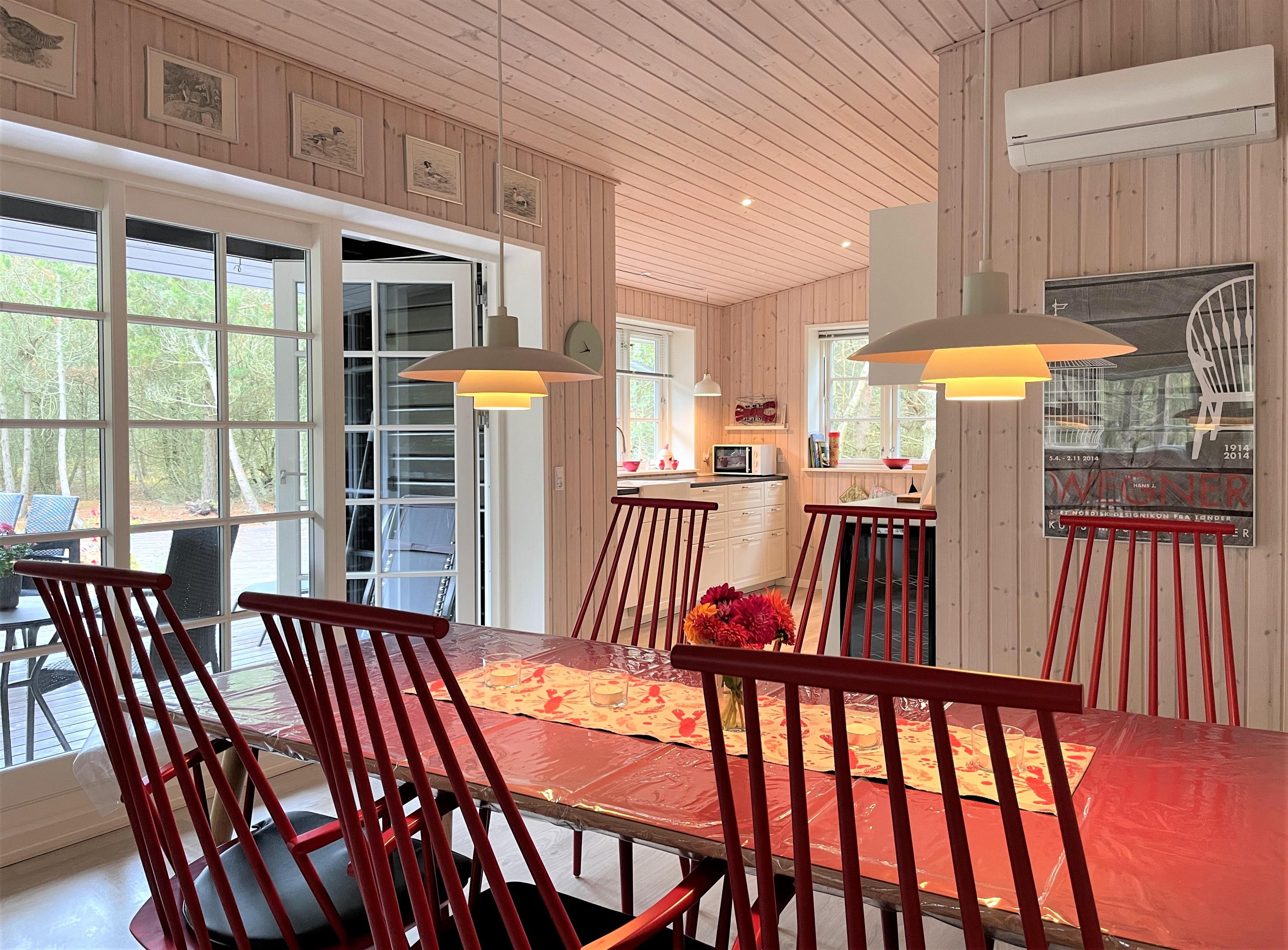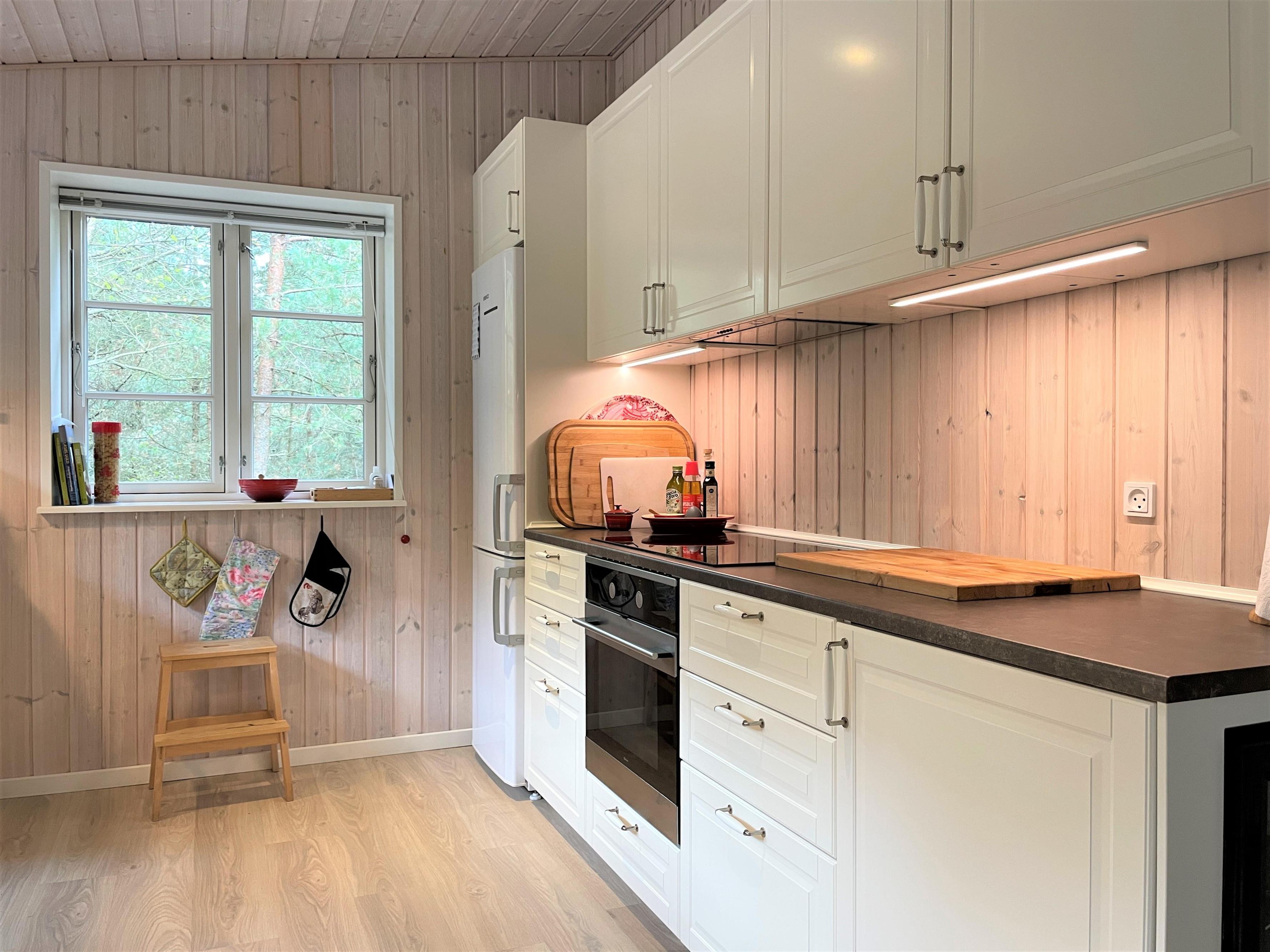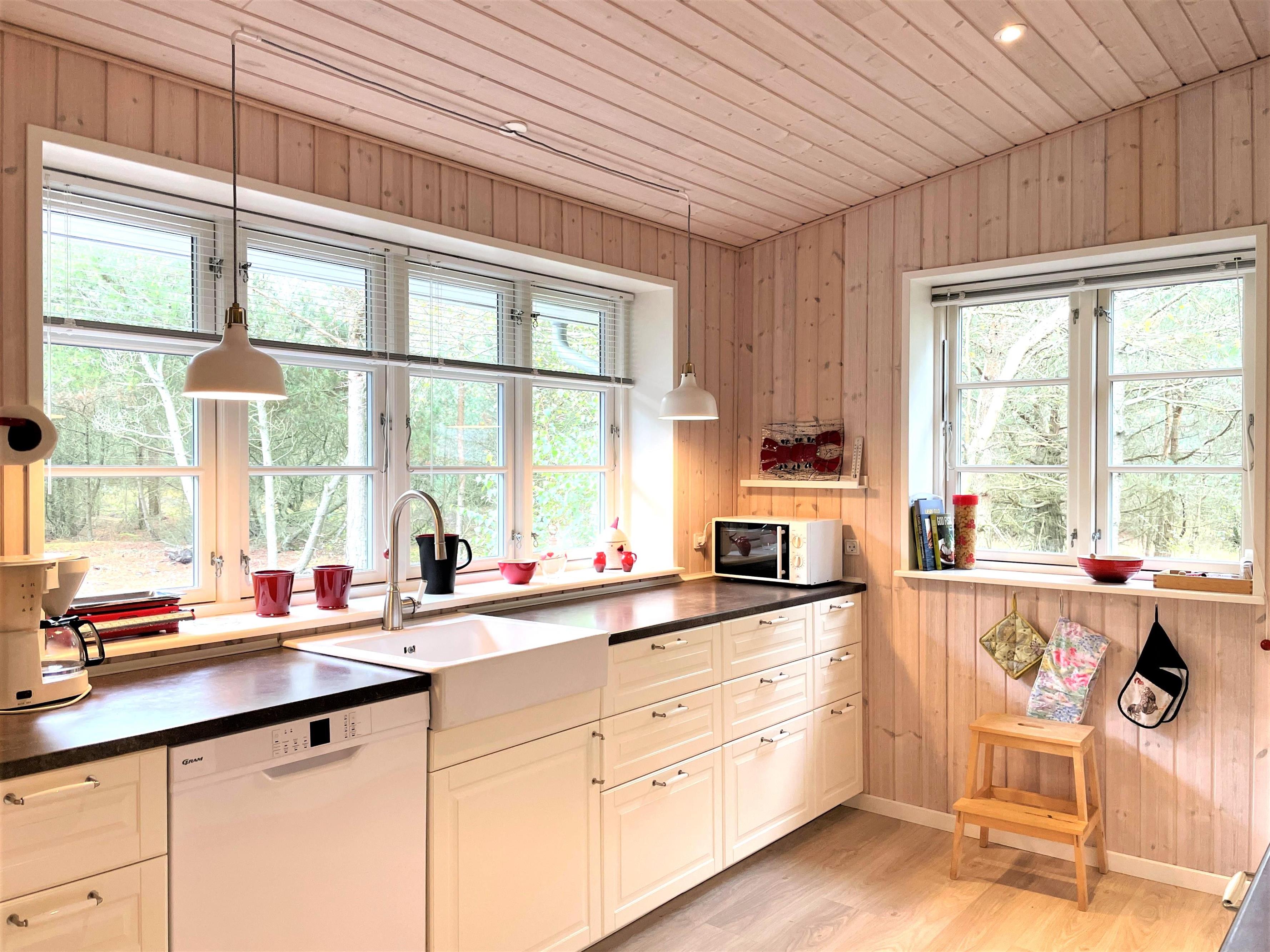 Nyd en dejlig ferie i dette fantastiske feriehus, der er beliggende naturskønt på en flot lyng/naturgrund. Huset byder på en smuk og moderne indretning med dejligt lysindfald og alle moderne faciliteter. To badeværelser med brus, hvoraf det ene også har sauna. Skøn stor opholdsstue med brændeovn, tv og hyggeligt sofa-arrangement. Tre soverum med hhv. to fine dobbeltsenge og to enkeltsenge i et af værelserne. Alt fremstår splinternyt og lækkert. Der er flere delvis overdækkede træterrasser ved huset og fine havemøbler.
