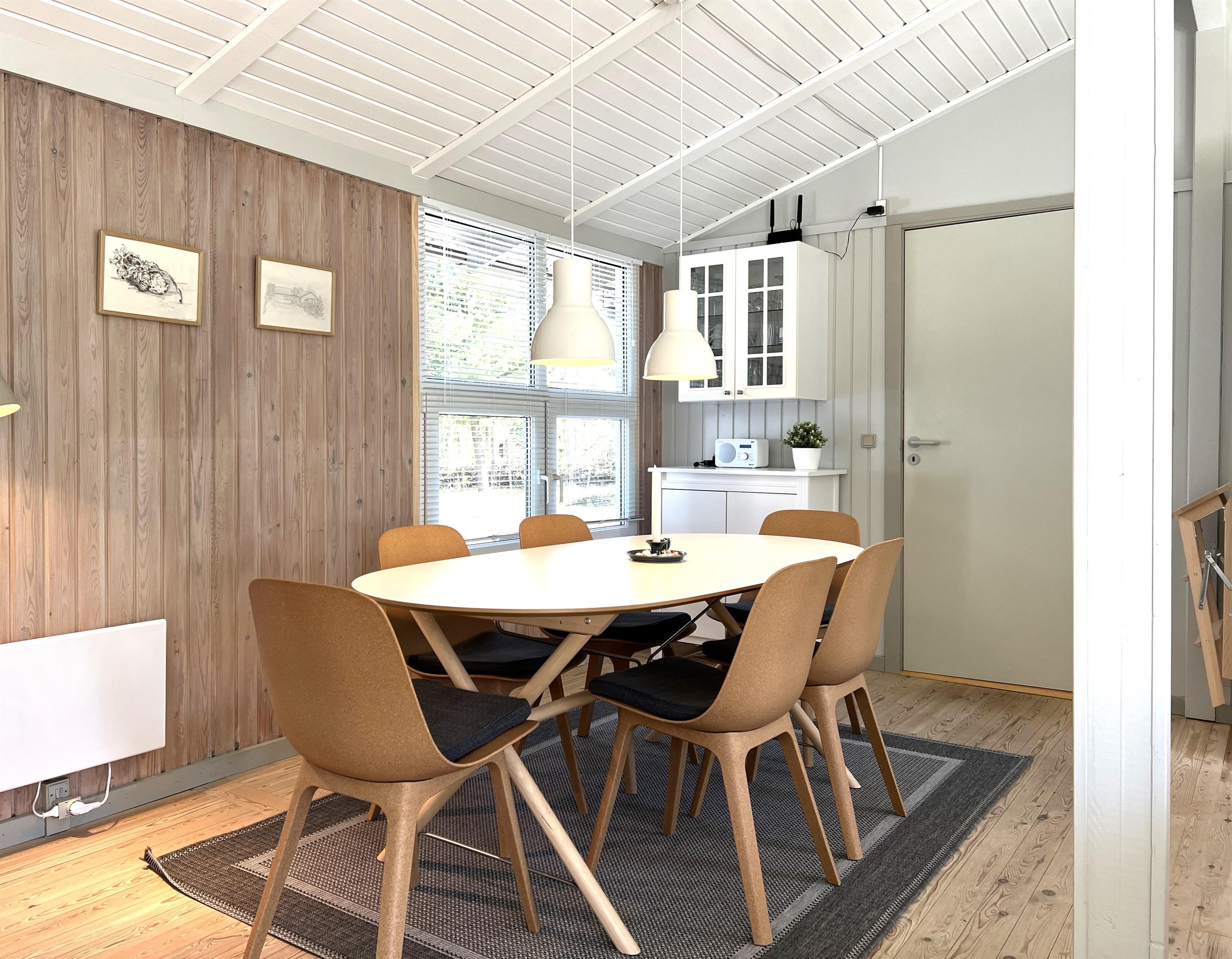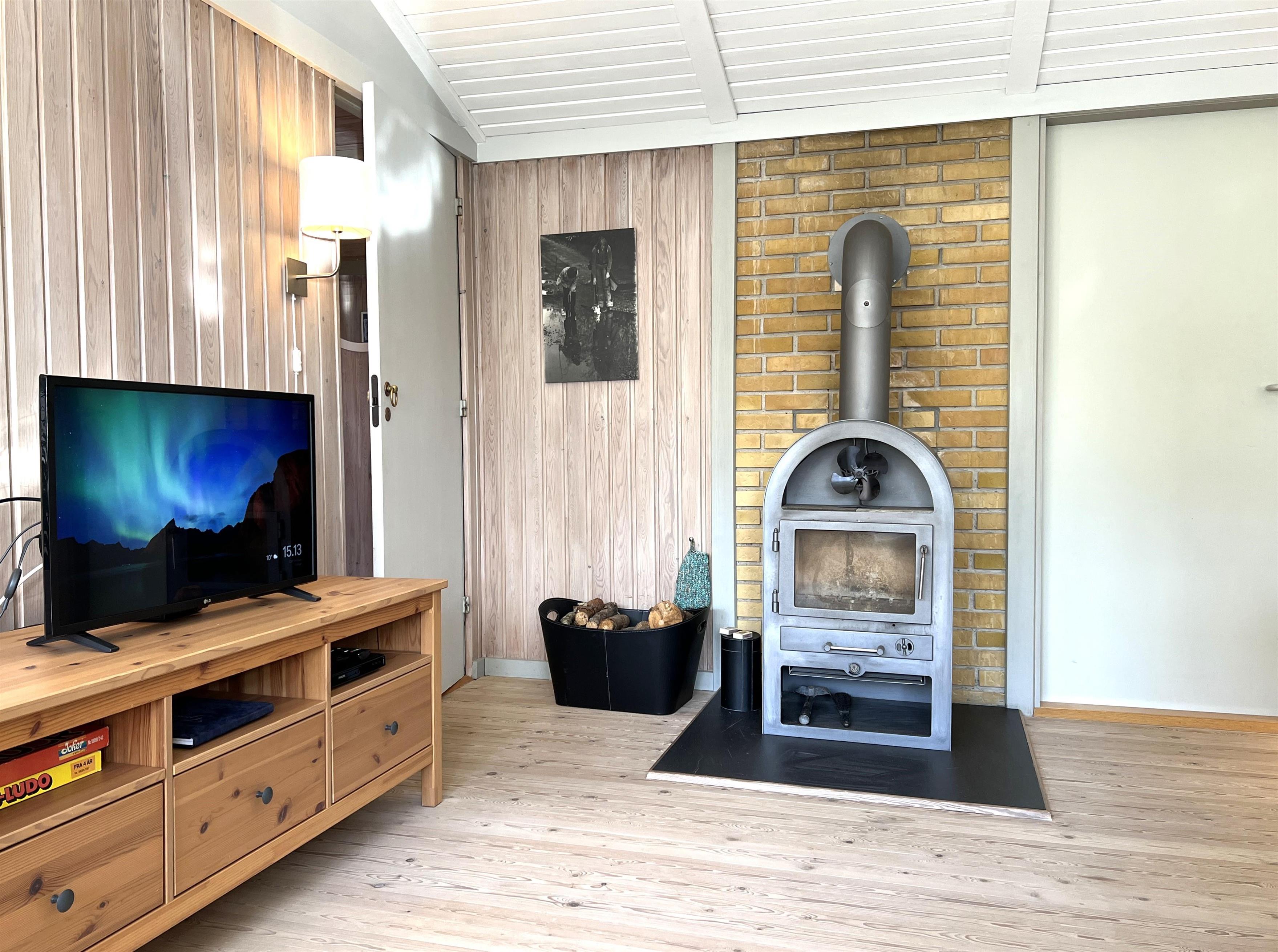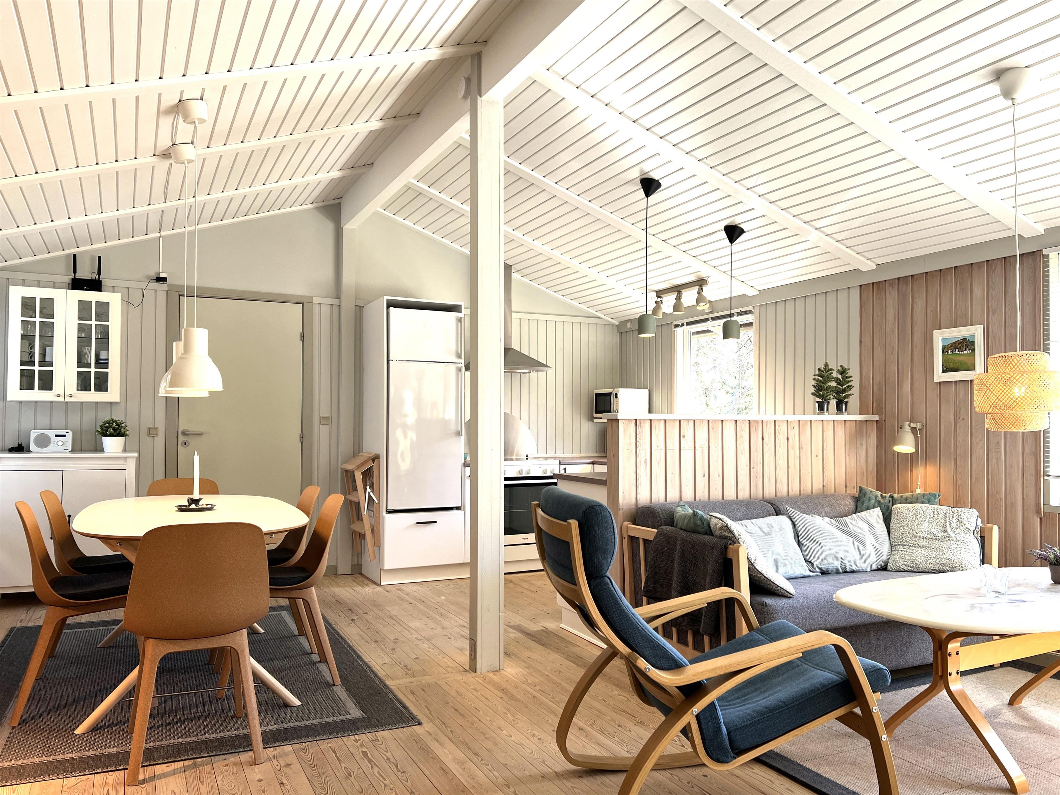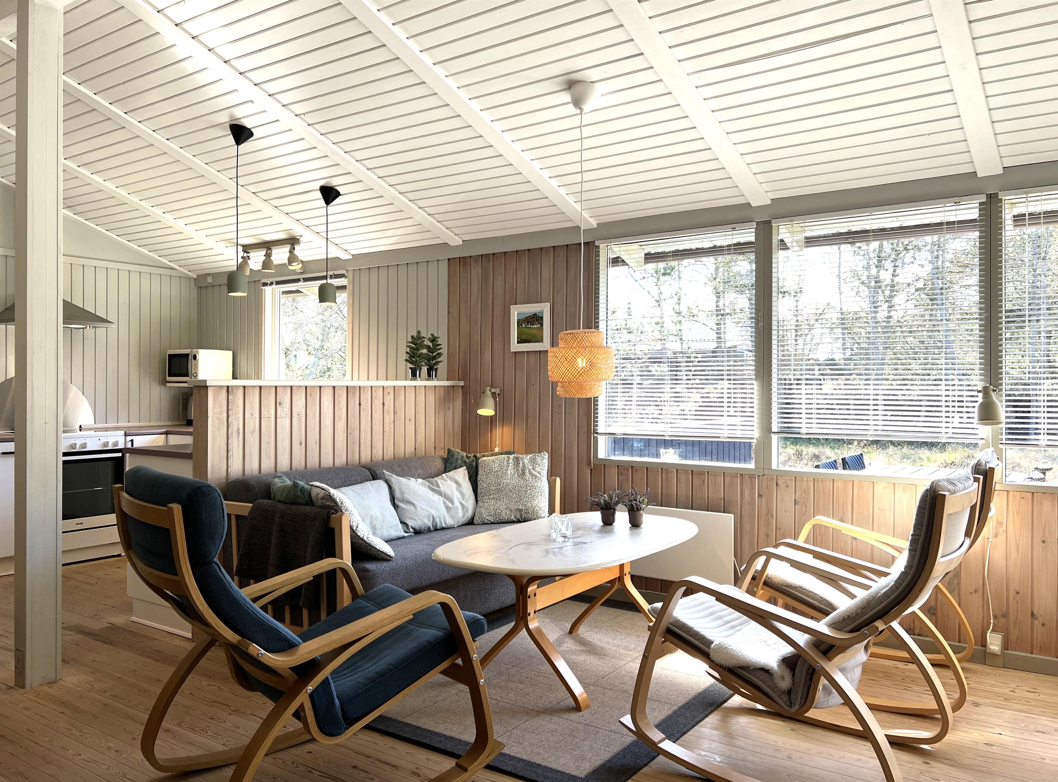 Huset har et fint, lyst køkken/alrum med spisebord, samt stue med gode møbler og brændeovn. Tre soveværelser, alle med dobbeltseng. I et af værelserne kan sengene skilles ad til enkeltsenge. Fint badeværelse med brus.