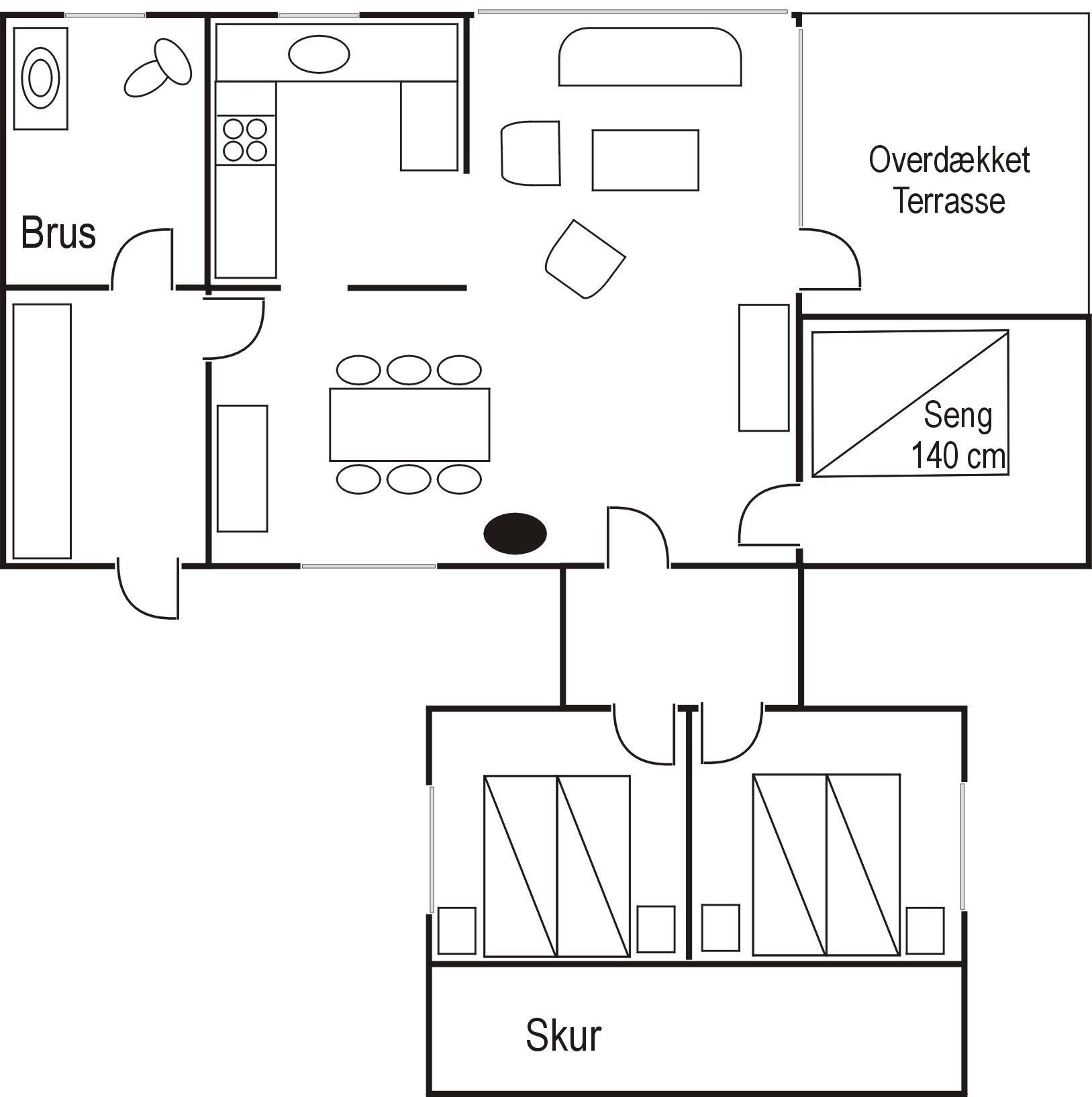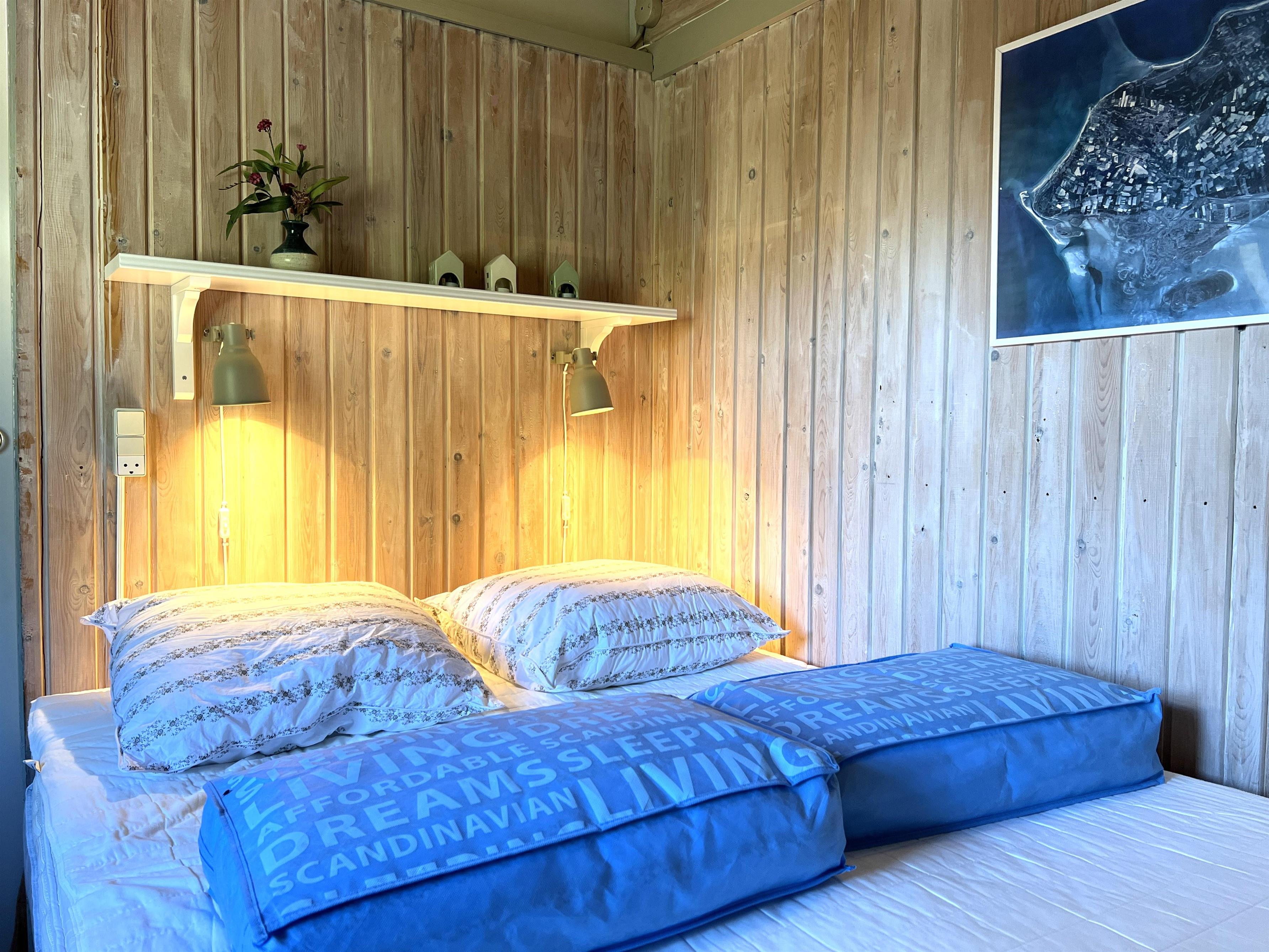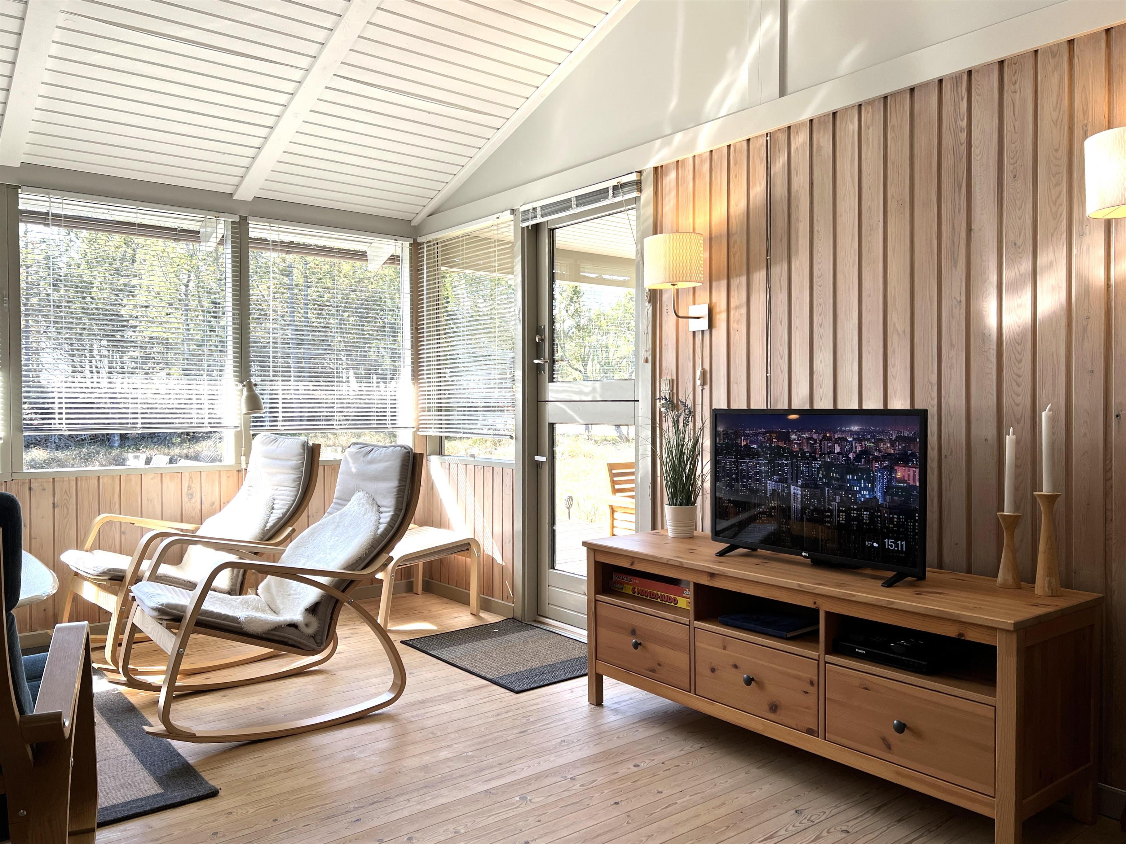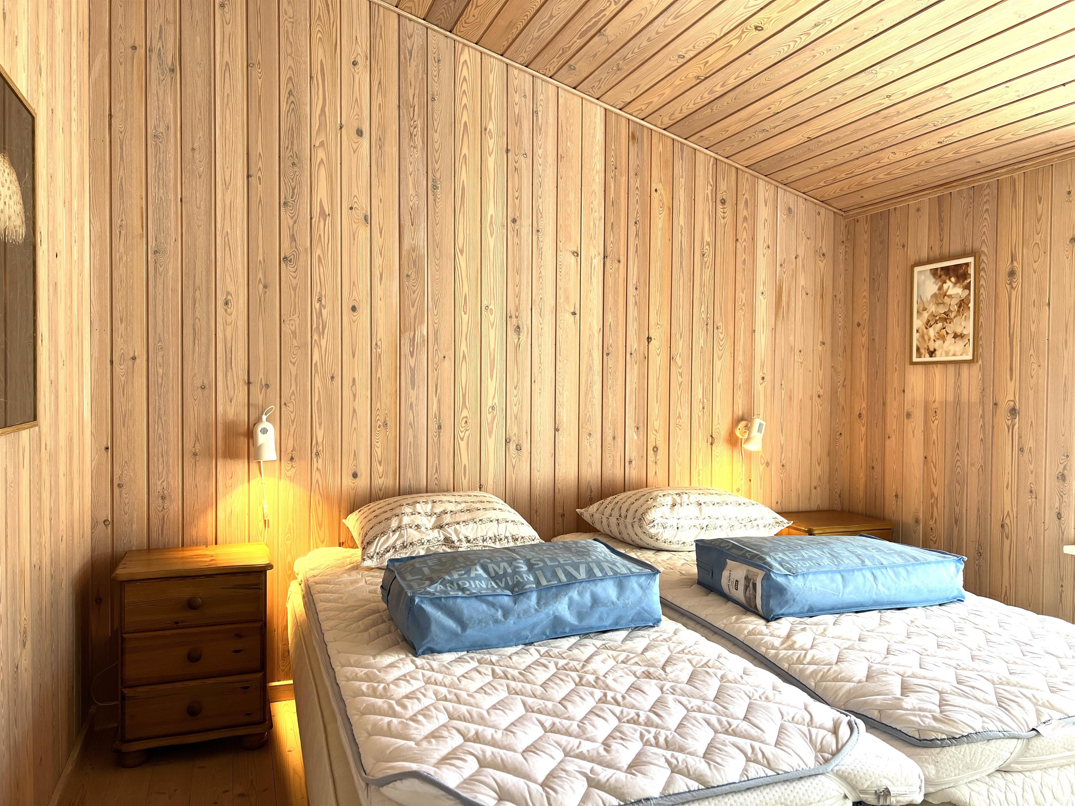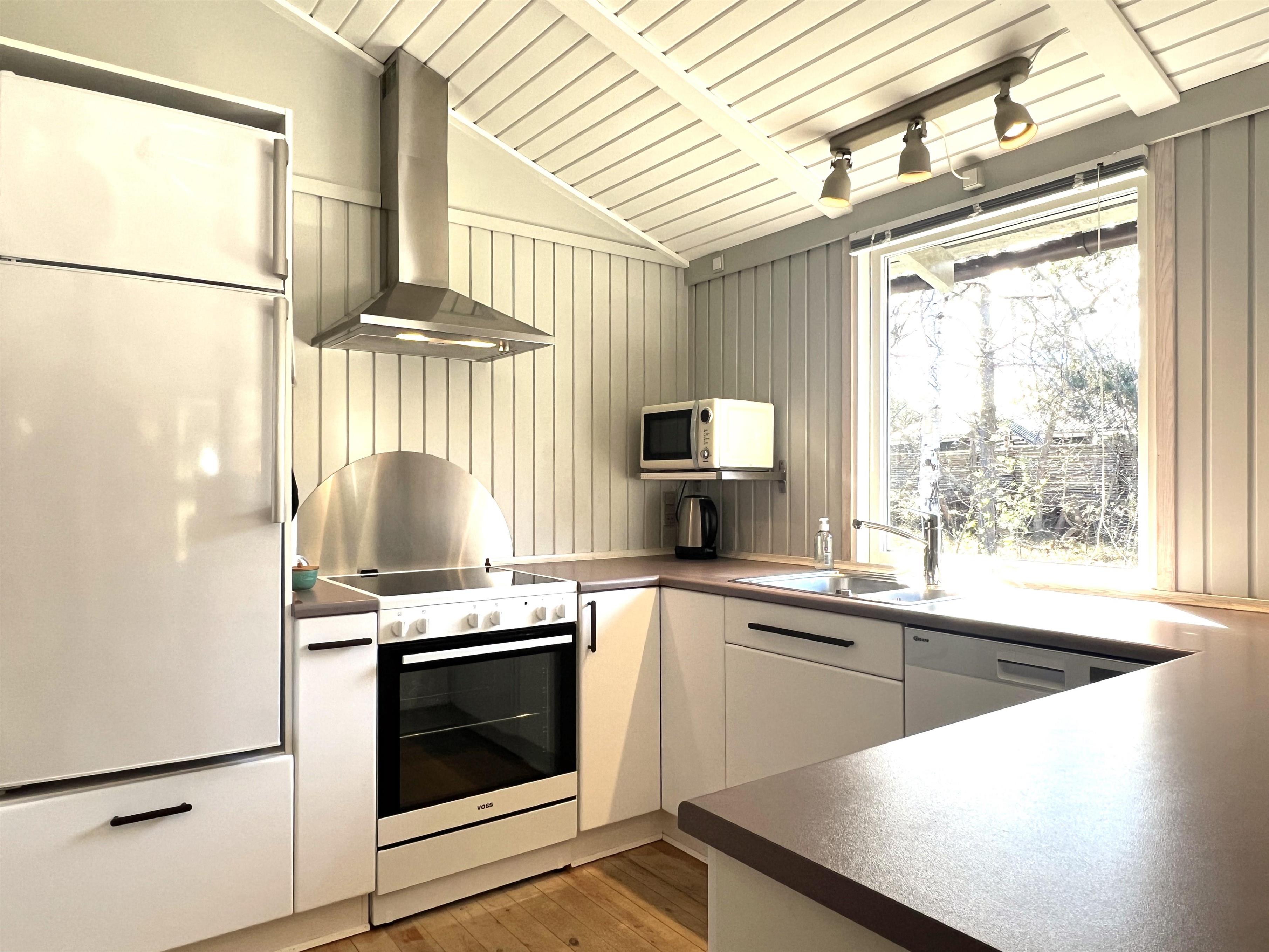 Huset har et fint, lyst køkken/alrum med spisebord, samt stue med gode møbler og brændeovn. Tre soveværelser, alle med dobbeltseng. I et af værelserne kan sengene skilles ad til enkeltsenge. Fint badeværelse med brus.