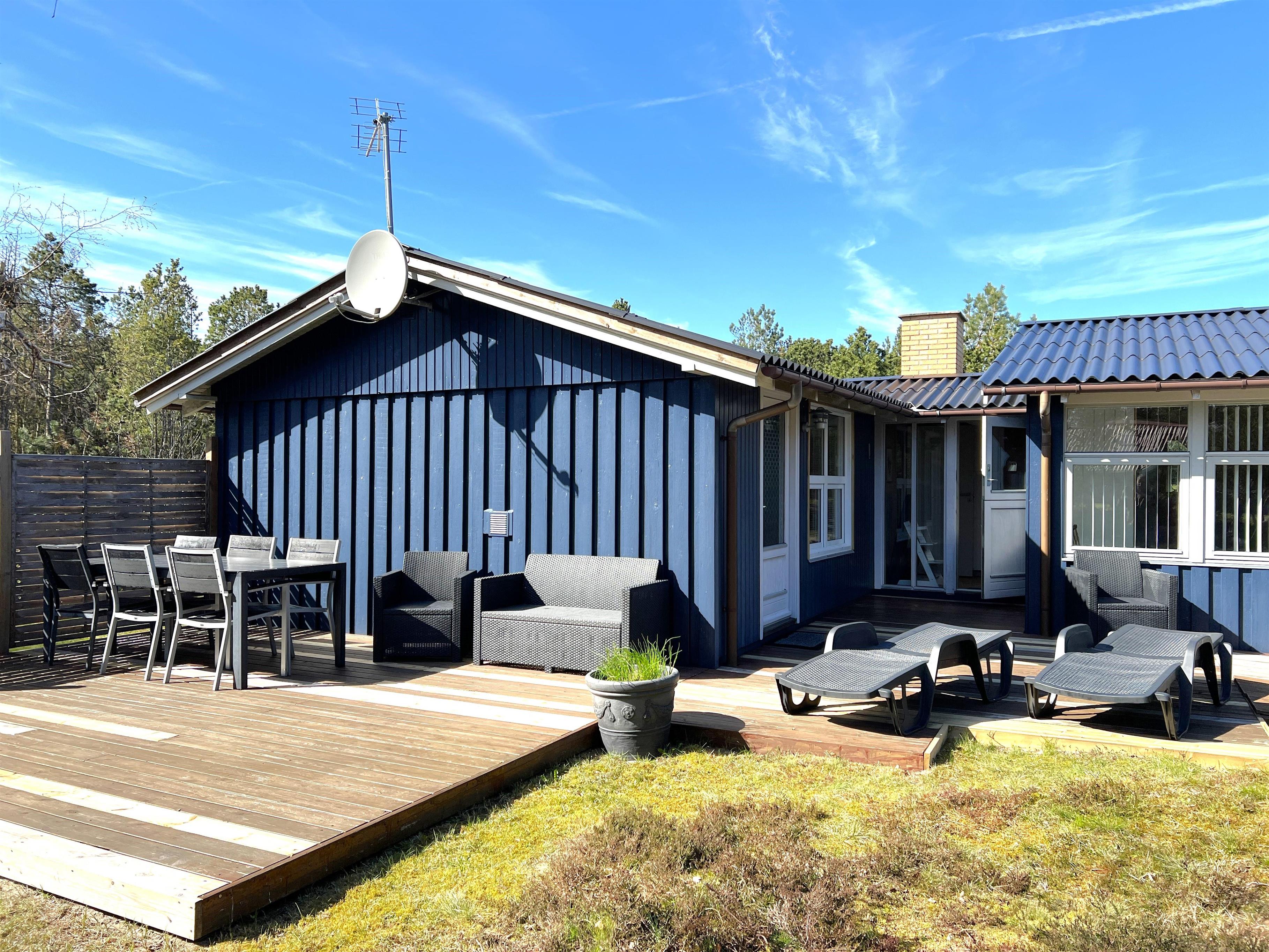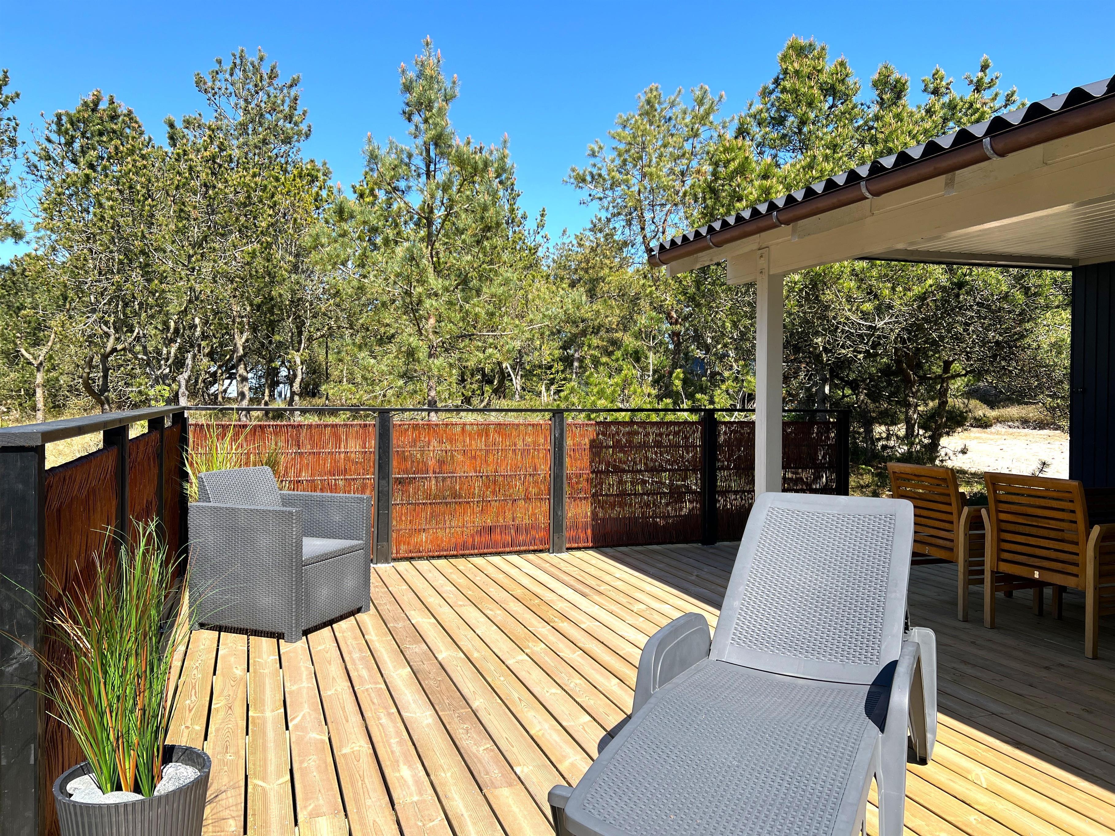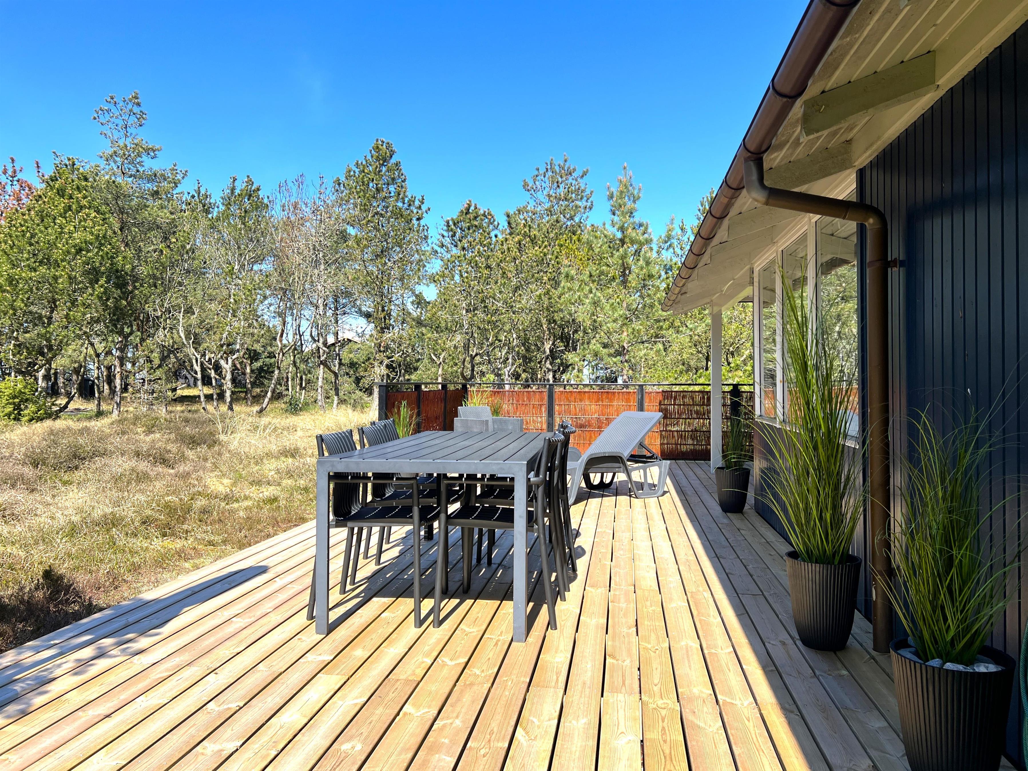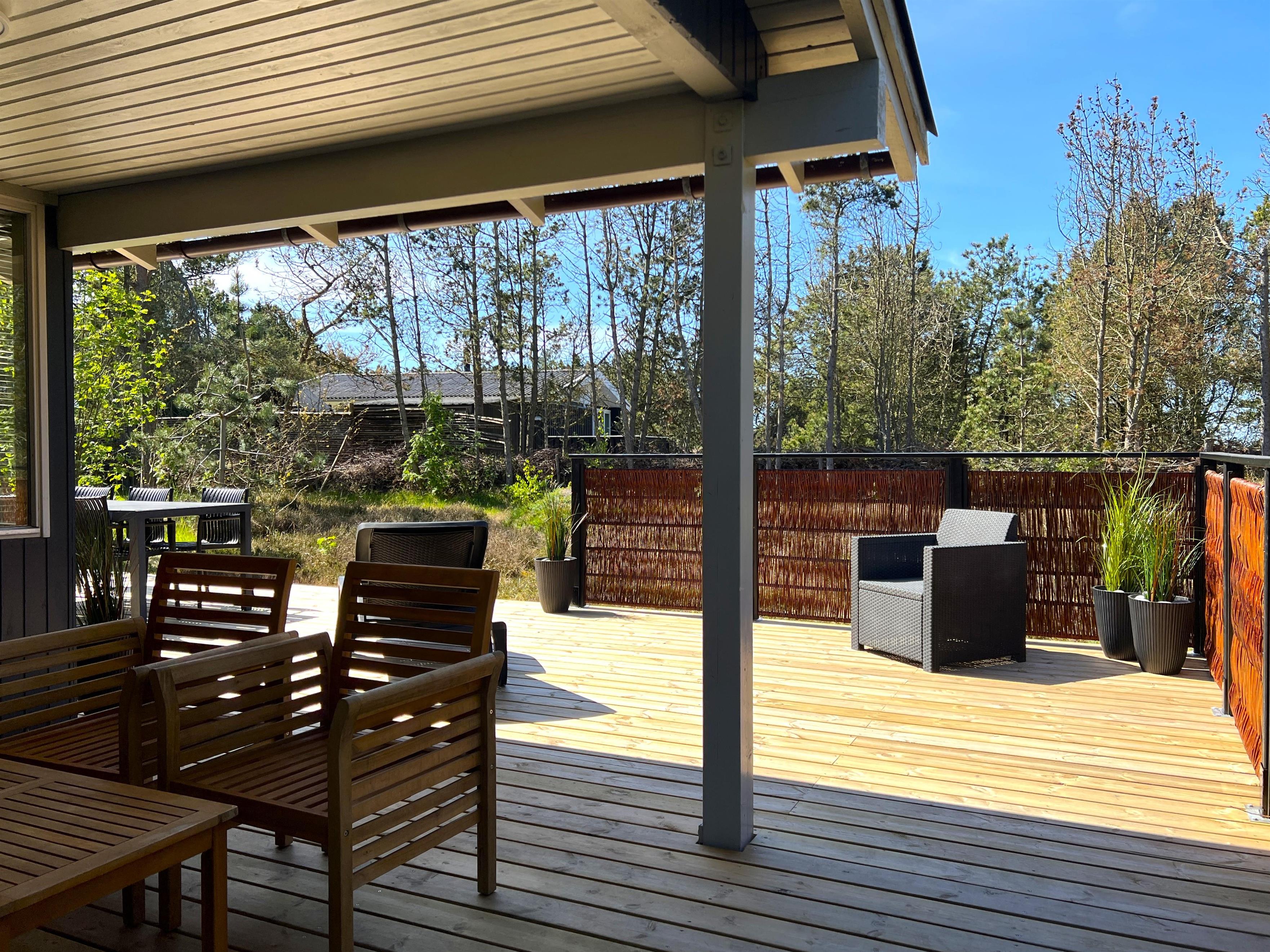 Der er flere dejlige velmøblerede terrasser rundt huset, hvor man altid kan finde en hyggelig krog med sol og læ, derudover også delvis overdækket terrasse.