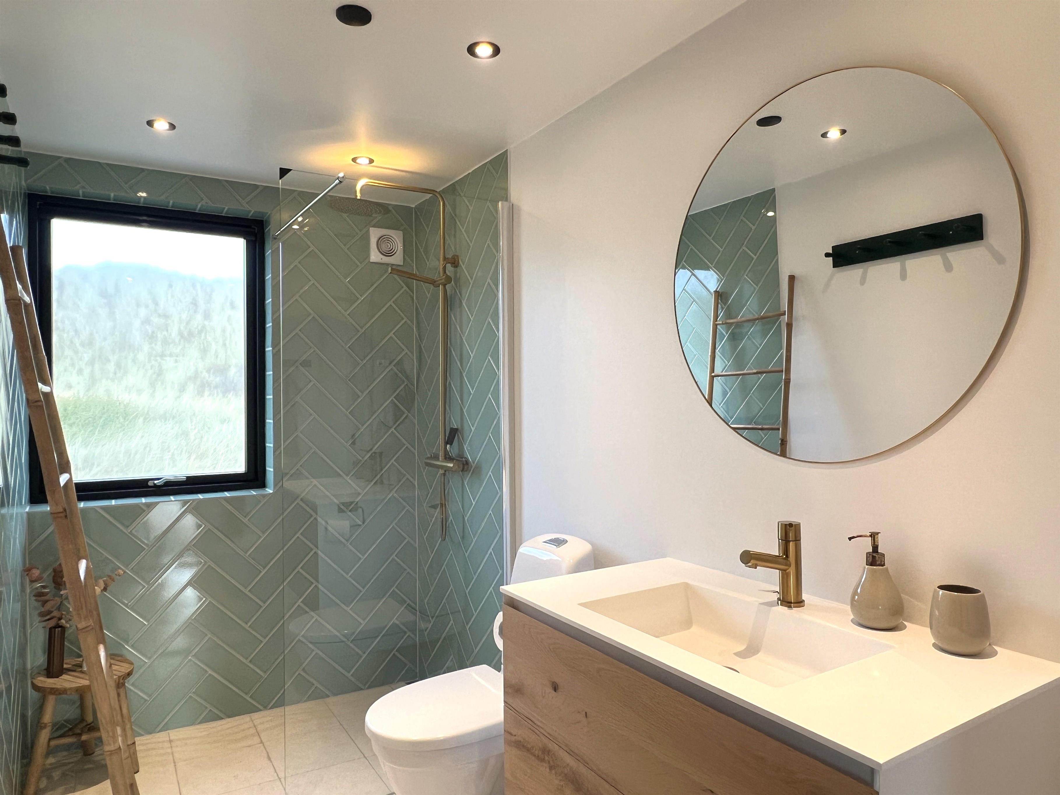Dejligt badeværelse med brus og to soverum med dobbeltsenge og en udsigt, der gør morgenstunden til noget helt specielt. Fint anneks, med en lidt mindre dobbeltseng.