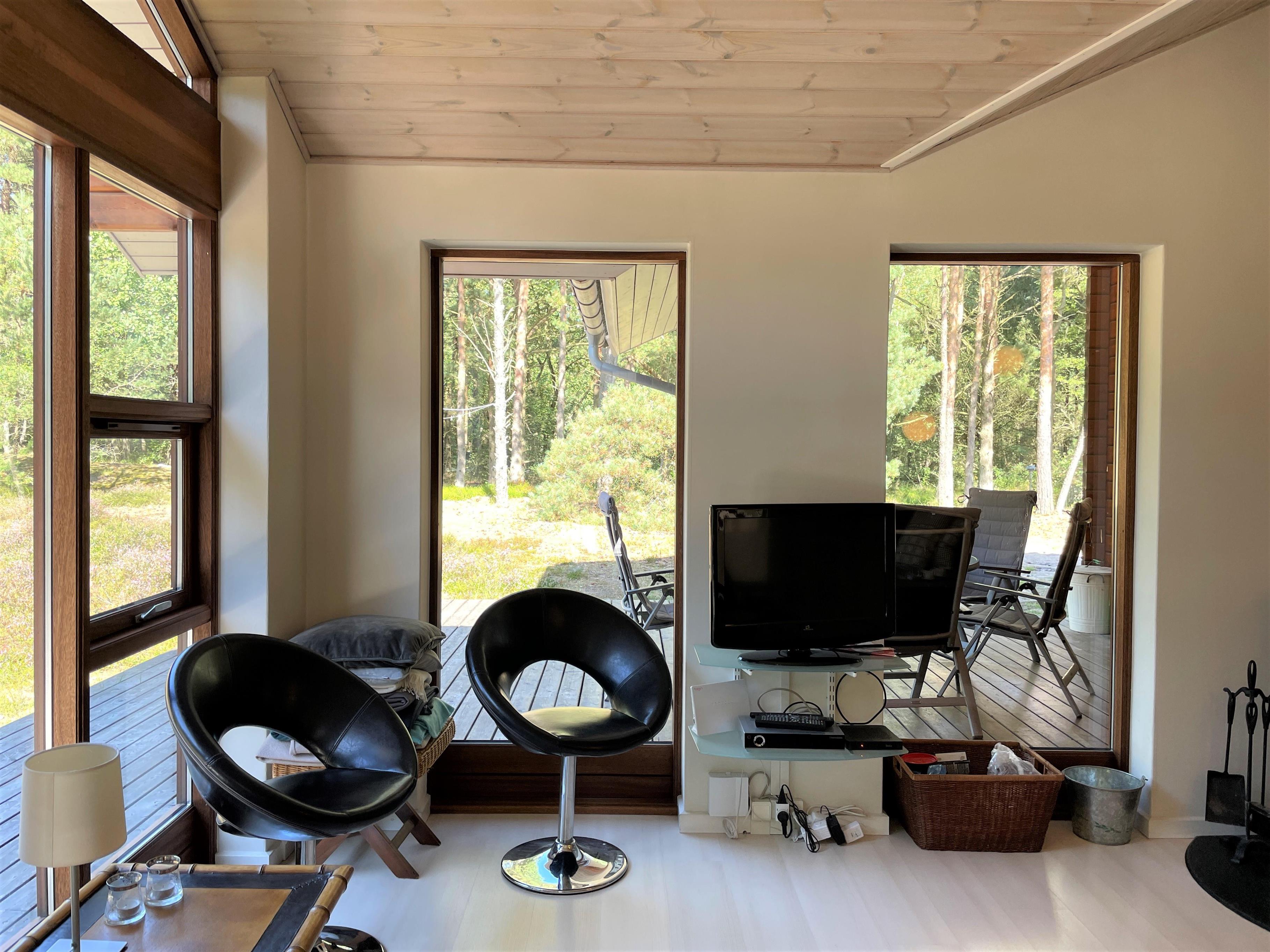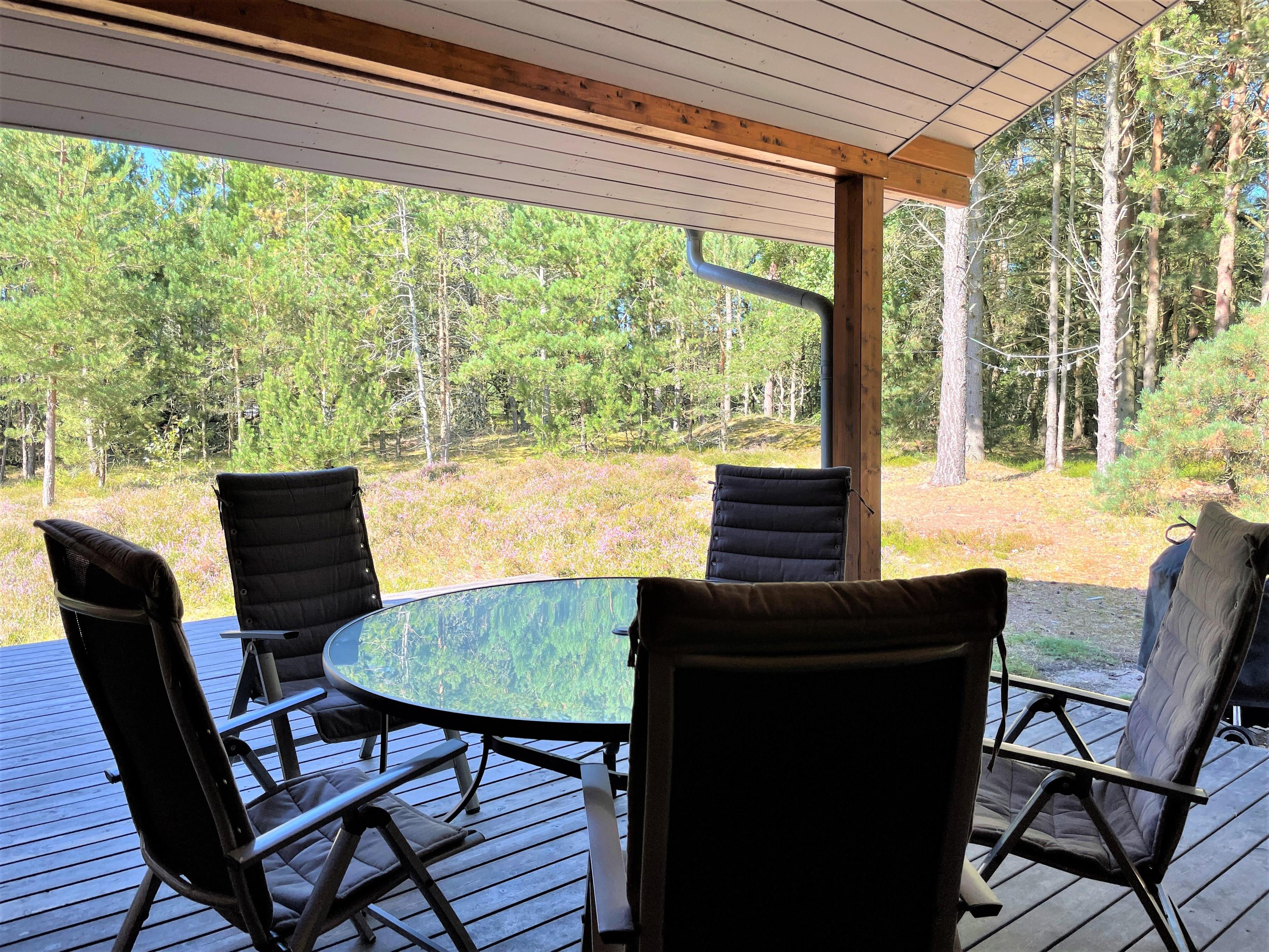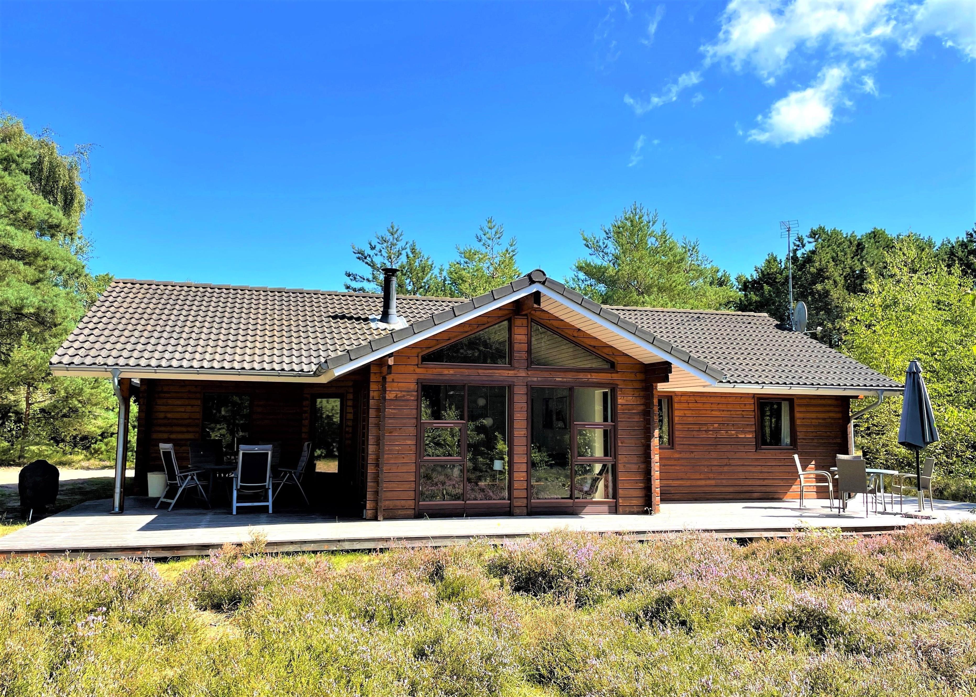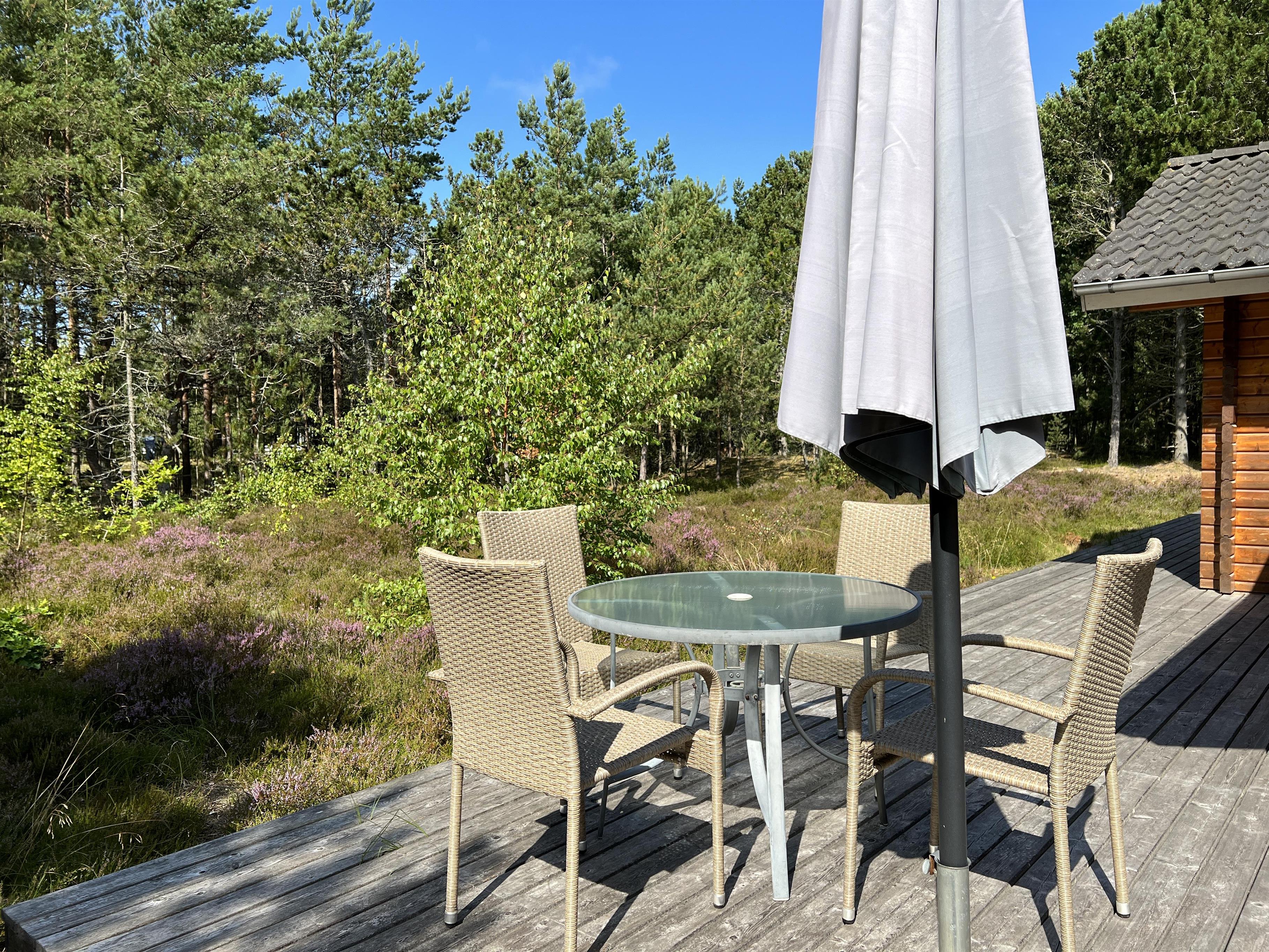 Skøn terrasse rundt om huset, hvorpå man kan nyde solrige dage og varme sommeraftener. Skøn udsigt til lyngområde og dejlig, privat grund.