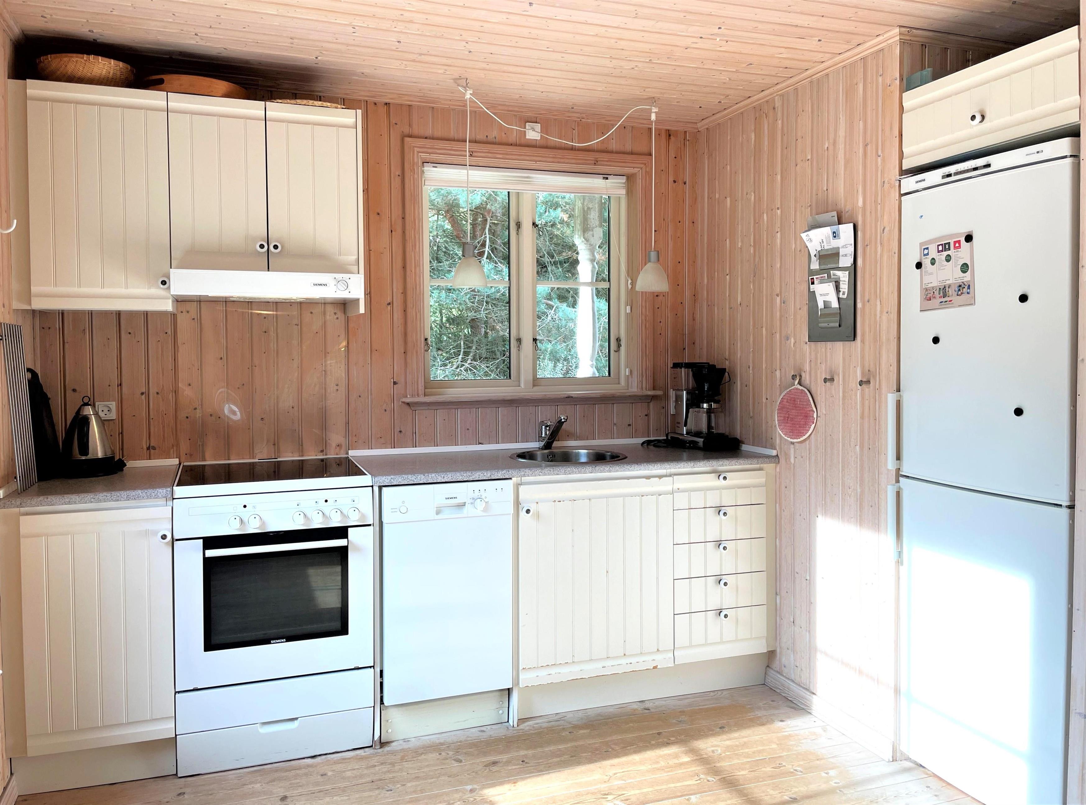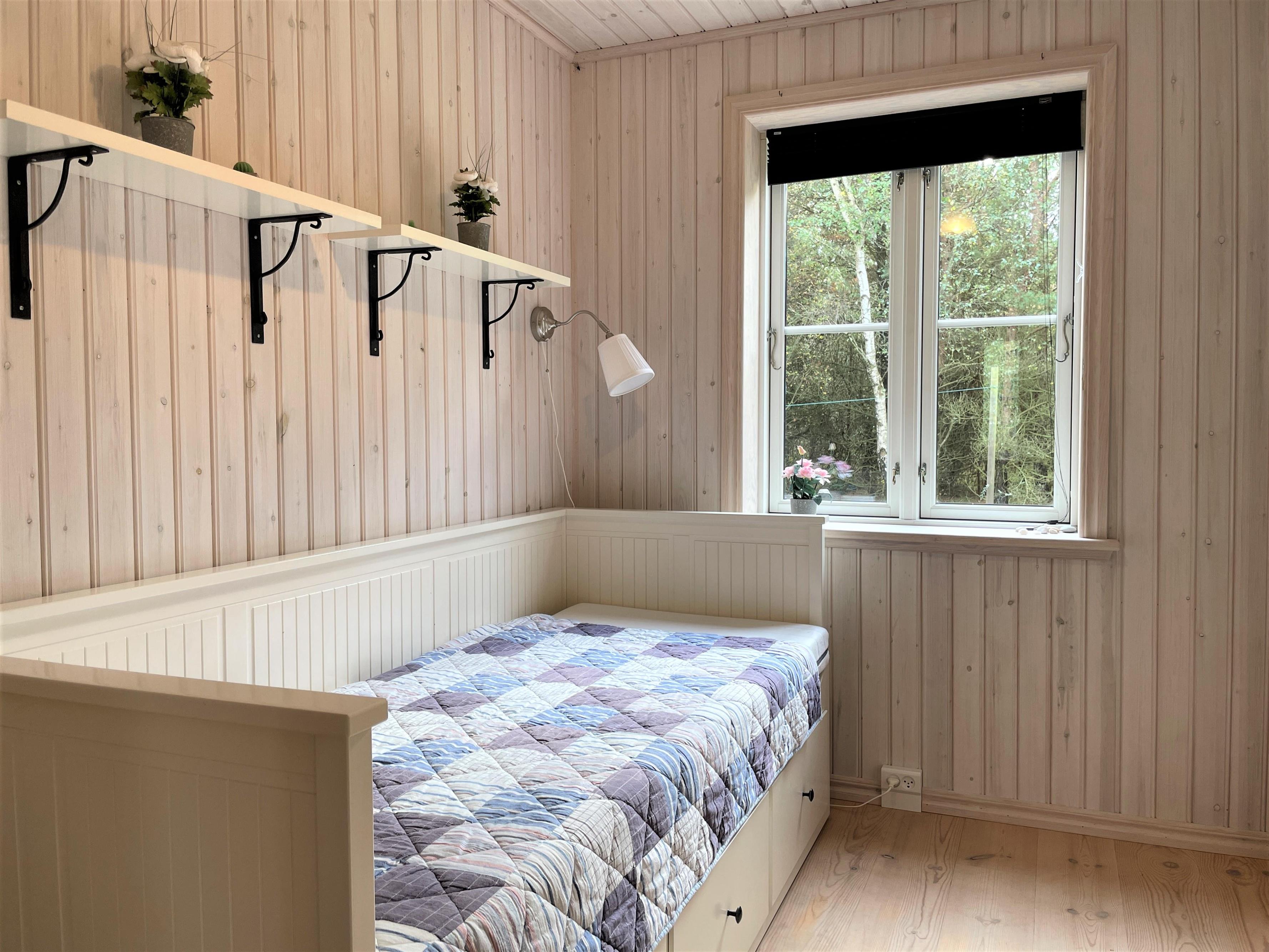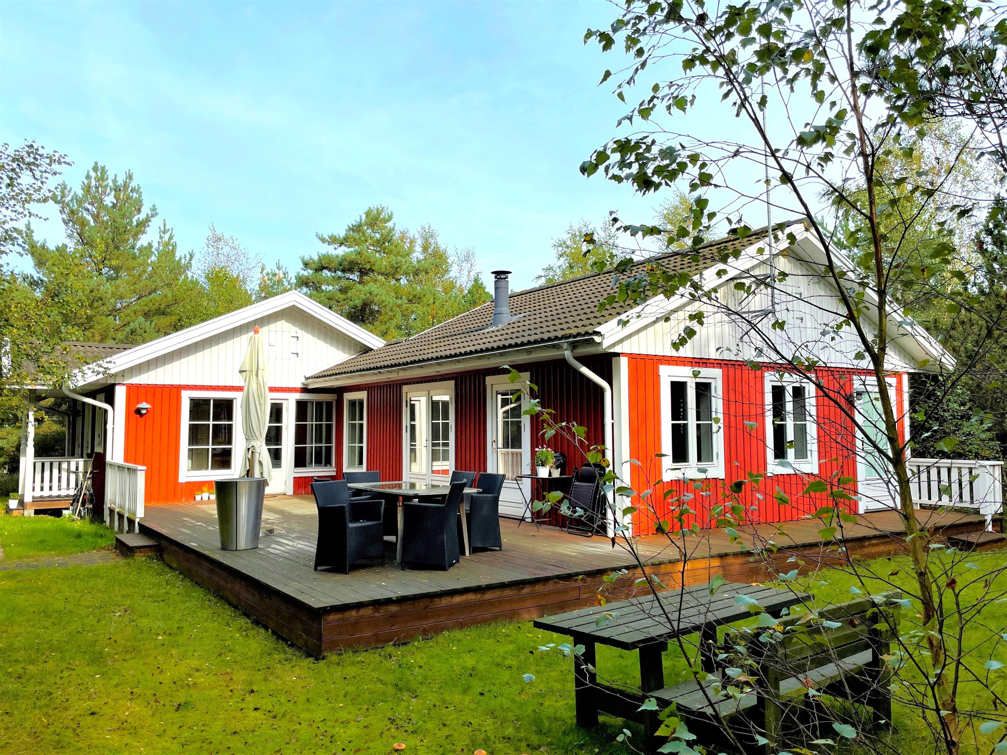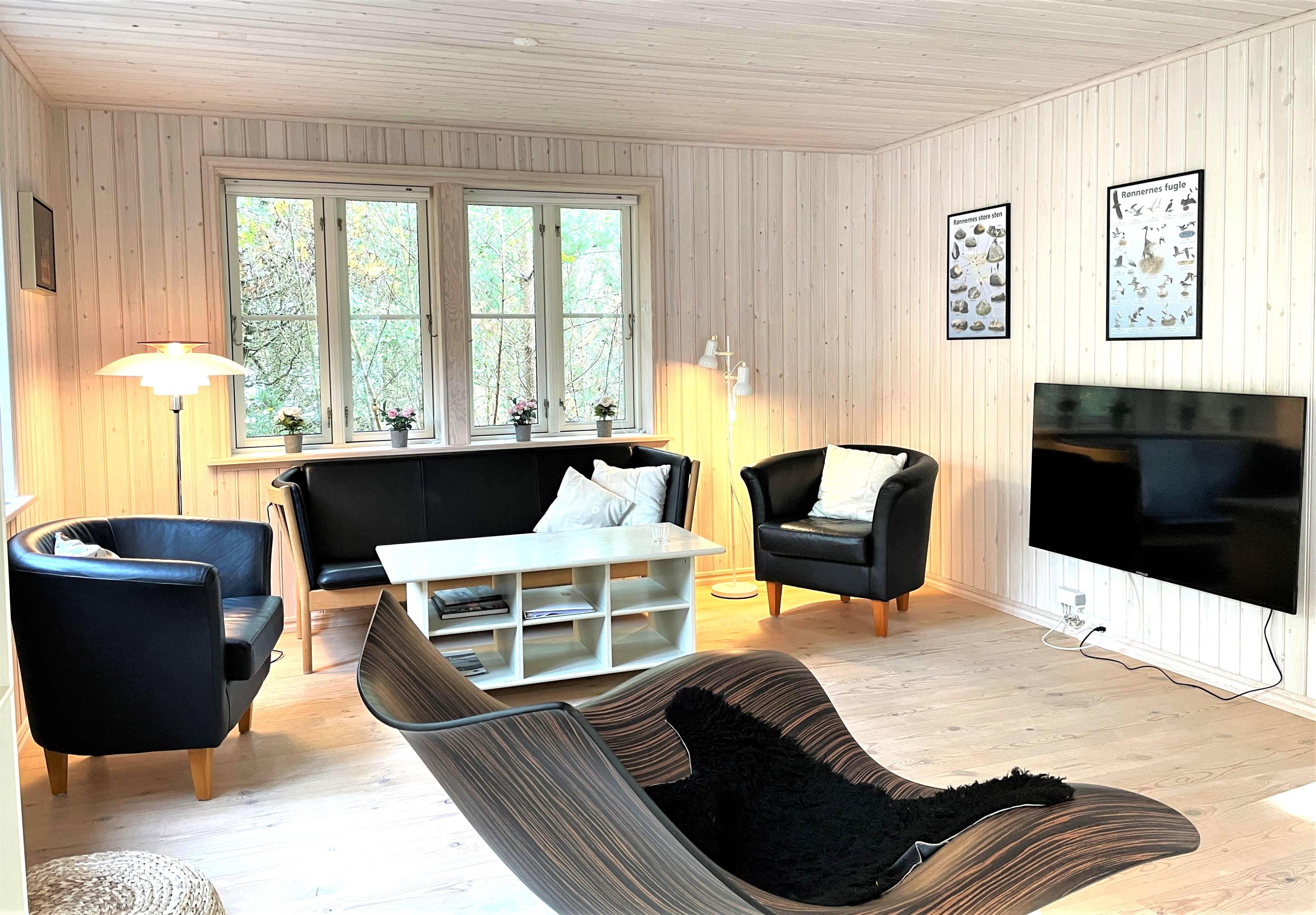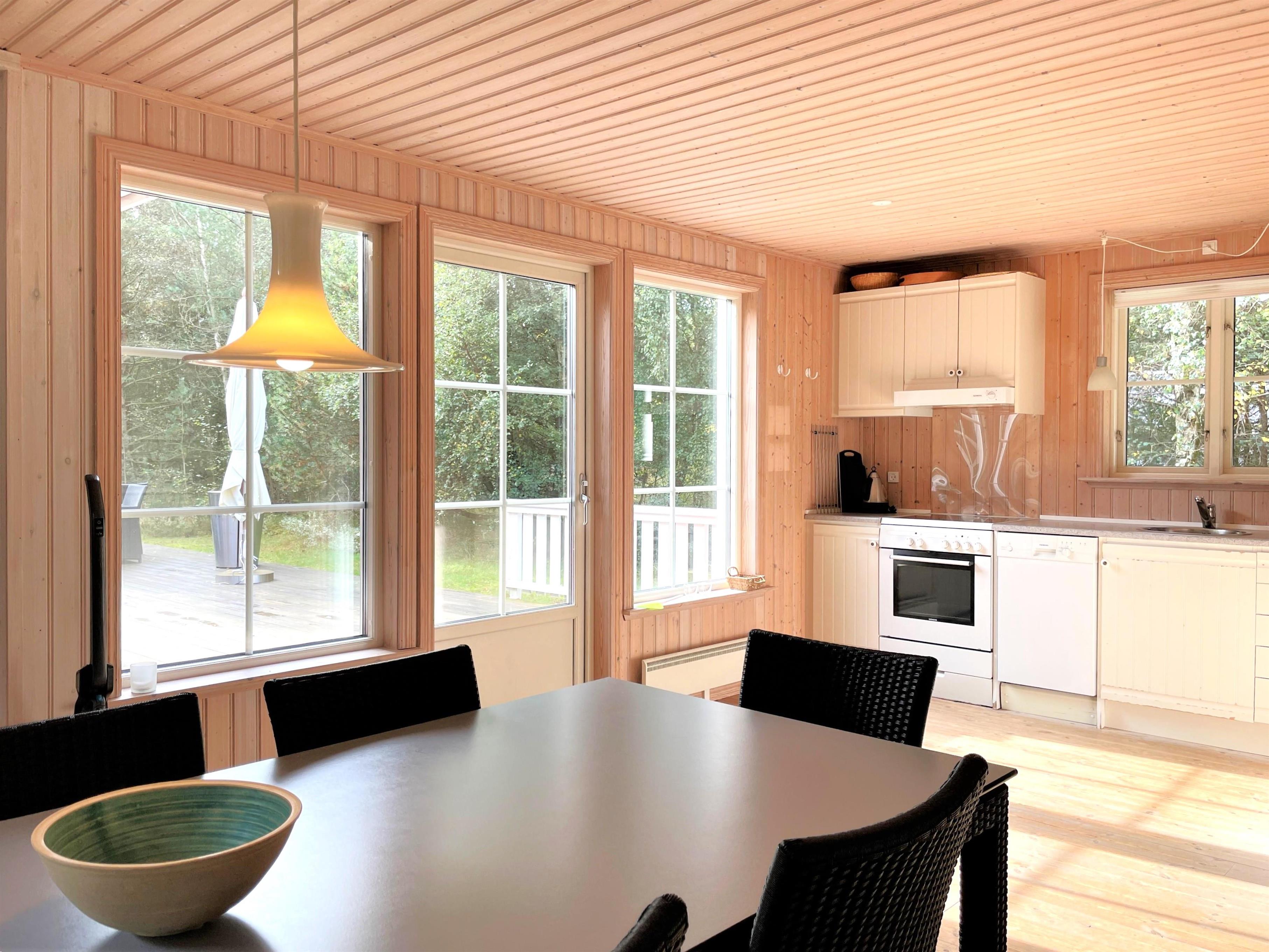 Flot og velholdt træhus, lyst og moderne. Stor køkken/spisestue med udgang til terrasse. Dejlig opholdsstue med brændeovn, og herfra udgang til stor træterrasse. Badeværelse med brusehjørne og gulvvarme. Et værelse med dobbeltseng. Tre værelser med sovesofaer til udtræk.