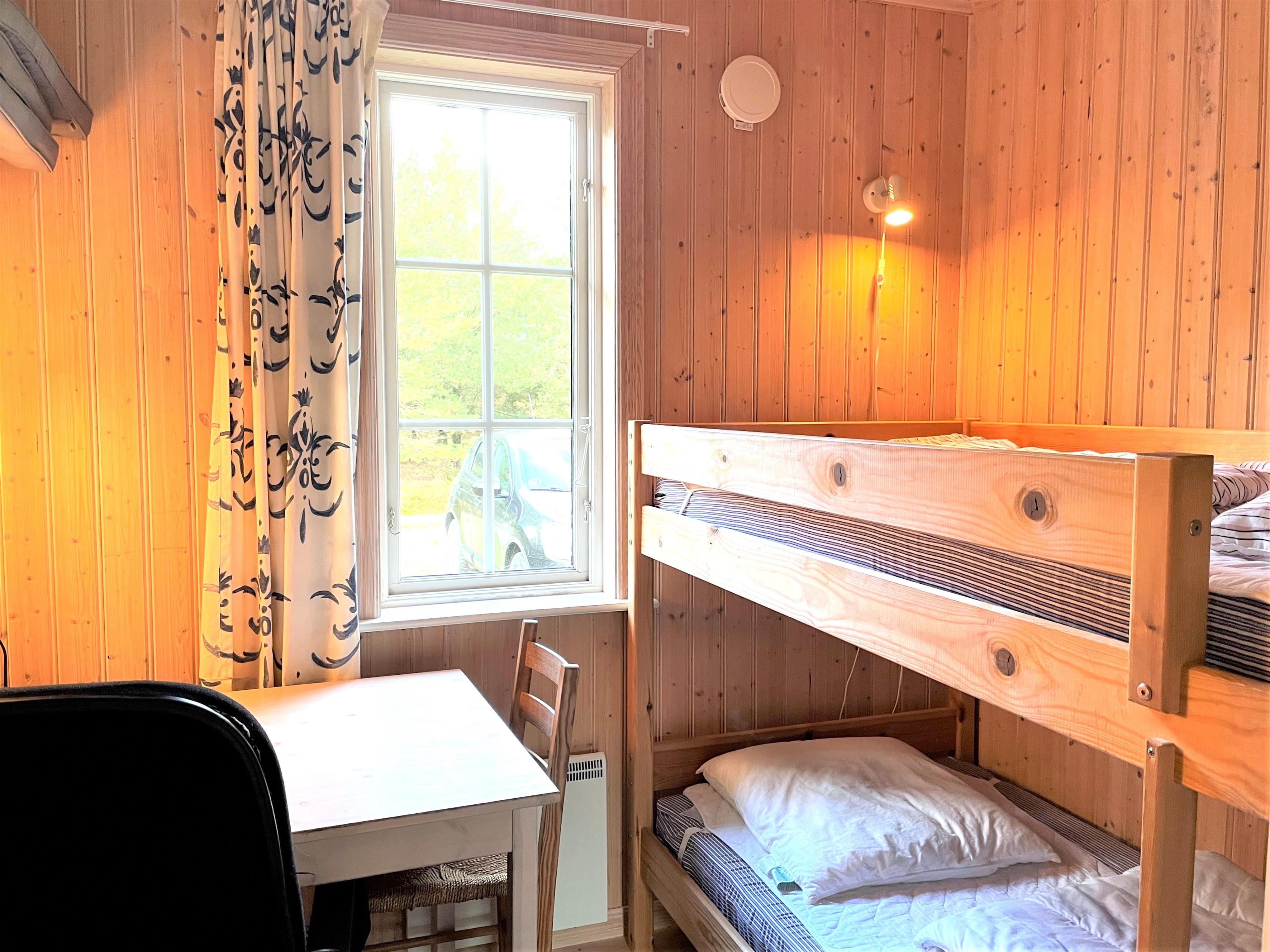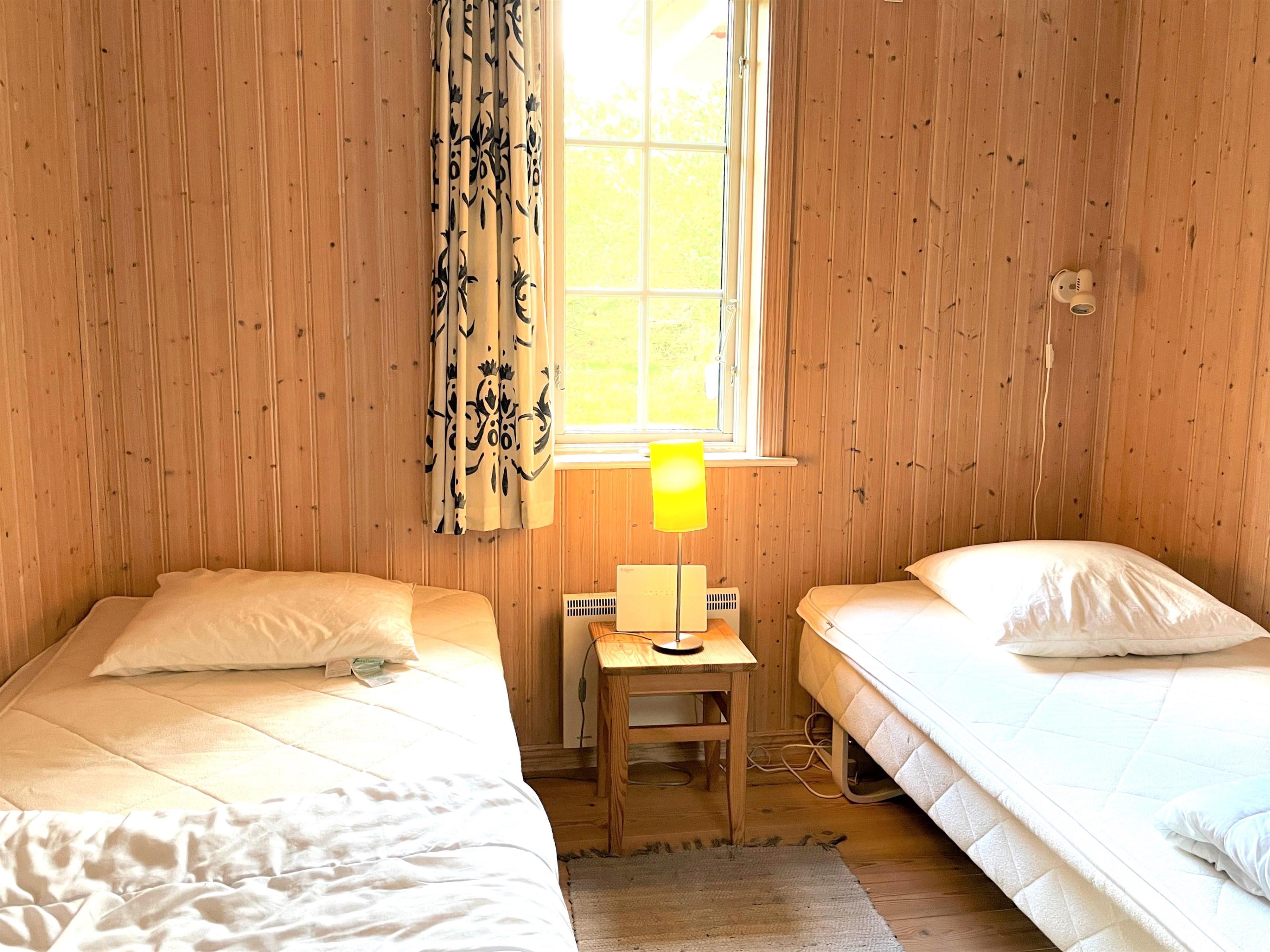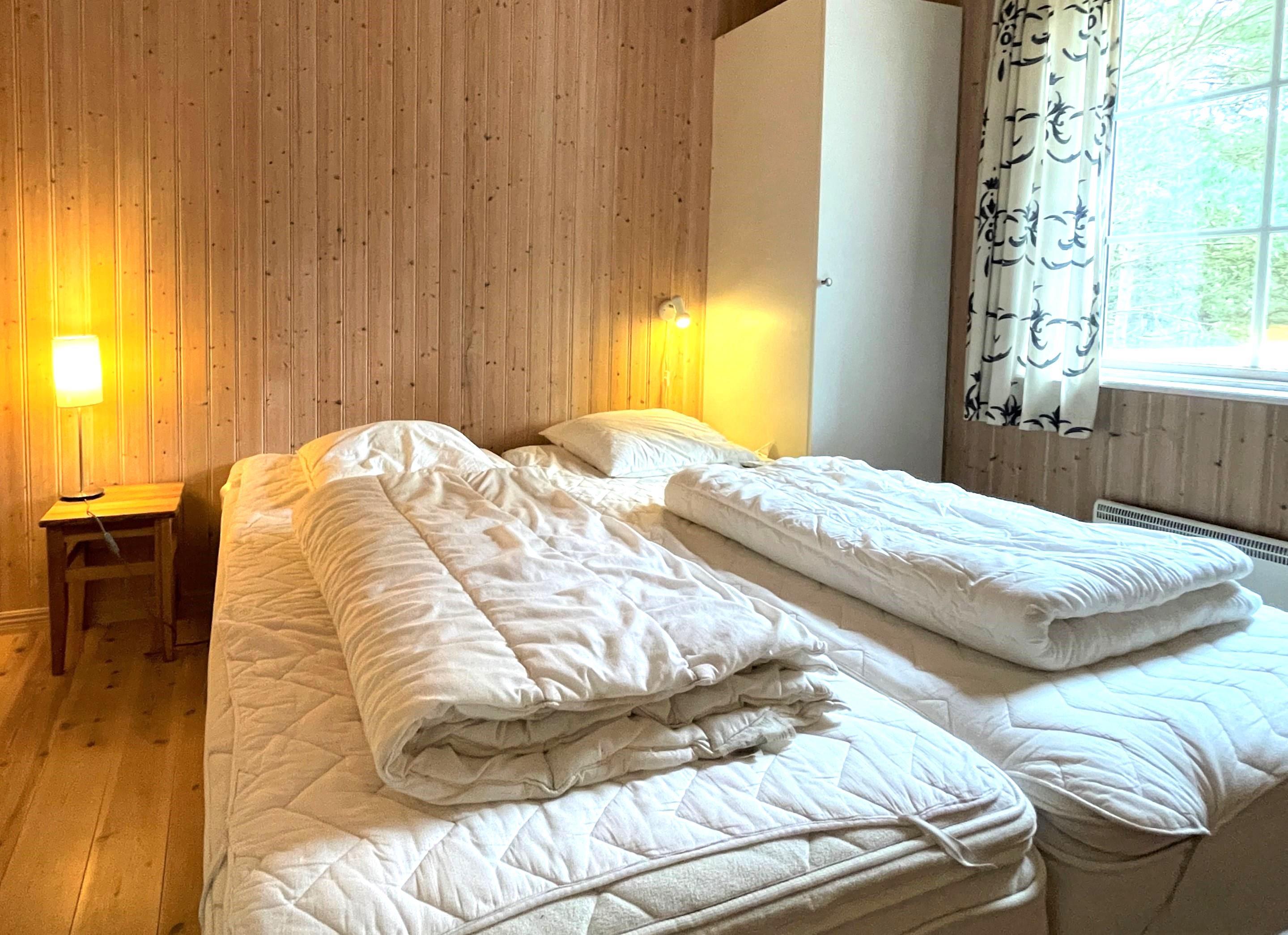 3 værelser, et med dobbeltseng, et med 2 enkelsenge og et med køjeseng. Badeværelse med brus og vaskemaskine.