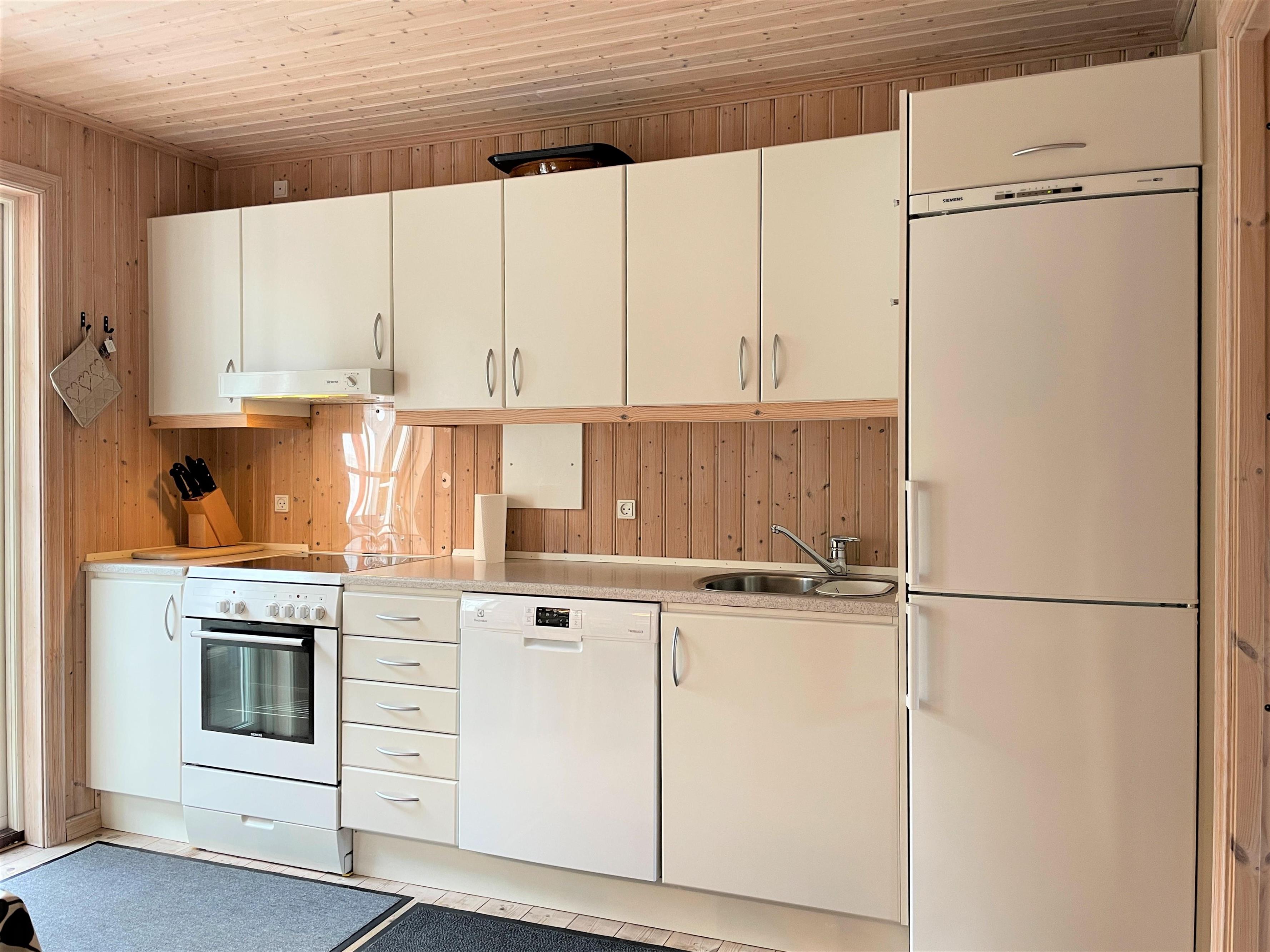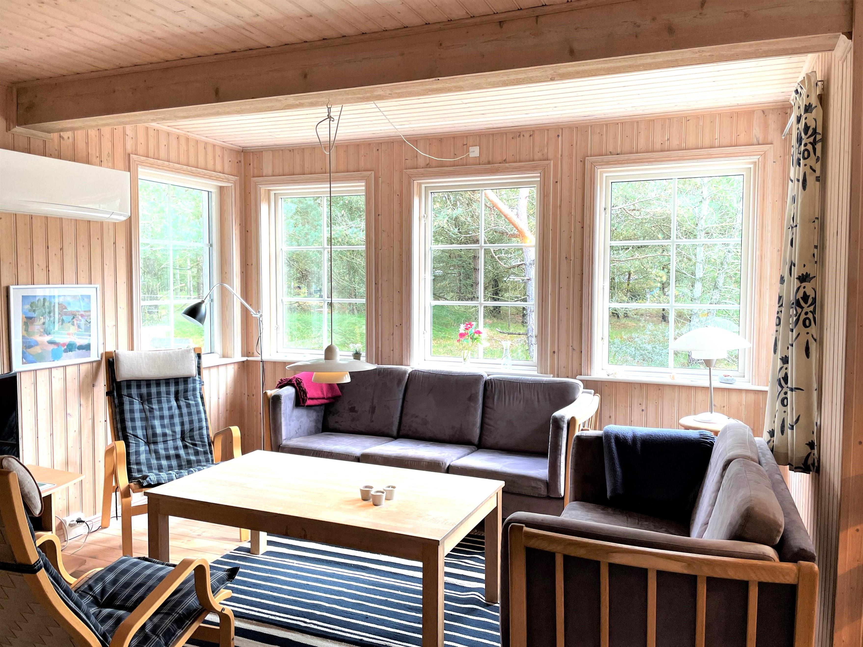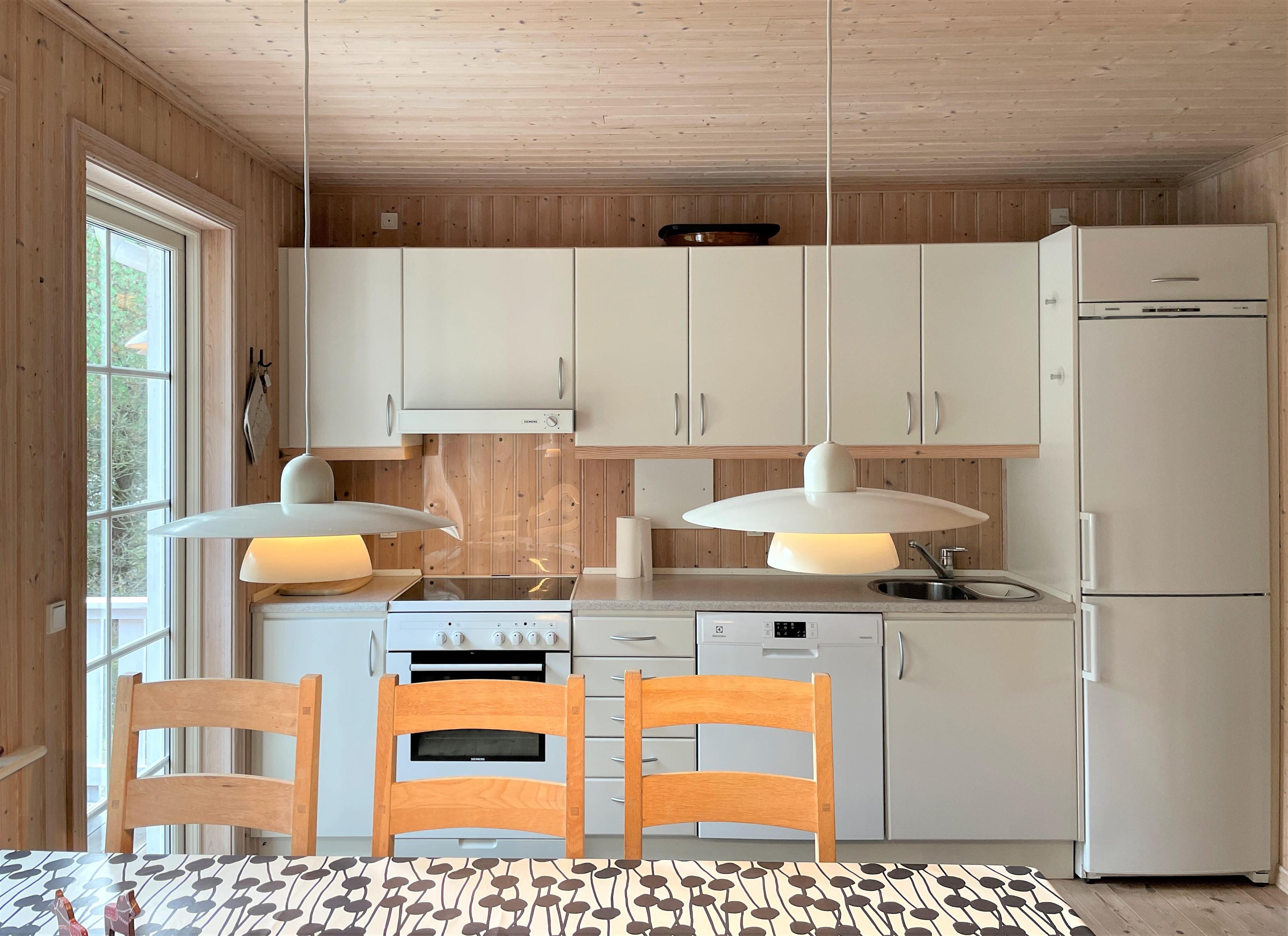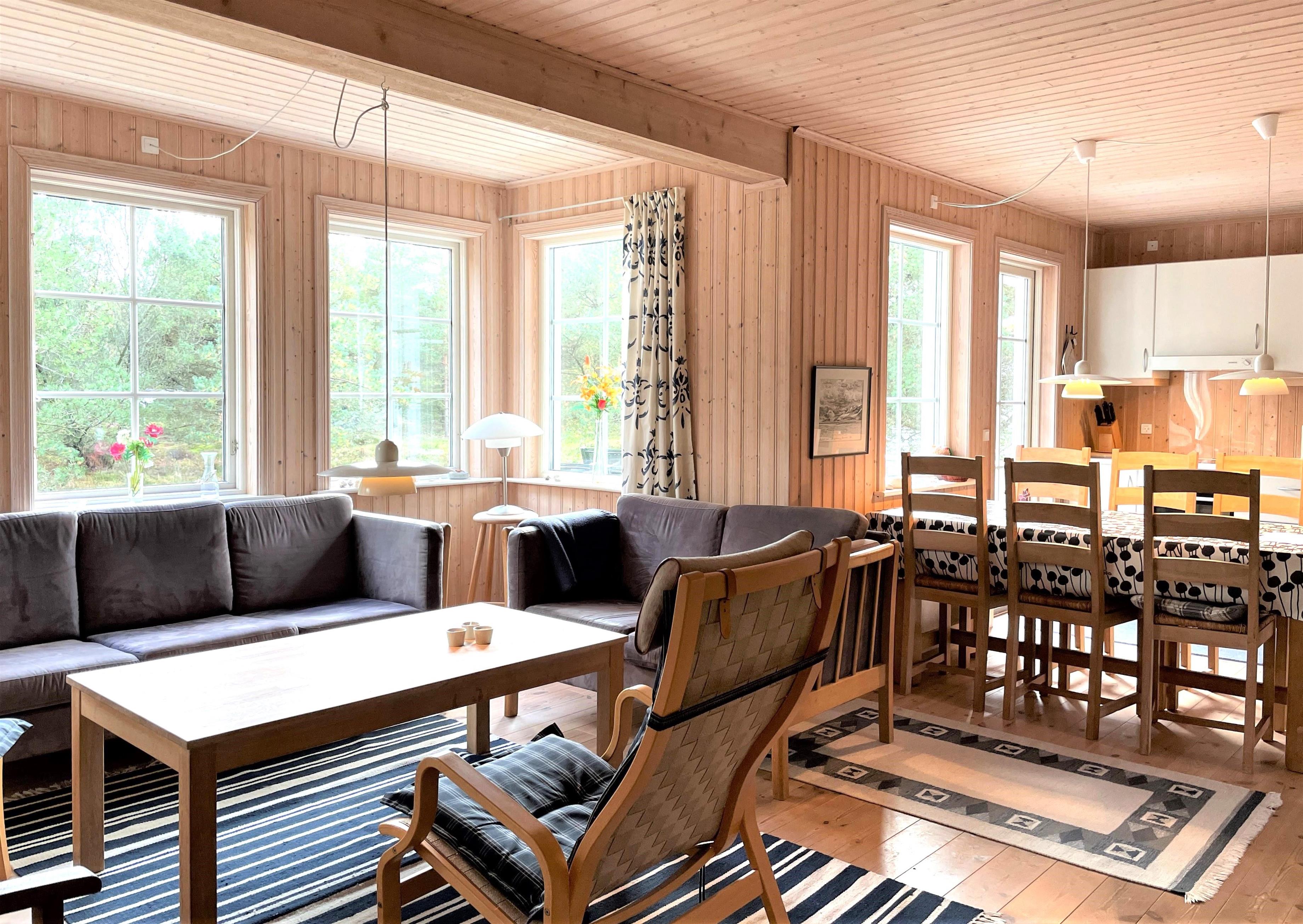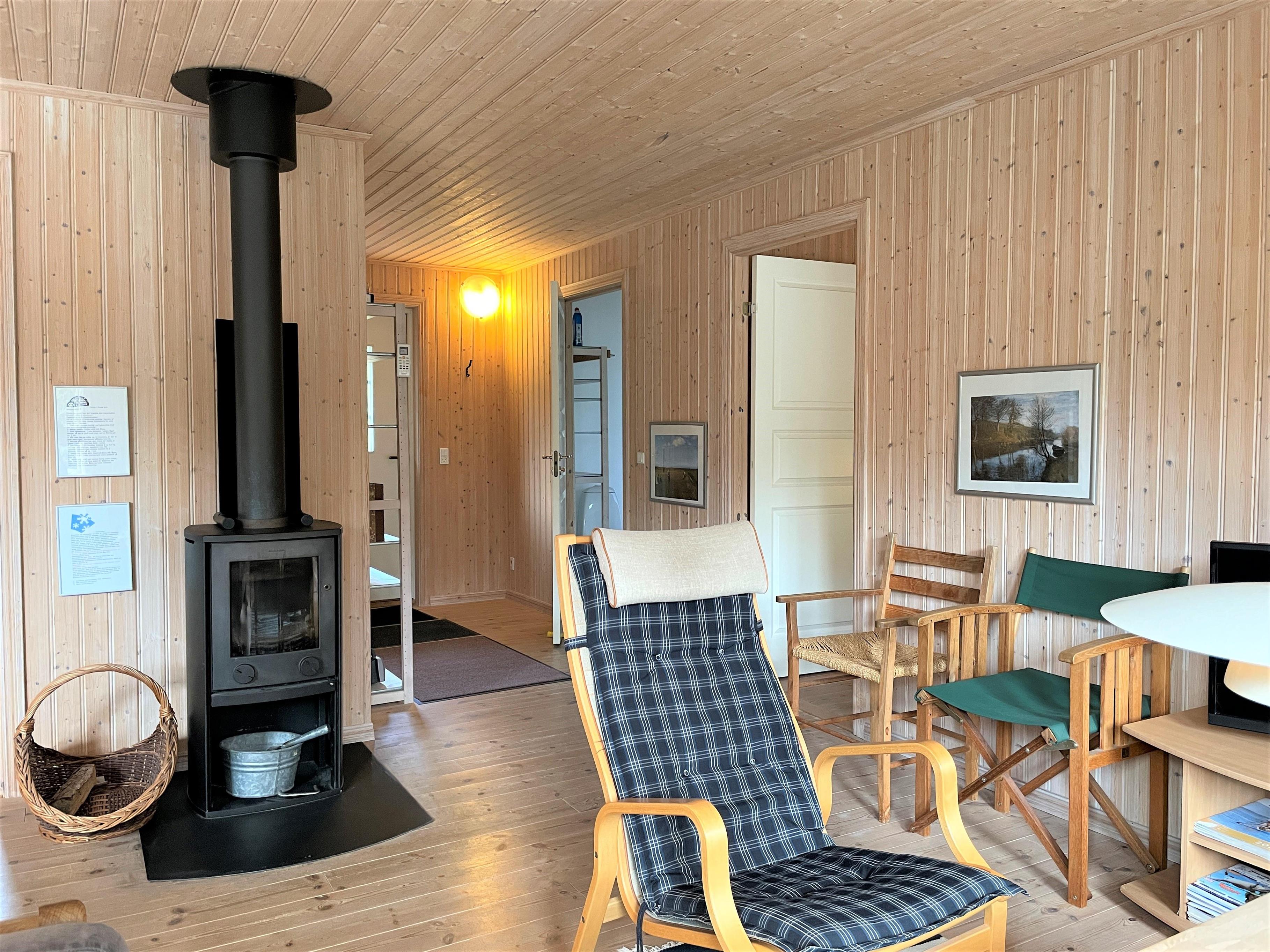 Lyst og praktisk indrettet med behagelige møbler. Stort Køkken/alrum med sofaarrangement og brændeovn.