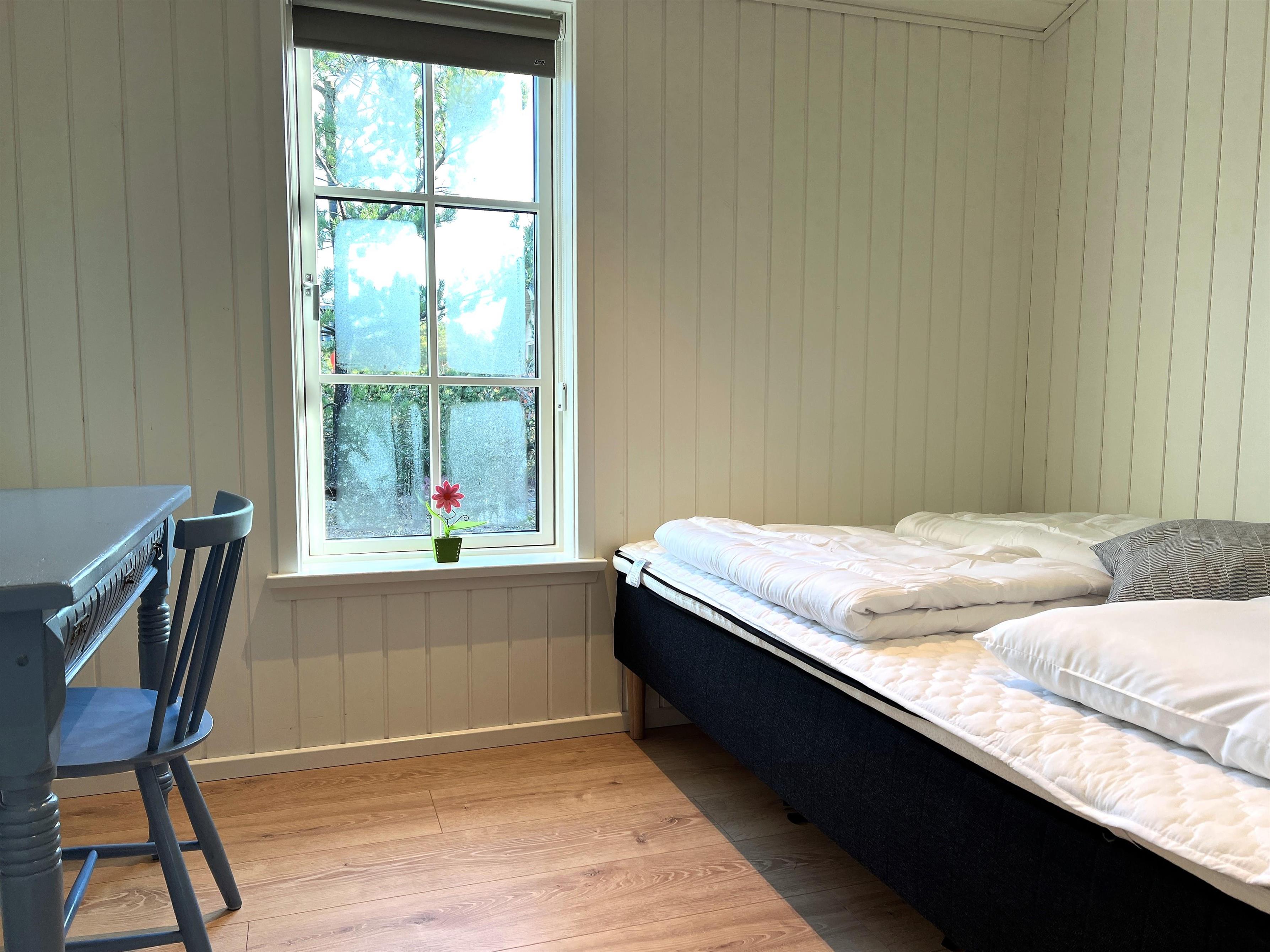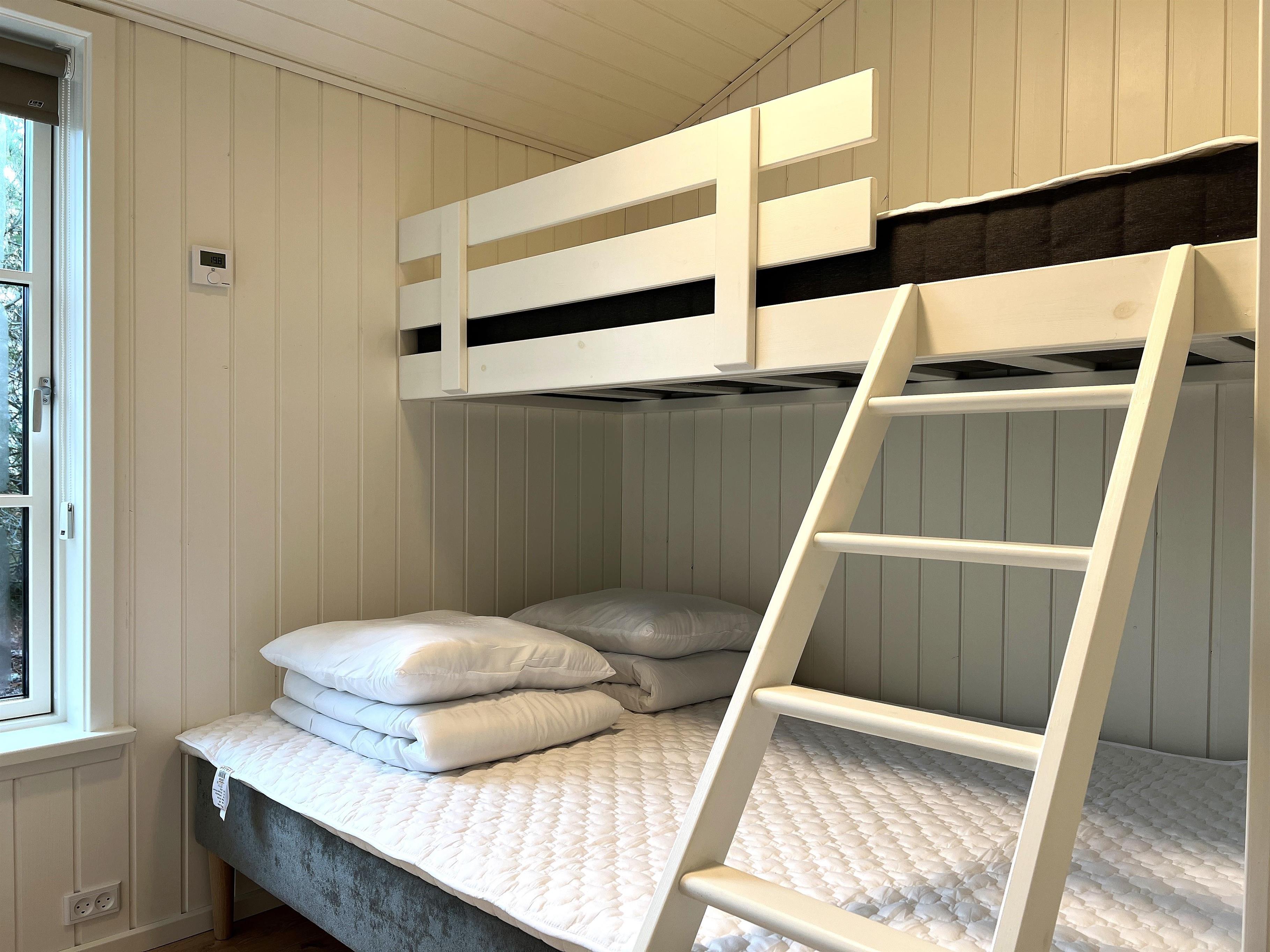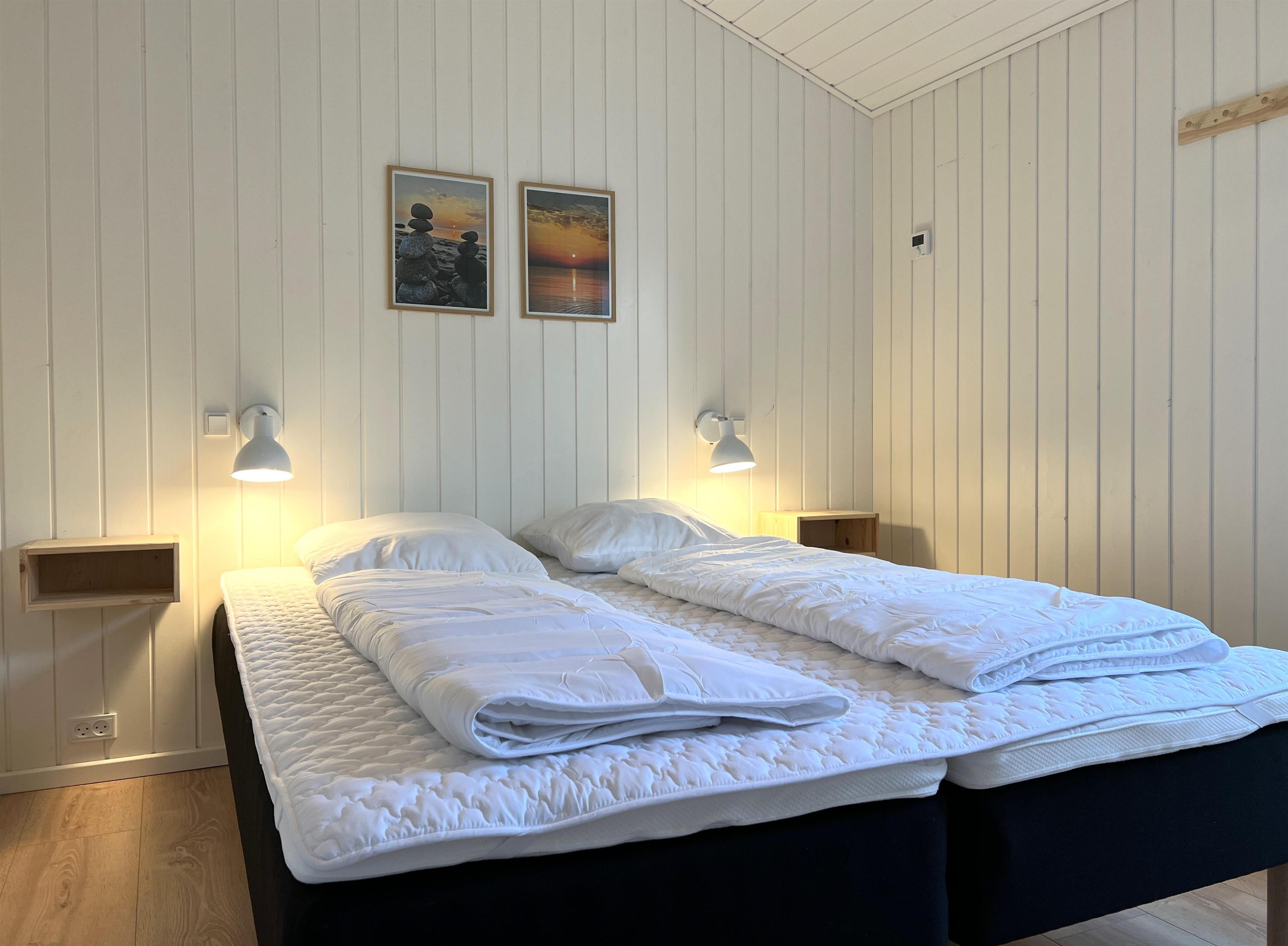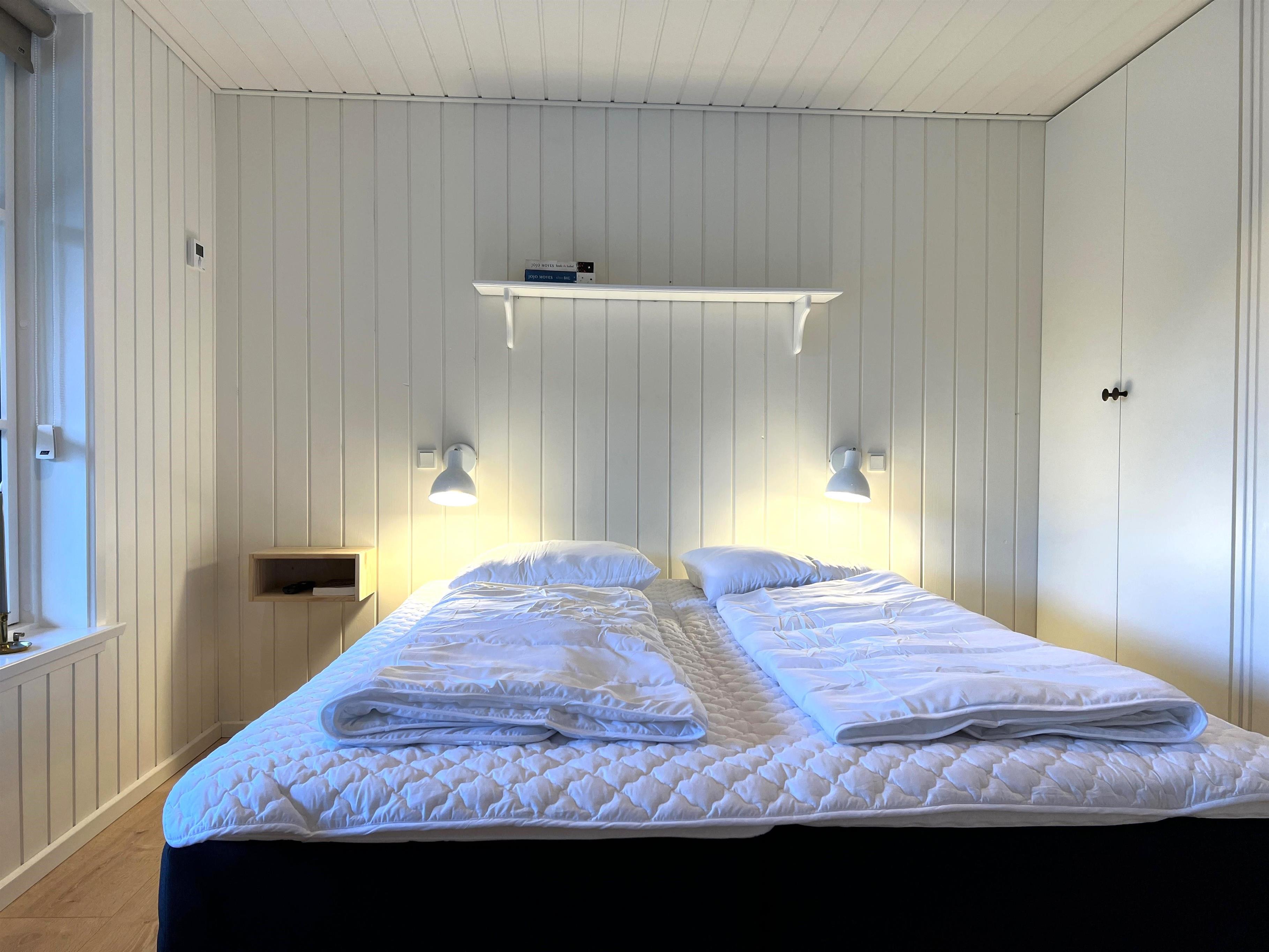 Huset har desuden fire gode soveværelser med skabsplads, og to fine badeværelser med brus, som er praktisk placeret mellem soveværelserne. Tre soveværelser har dobbeltsenge og et værelse har køjeseng med 140 cm. seng nederst. Desuden en hems med to sovepladser til de lidt større børn, hvilket også giver gode fordelingsmuligheder til fx. 2 familier. Et soveværelse har ligesom stuen Smart TV, og der kan streames TV via chromecast. Der er gulvvarme i hele huset opvarmet med luft/vand anlæg, som er billigt i forbrug. Fra det ene badeværelse er der udgang til lukket træterrasse med udebruser. Rundt husets imponerende træterrasse er der gode havemøbler, loungemøbler samt solsenge. På terrassen findes også husets grill, og de to terrassevarmere, placeret på terrassens overdækkede dele, forlænger de lyse sommeraftener. Ved parkeringspladsen er der monteret el-ladestation. Et splinternyt utrolig skønt og gennemført feriehus med gåafstand til Østerbys hyggelige havnemiljø med indkøbsmuligheder, fiskehandler og restauranter.
