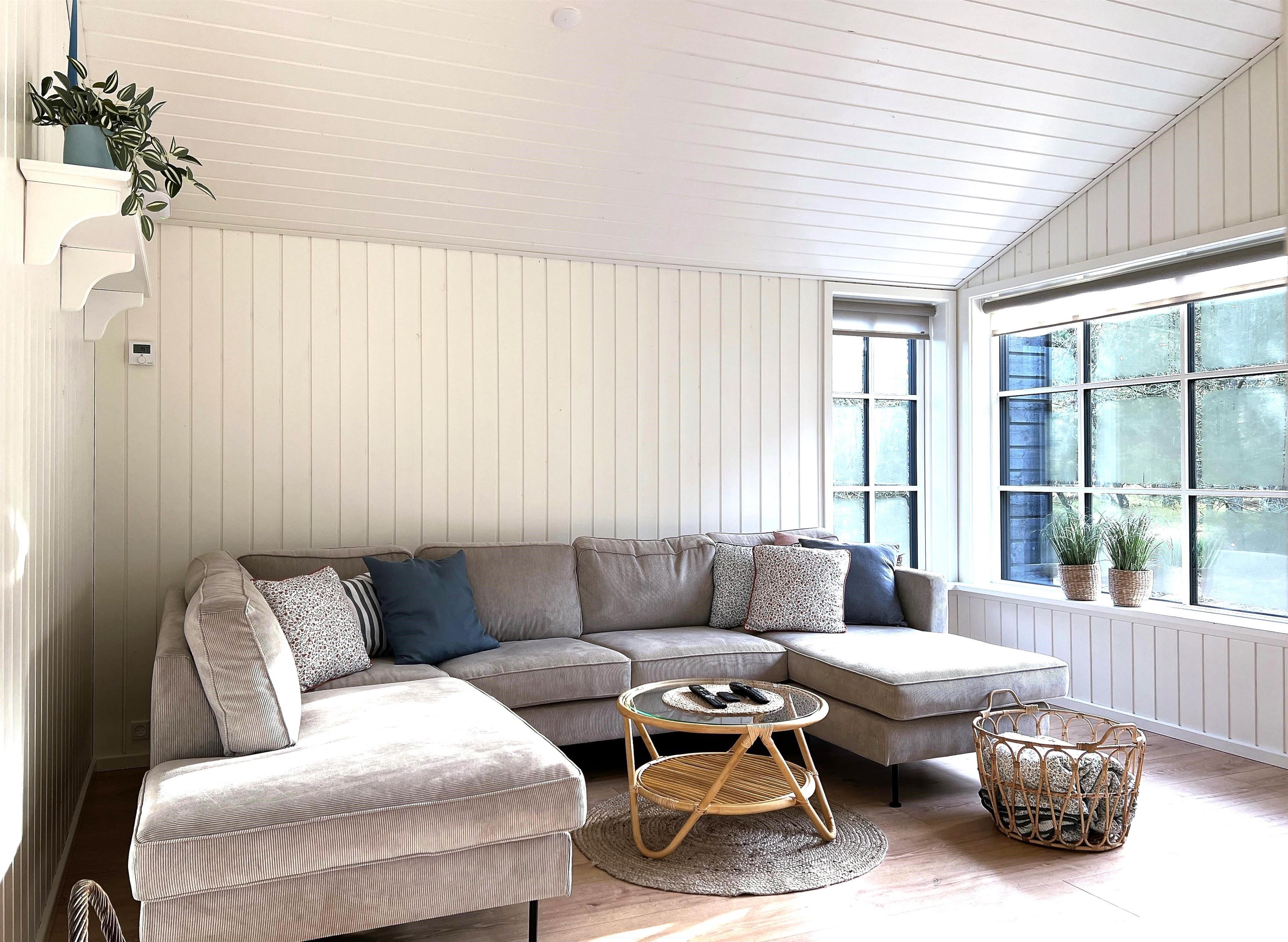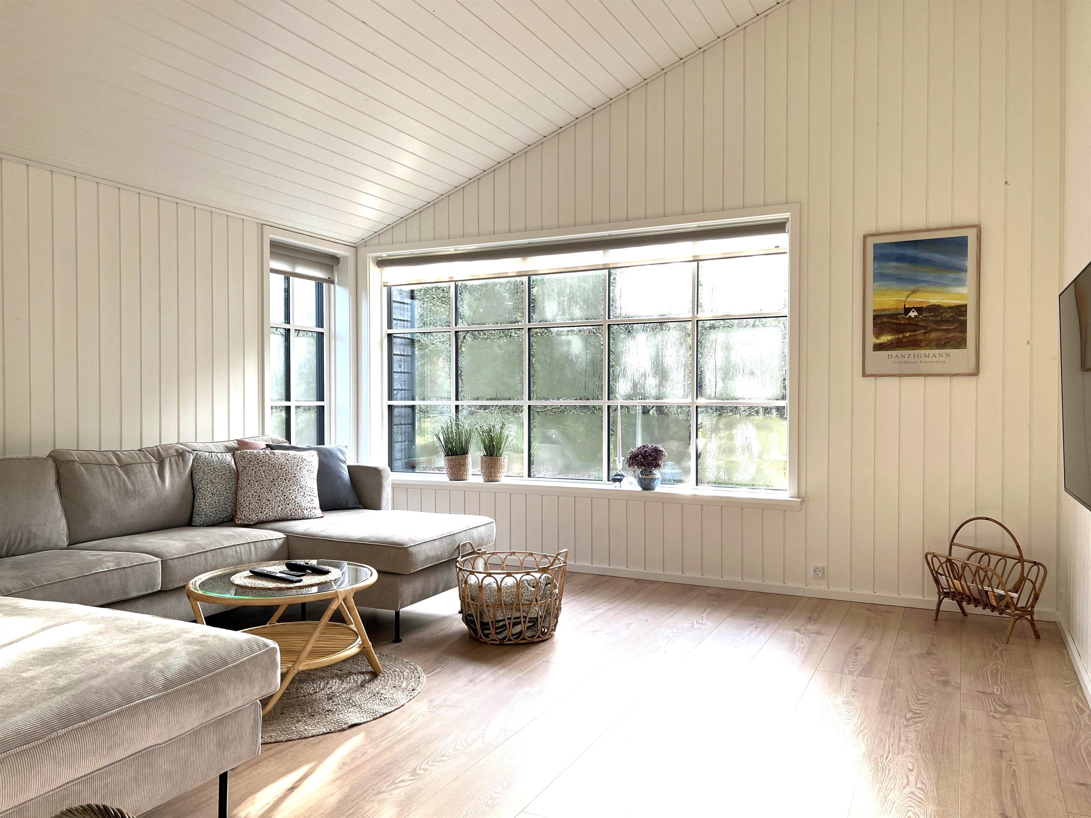 Der er to udgange til husets imponerende 118 kvm store træterrasse. Rummelig, lys stue med Smart TV og behagelige møbler.