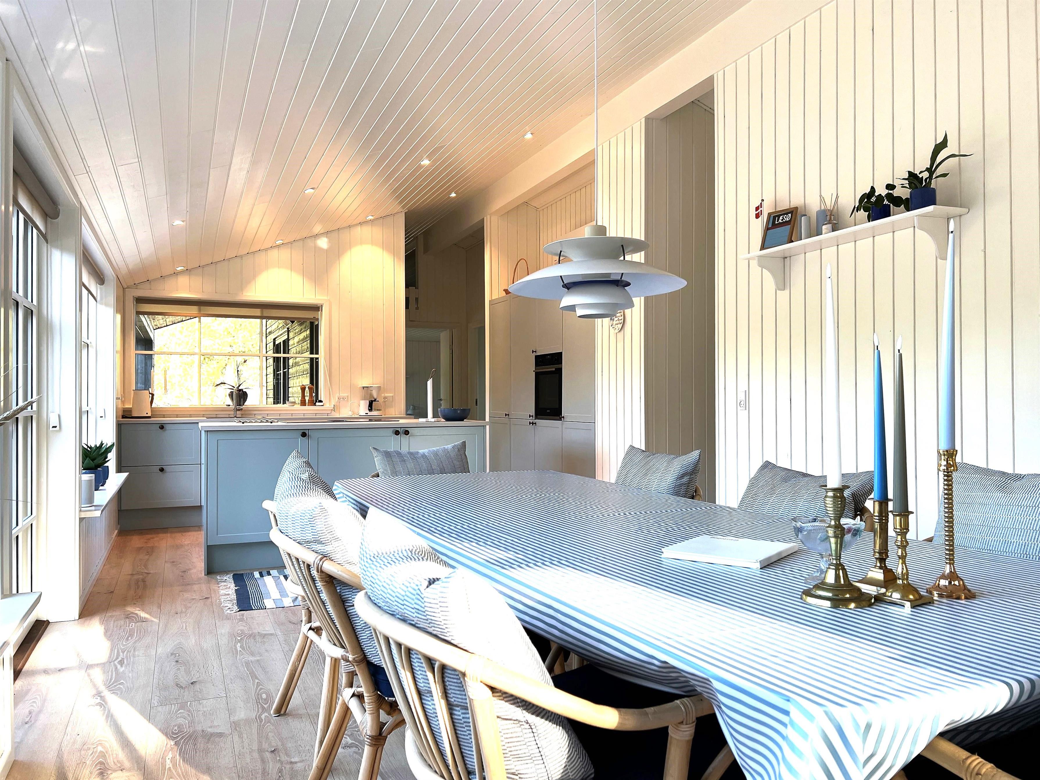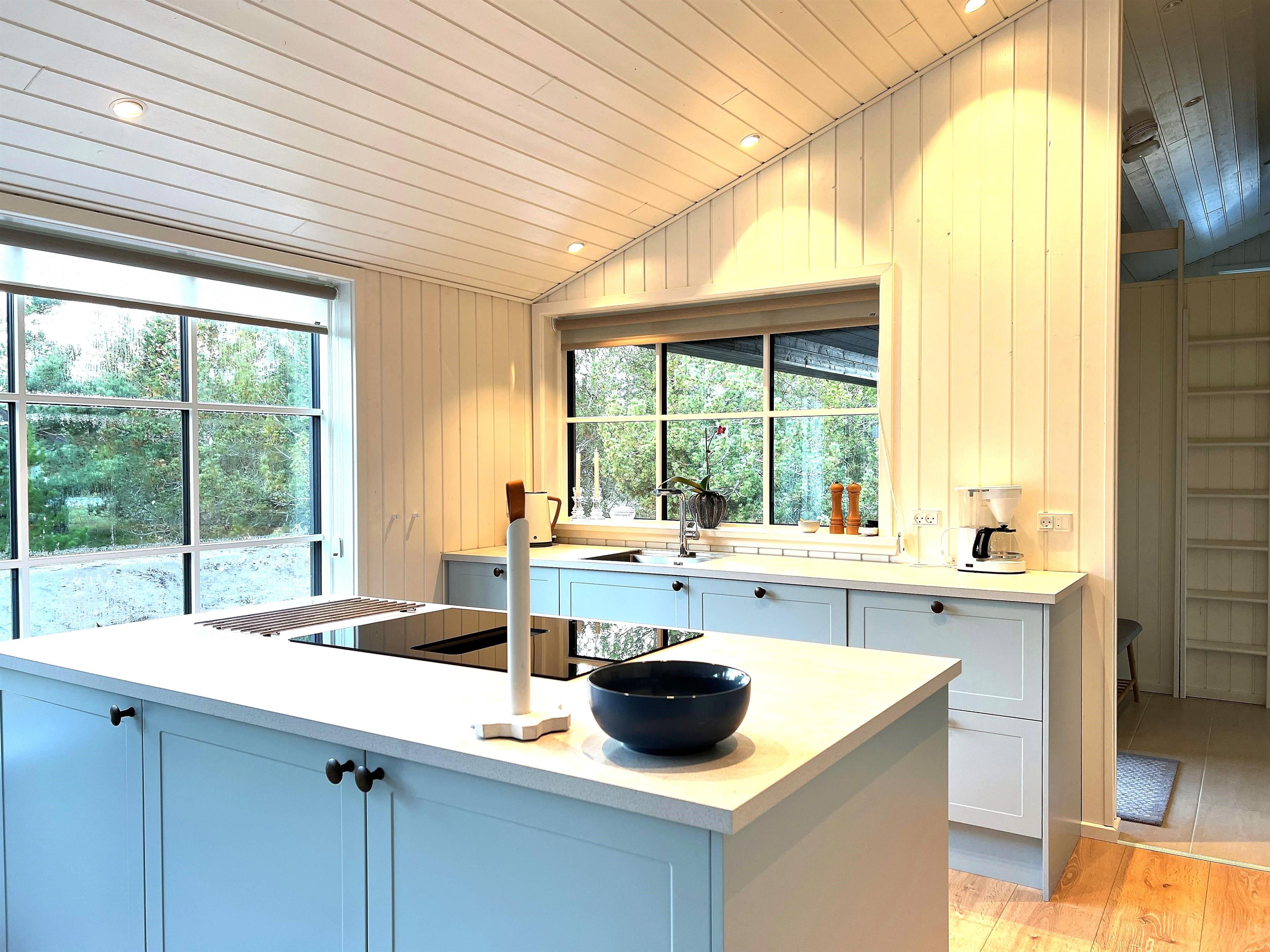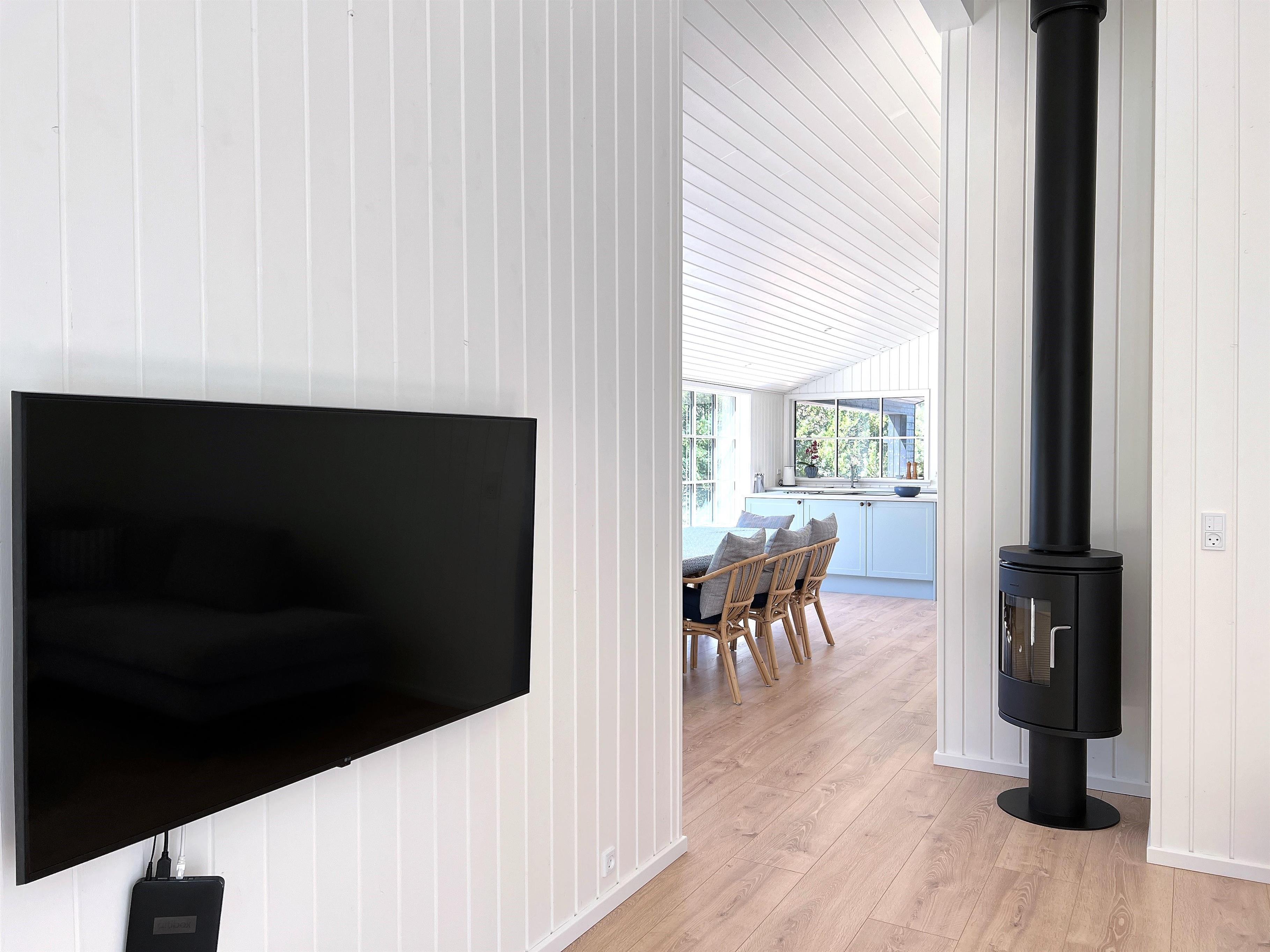 Feriehuset fremstår særdeles indbydende, og der er rigtig mange moderne detaljer. Lysindfaldet fra de flotte store vinduespartier er smukt og bringer nærmest naturen indenfor. Alle rum er forsynet med moderne variabelt lys/spot og opvarmes med moderne energivenligt varmeanlæg med luft/vand over hele huset. I stuen kan man endvidere benytte brændeovnen.