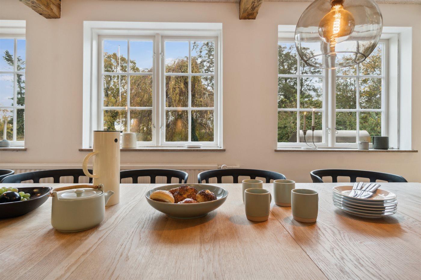 Det nye store køkken giver da også løfter om, at madlavningen kan være praktisk og kan forberedes sammen med familien - der er bare god plads. Med en større spisestue virker det næsten højtideligt ved det lange flotte bord - efter maden kan man trække ind i den hyggelige opholdsstue eller måske endda ud i udestuen, hvor de mange større vinduer giver de bedste udsigtsmuligheder.