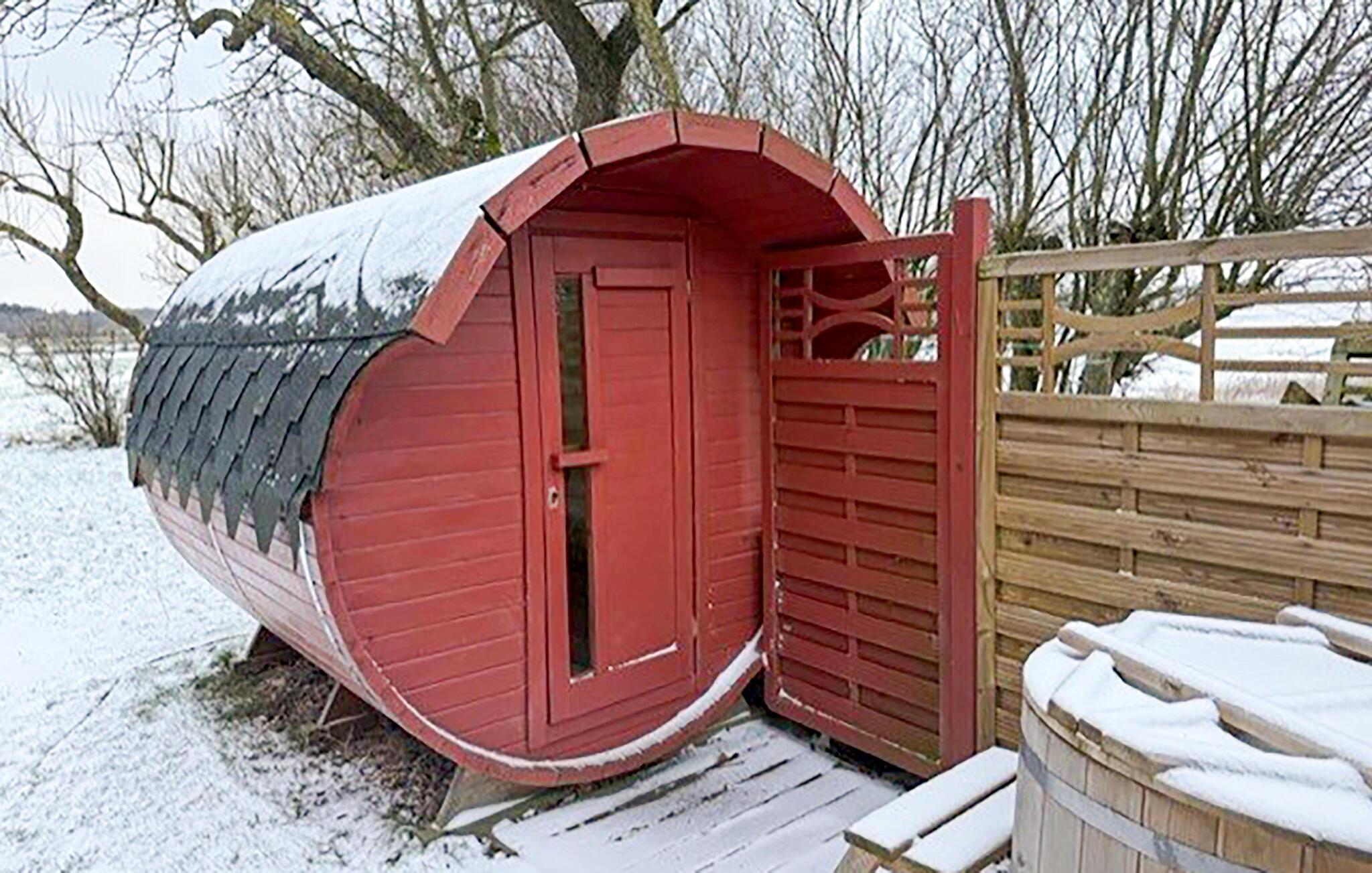 Foruden et fuldt udstyret køkken, kan I tilberede maden udendørs, hvor der både er fælles grill og pizzaovn. Når menuen står klar, kan I sætte jer til rette på den overdækkede terrasse og nyde udsigten til det rolige område.