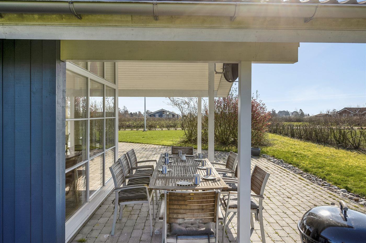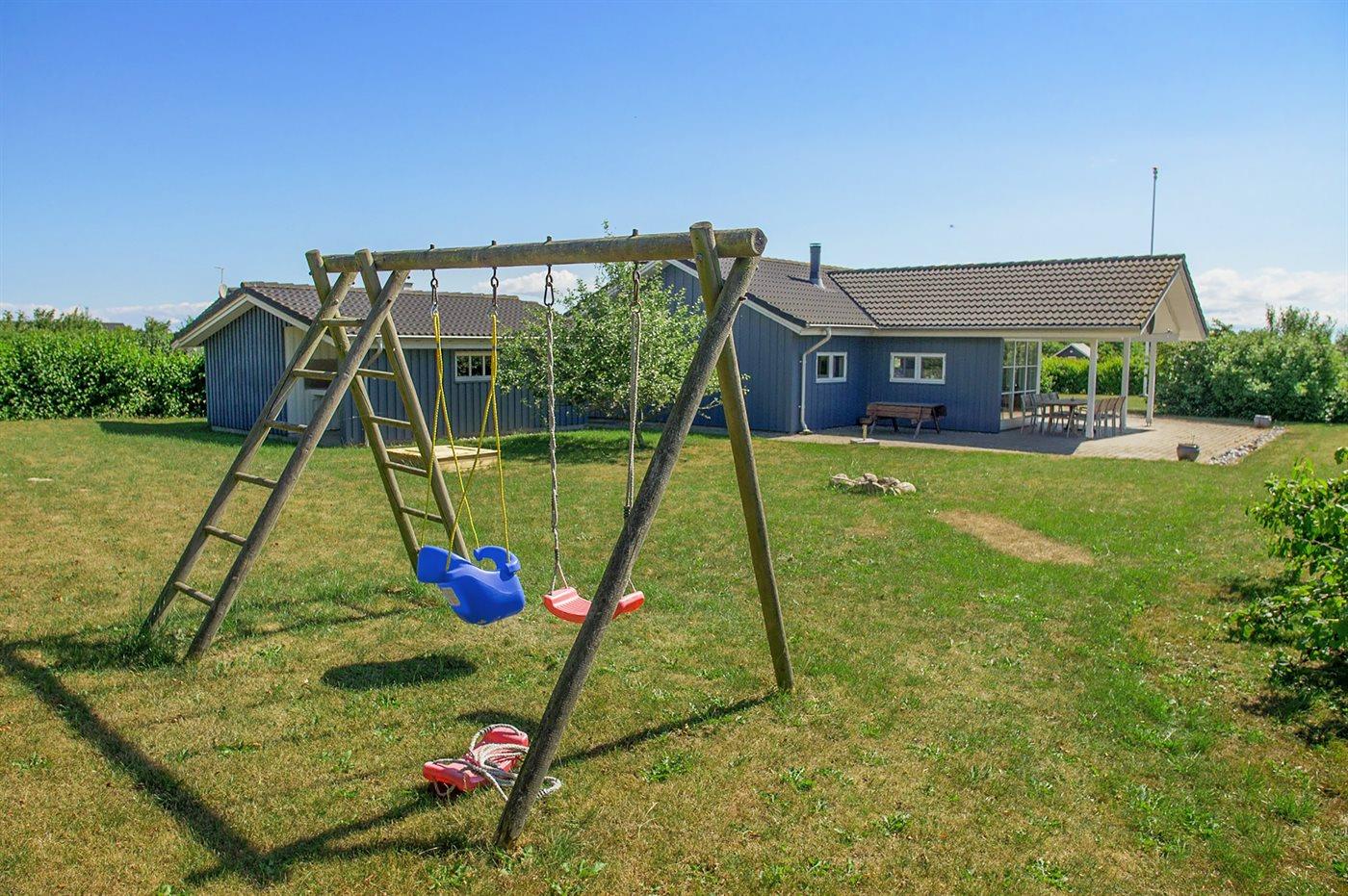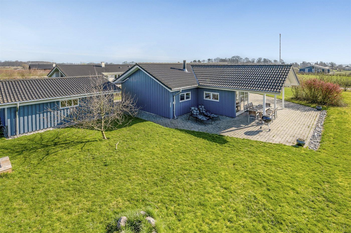 Ferieboligen er beliggende på en 1208 m² stor havegrund. Der er 600 m til havet. Nærmeste forretning er beliggende i en afstand af 6000 m. Der er en golfbane i en afstand af 2000 m. Til ferieboligen hører 50 m² terrasseareal. Desuden er der 20 m² overdækket terrasse. Ligeledes er der adgang til udestue. Gynge. Sandkasse. Grill til rådighed. Udendørs fiskerenseplads med bord og vask. Der er carport til rådighed. Parkering ved ferieboligen.