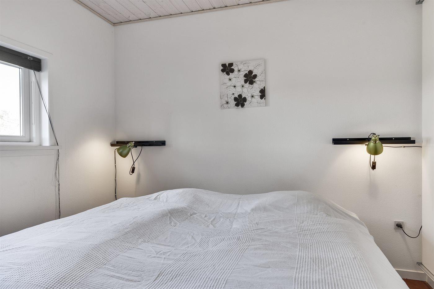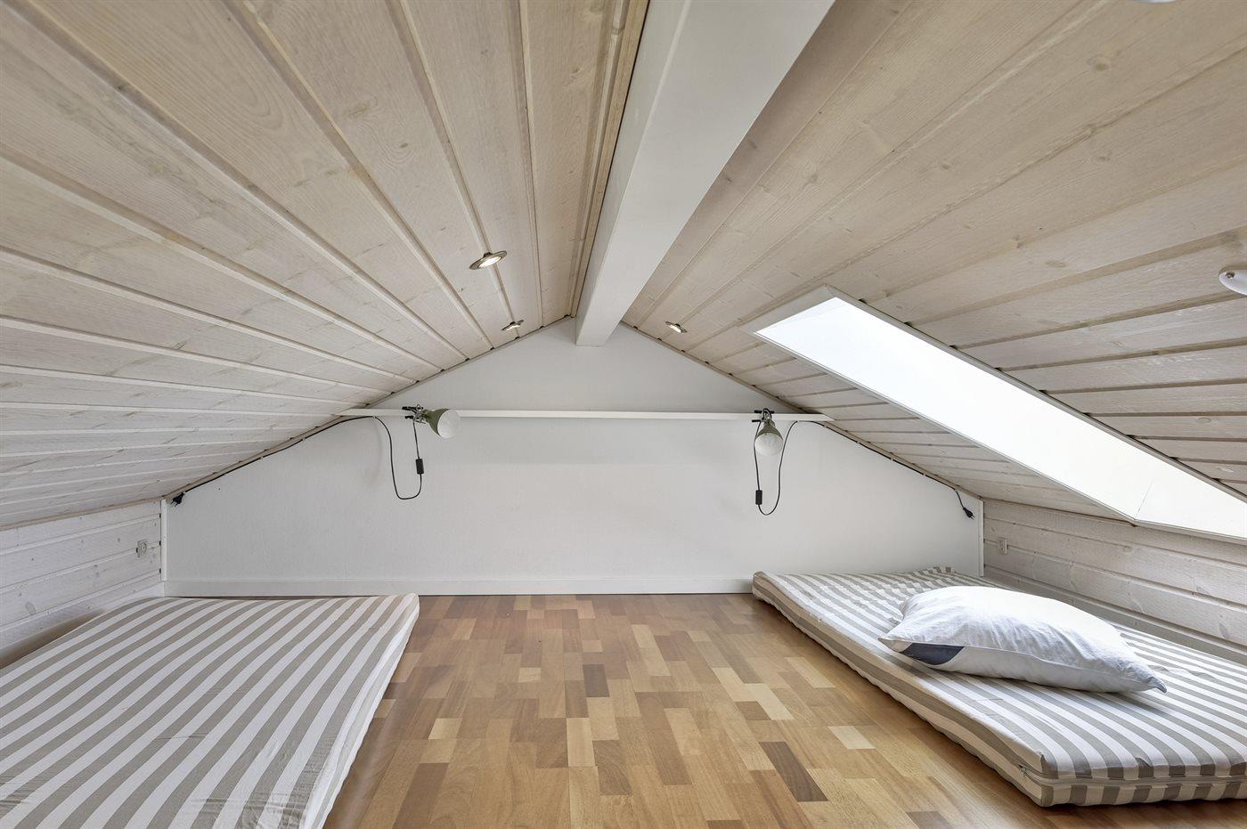 Der er i alt 3 soveværelser. Sovepladserne fordeler sig på: 4 sovepladser i dobbeltsenge. 2 sovepladser i enkeltsenge. 2 sovepladser på madrasser. 2 af disse sovepladser befinder sig på husets hems. Derudover er der 1 stk. barneseng.